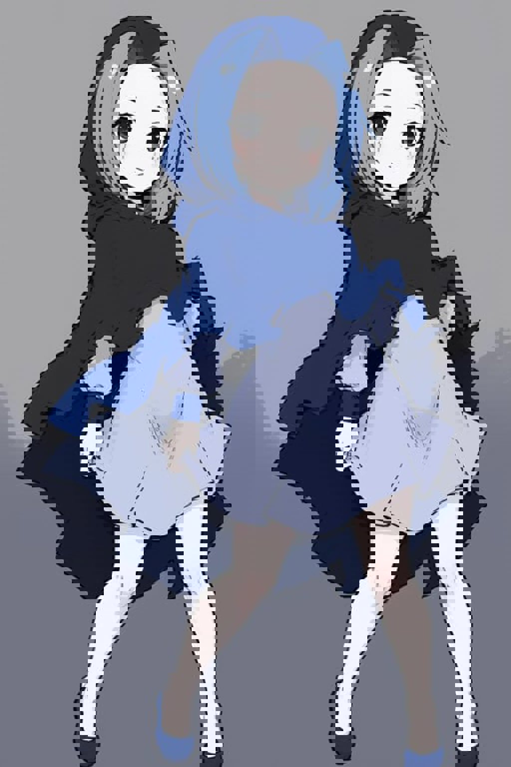 KOMUGIKO,black eyes,light blue bungs,intake bungs,forehead, putting on a blue hood,blue cape,light blue dress,