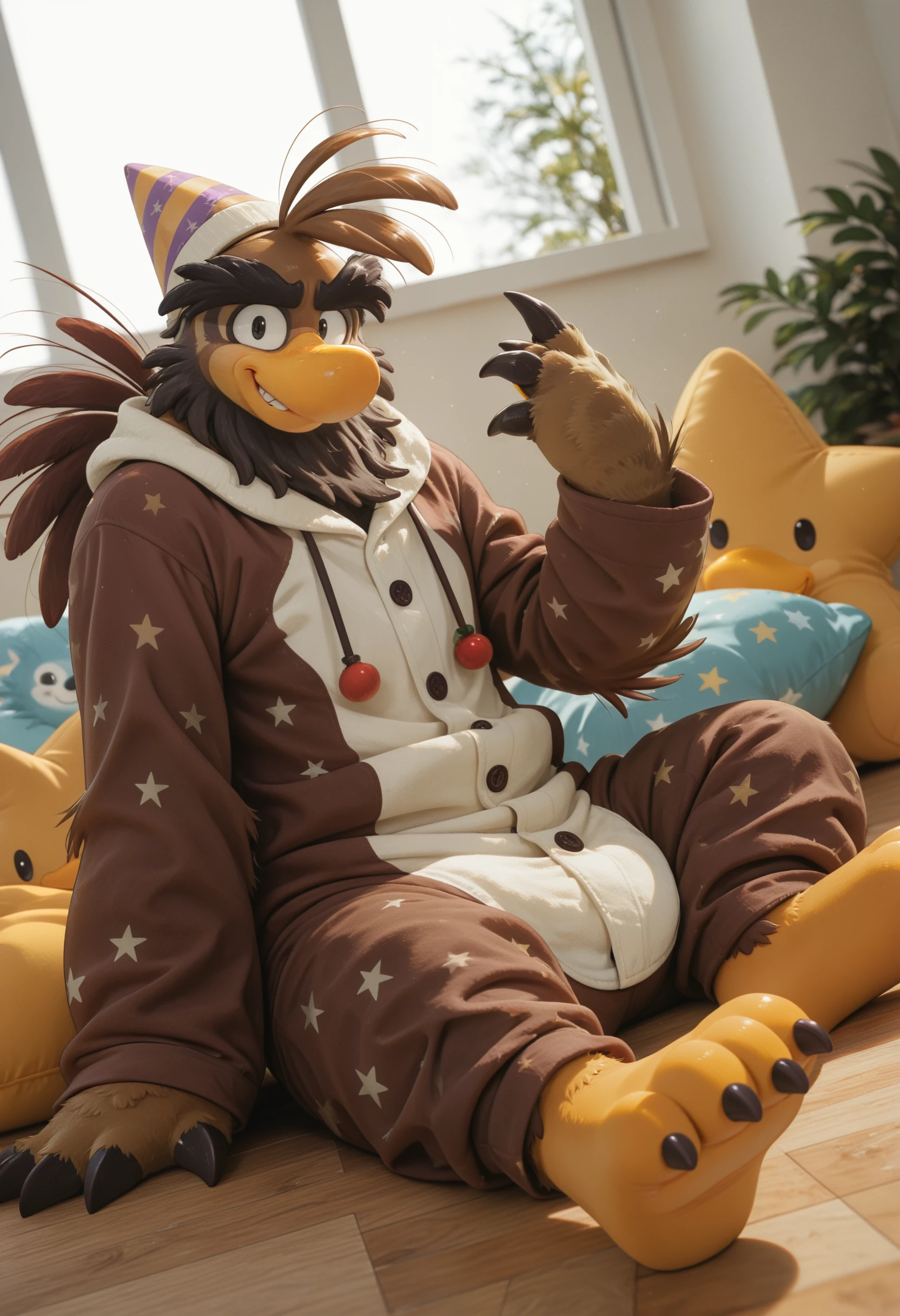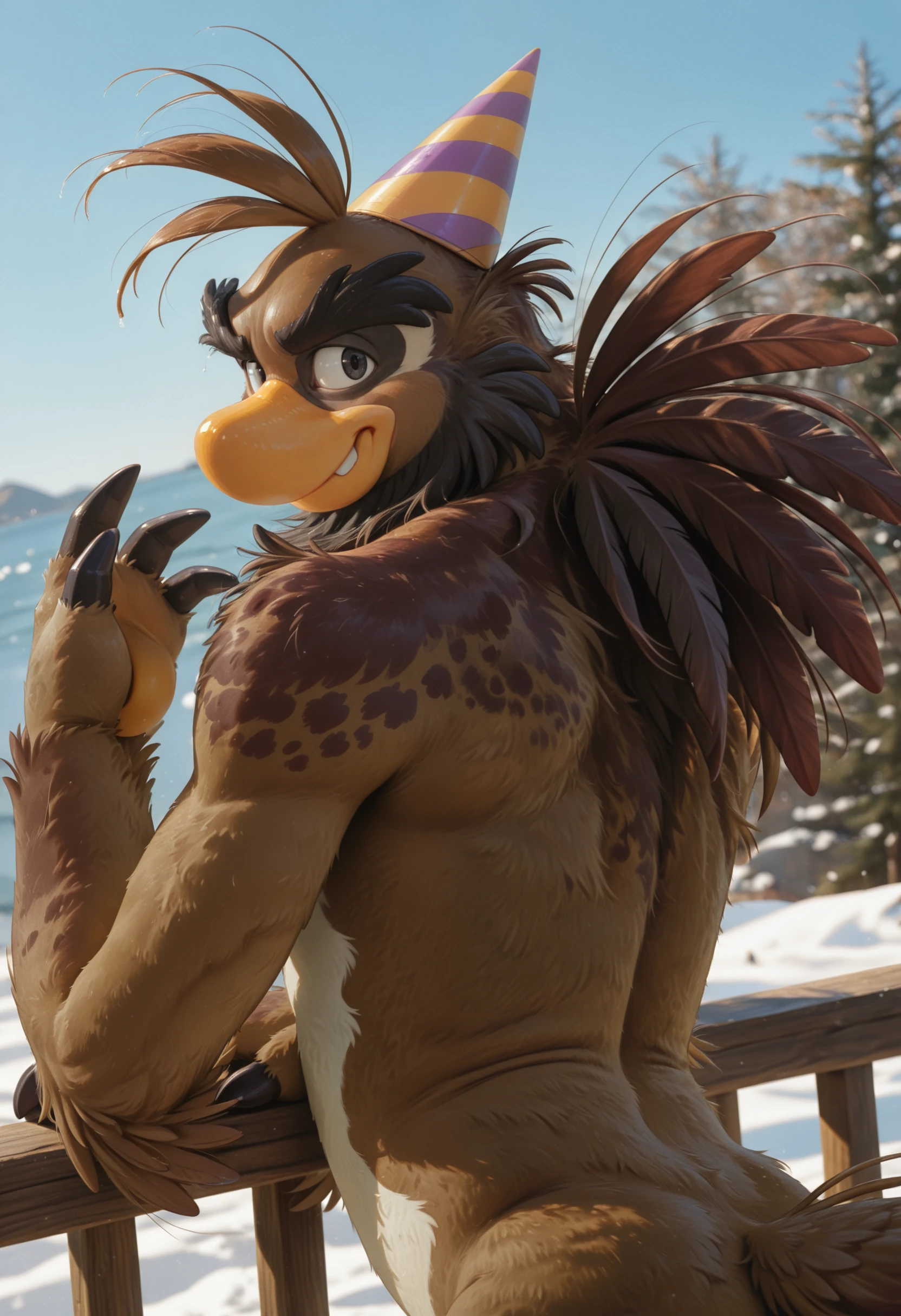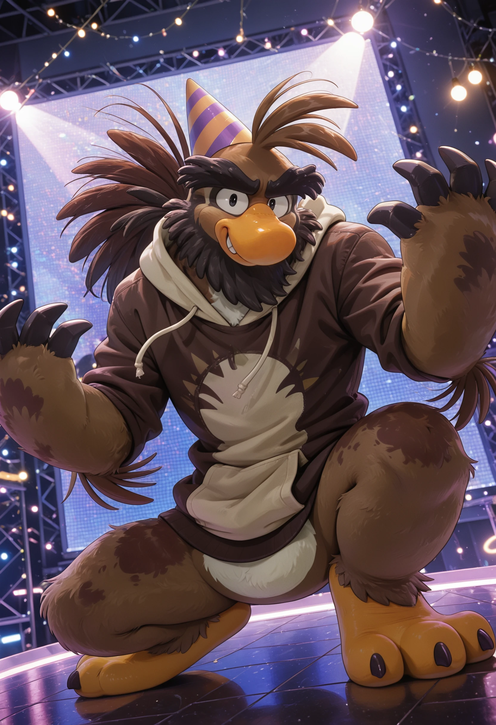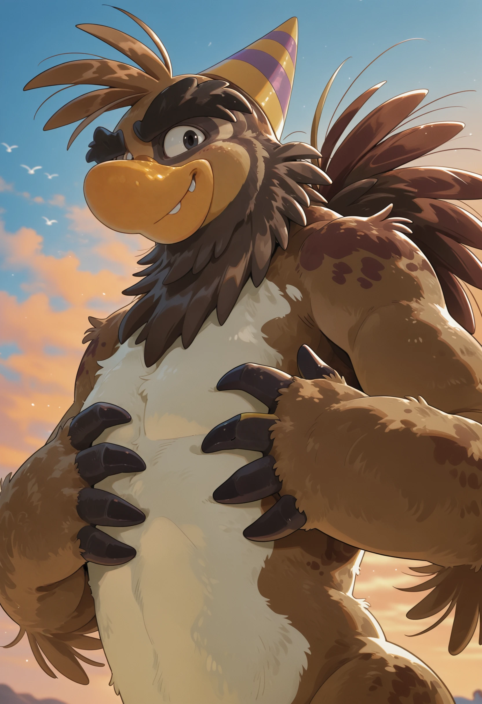 sam_the_sasquatch, penguin, avian, party hat, anthro, no humans, talon hands, bird, male, beak, solo, male focus, brown body, feathers, mammal, black eyes, furry, hi res, looking at viewer, short legs