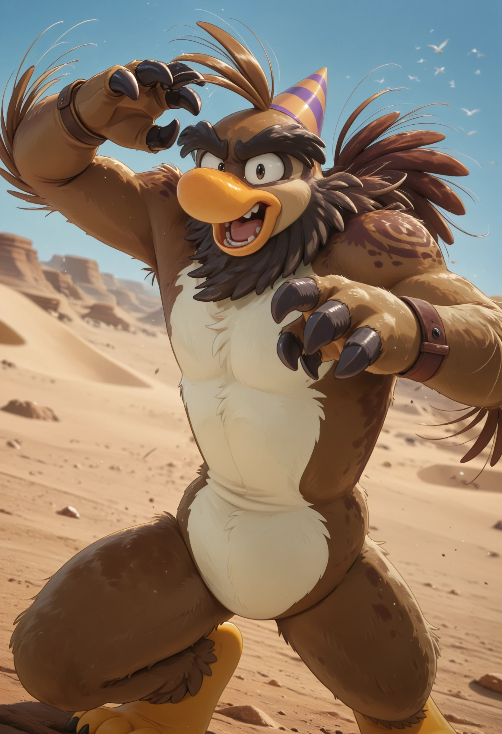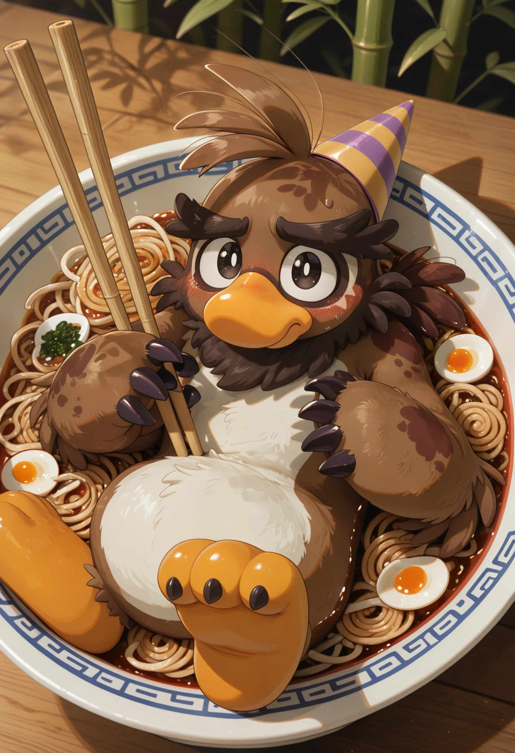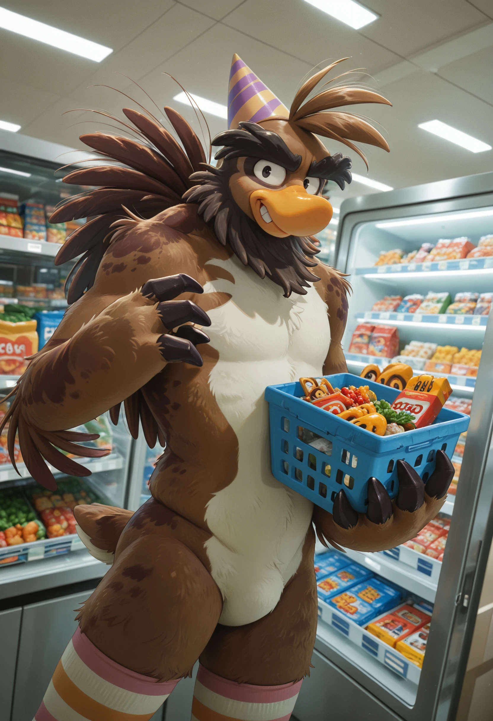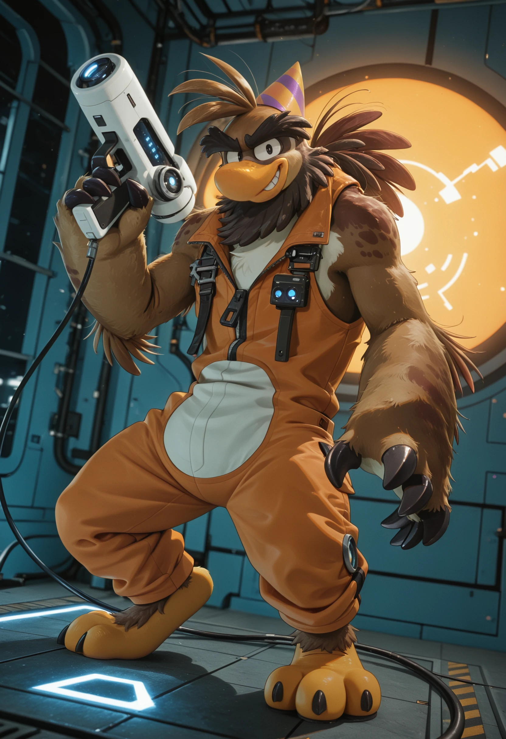sam_the_sasquatch, penguin, avian, party hat, anthro, no humans, talon hands, bird, male, beak, solo, male focus, brown body, feathers, mammal, black eyes, furry, hi res, looking at viewer, short legs