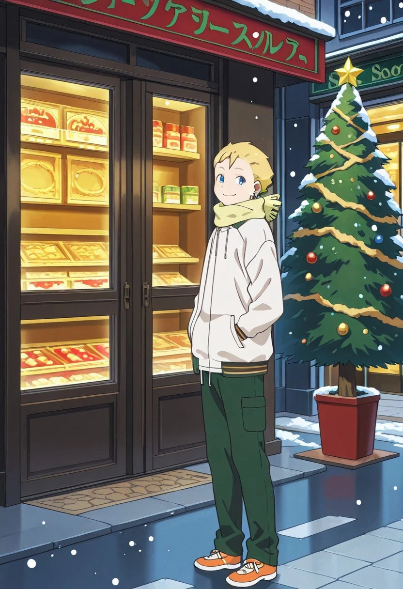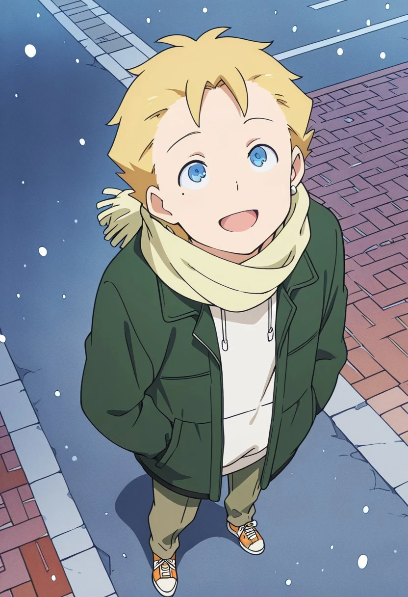 orange and white sweatshirt, yellow scarf, green pants, white and orange shoes