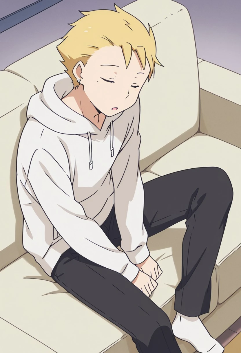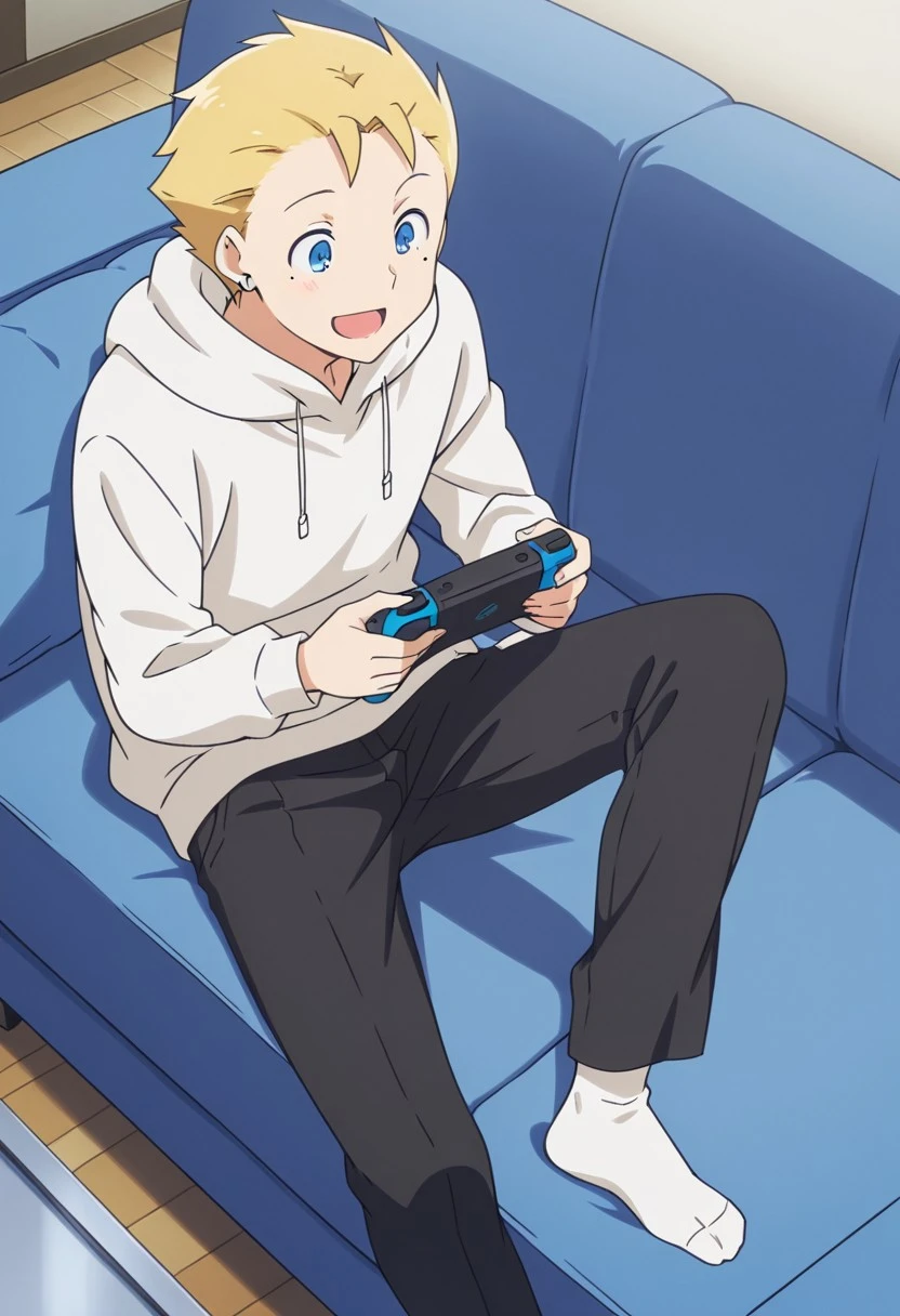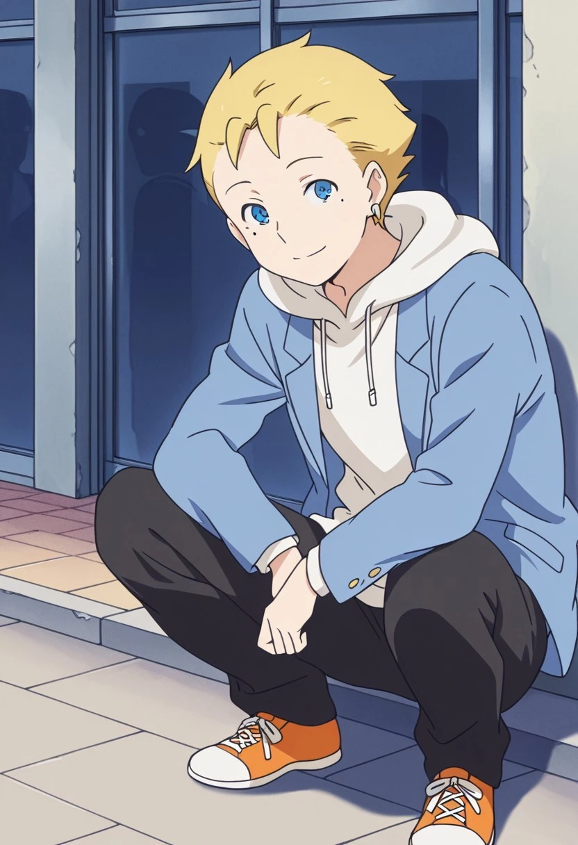 Chizuru, male_focus, blond hair, blue eyes, mole, earring