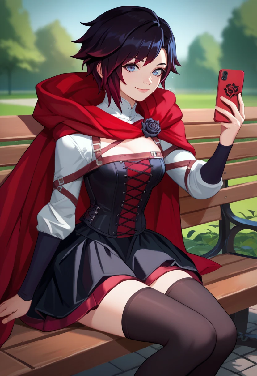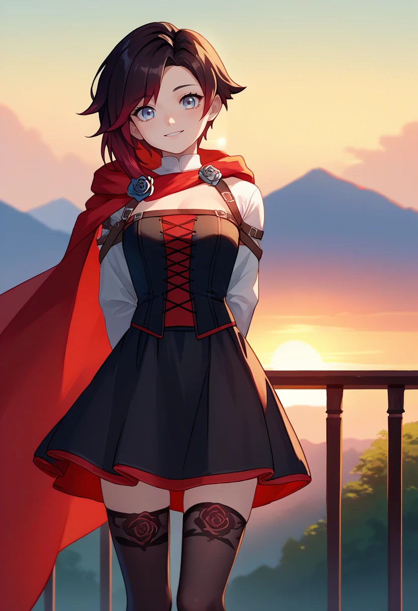 red cape, black dress, corset, white shirt, long sleeves, black skirt, black thighhighs, bandolier