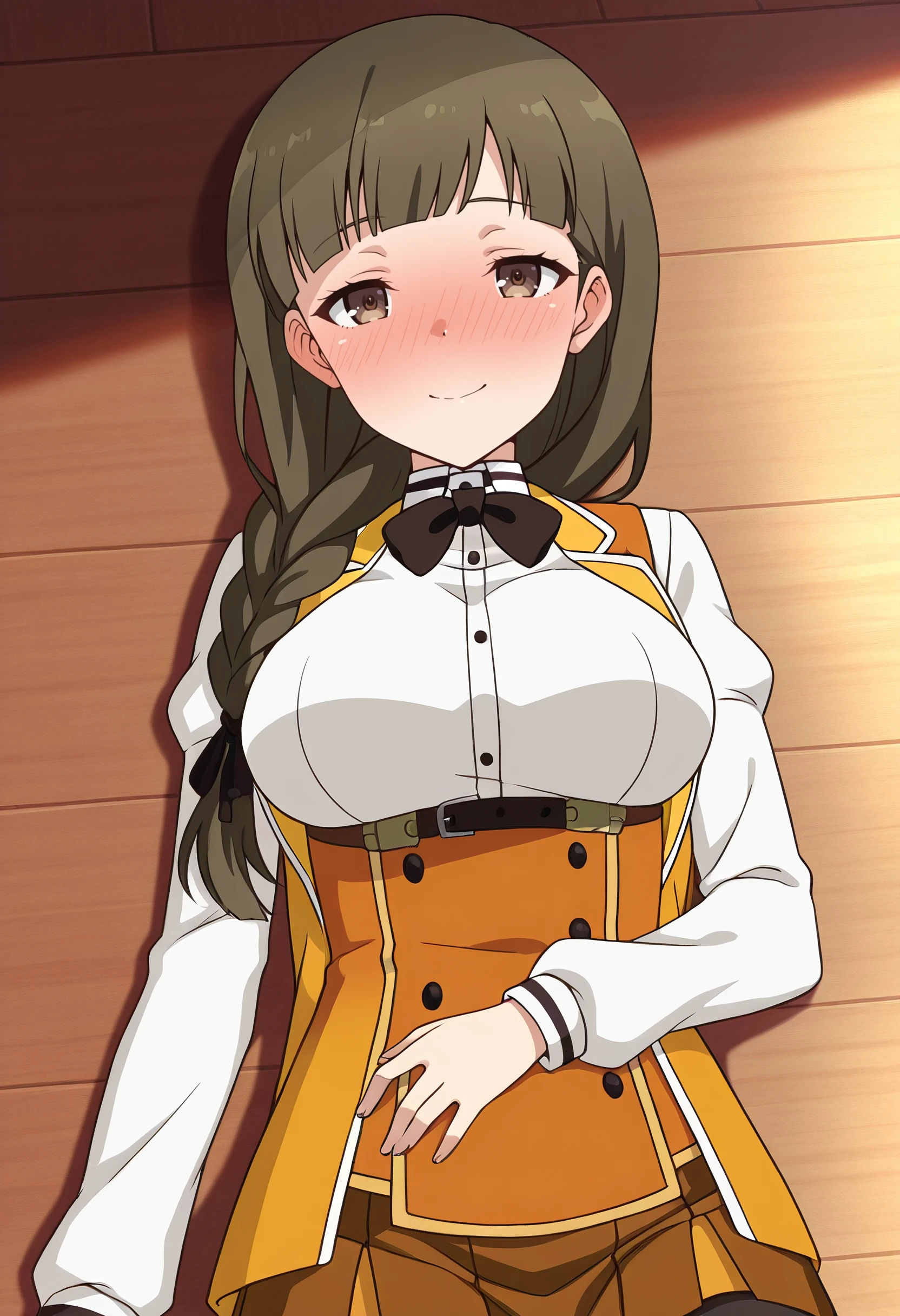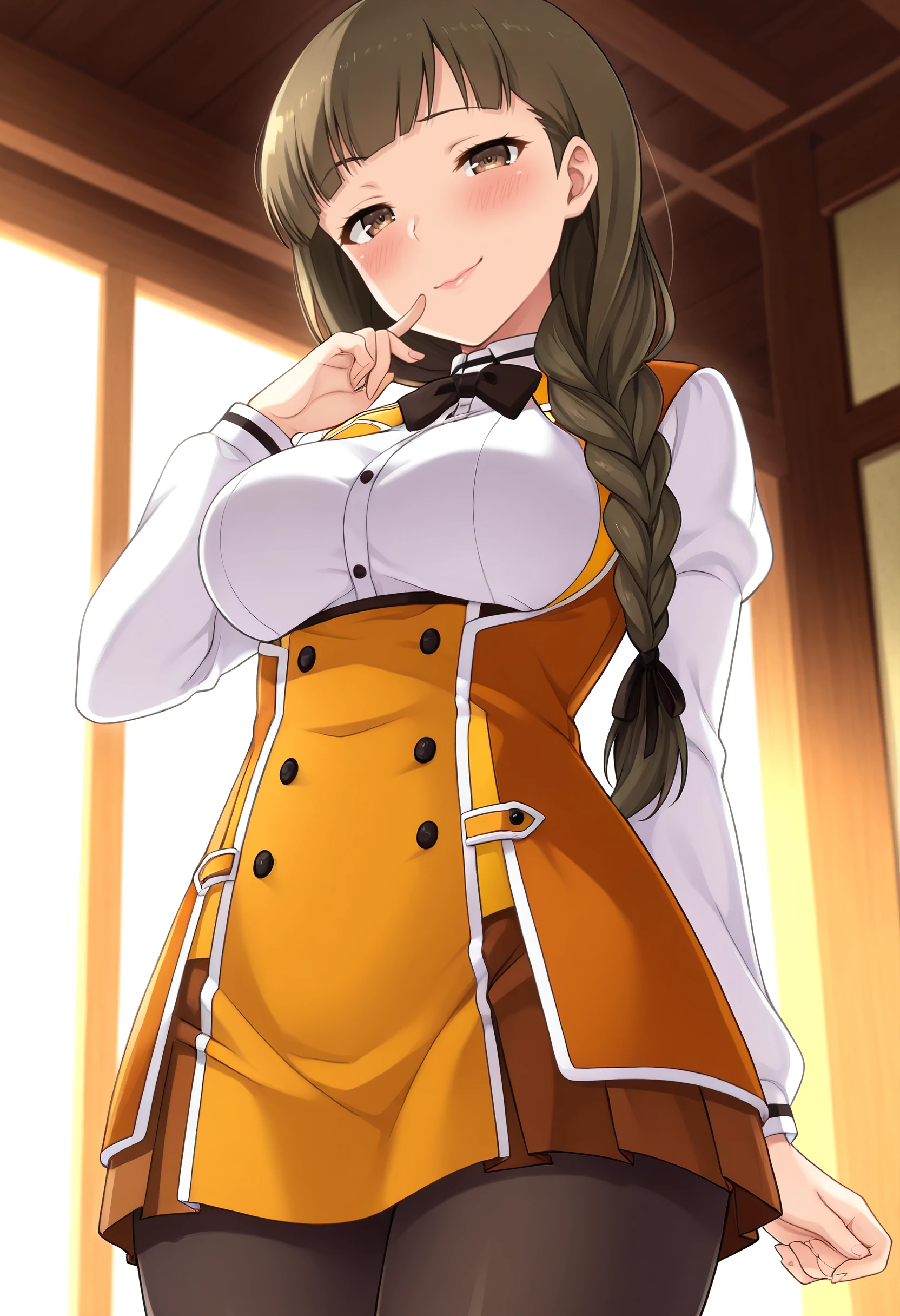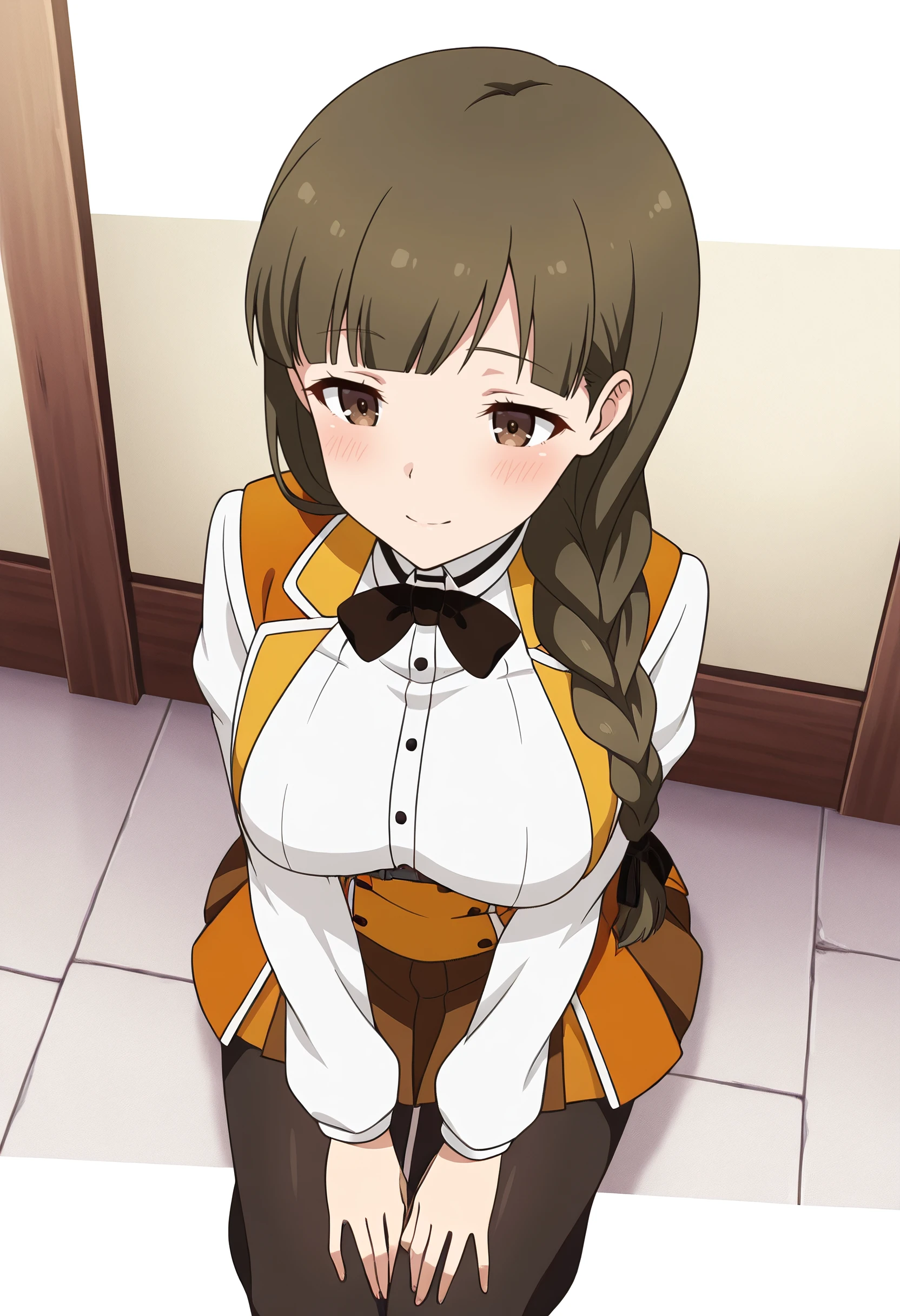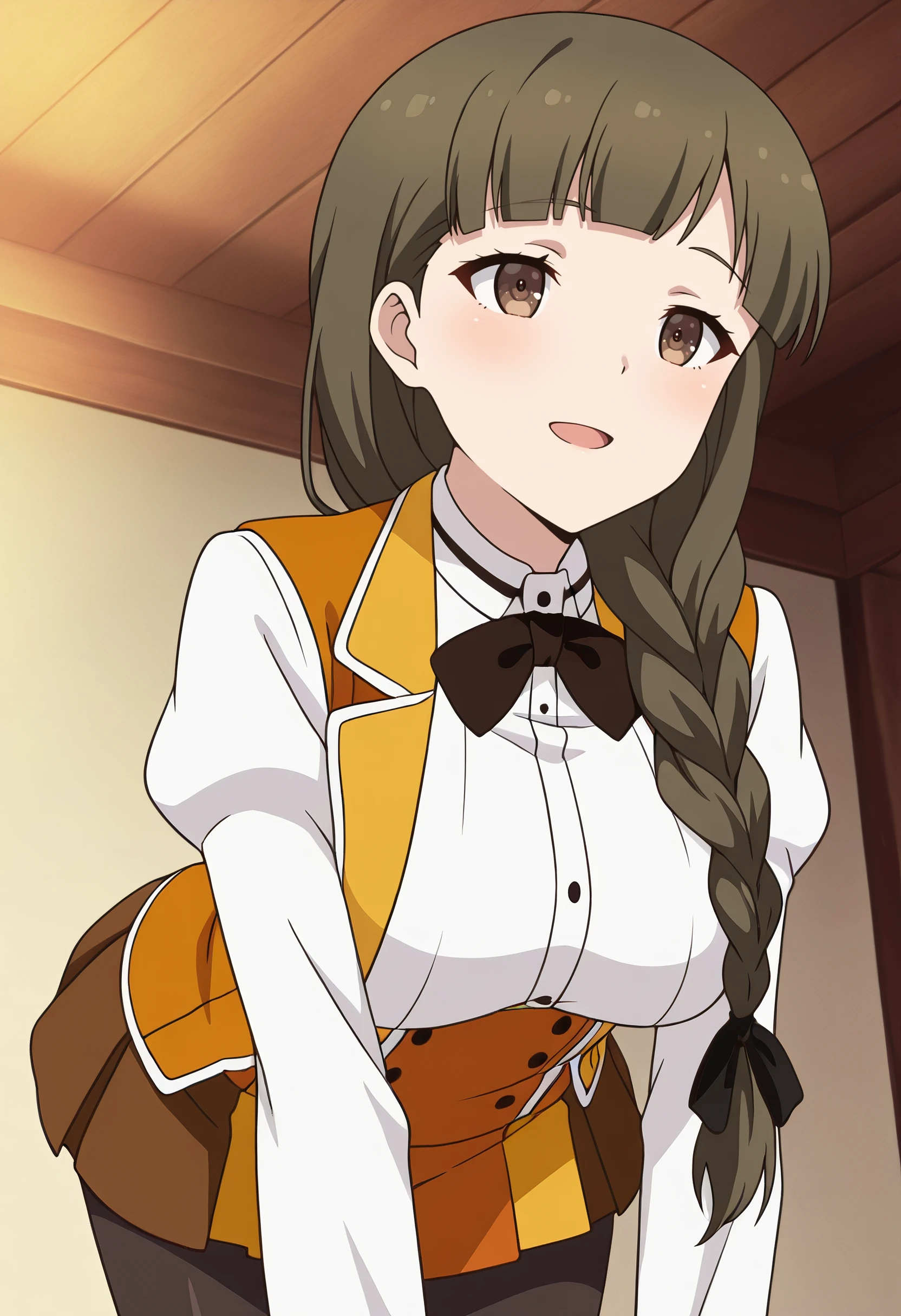 TNMOgawa, brown hair, long hair, braid, single braid, hair over shoulder, brown eyes, blunt bangs, braided ponytail,
