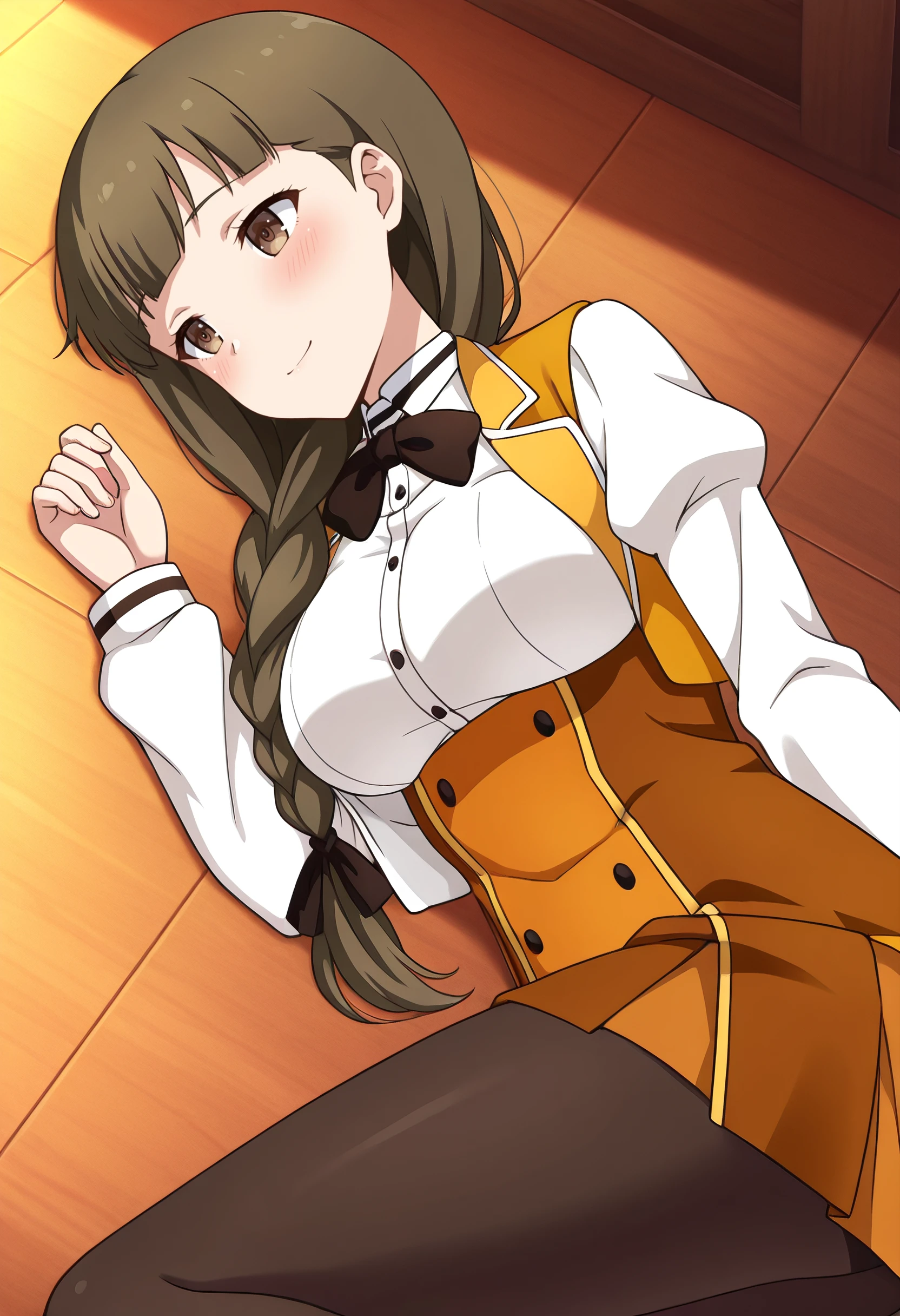 OgawaSchool, bow, white shirt, shirt, bowtie, school uniform, black bow, black bowtie, long sleeves, skirt, pantyhose, black pantyhose, underbust, collared shirt, pleated skirt, vest, yellow vest, dress shirt, buttons, hair ribbon, ribbon, high-waist skirt, brown skirt, miniskirt, black ribbon,
