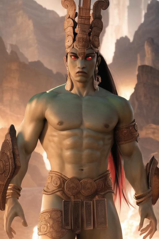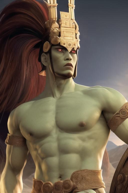 aogre, green skin, brown hair, long hair, red eyes, ponytail, aztec crown, aztec shield, aztec bracelet, aztec trunks, aztec anklets, shirtless, barefoot