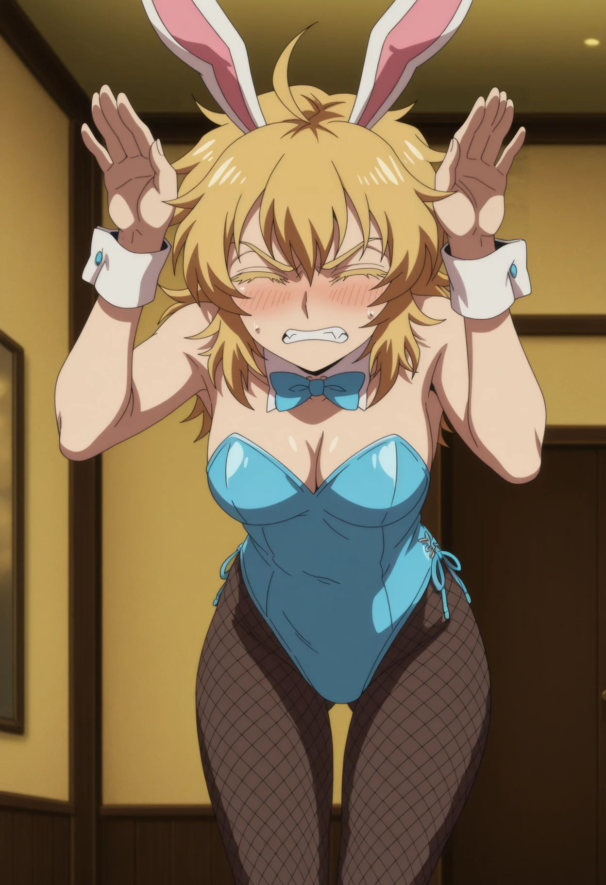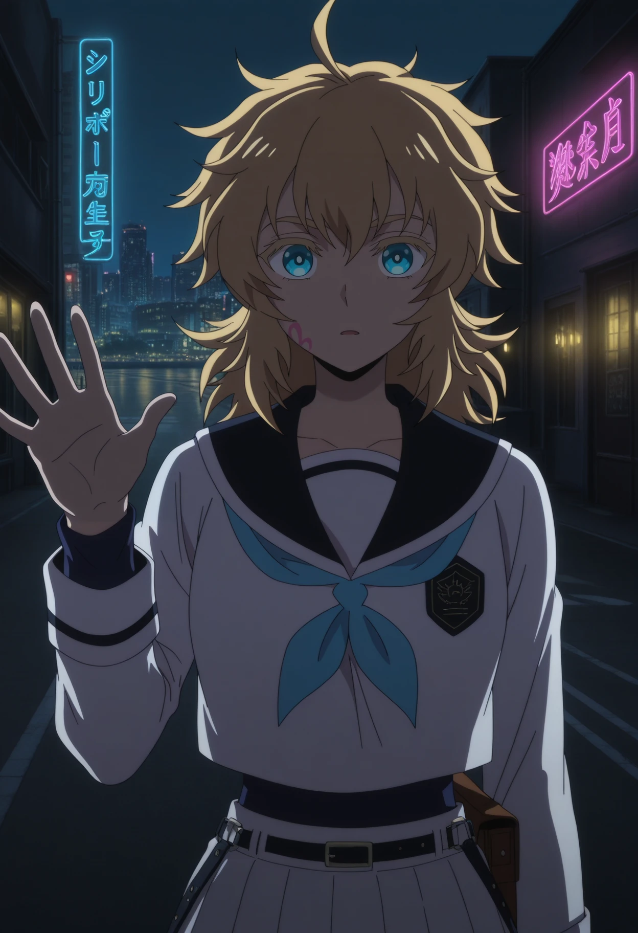 medium hair, blonde hair, blue eyes, messy hair, ahoge, colored eyelashes, serafuku