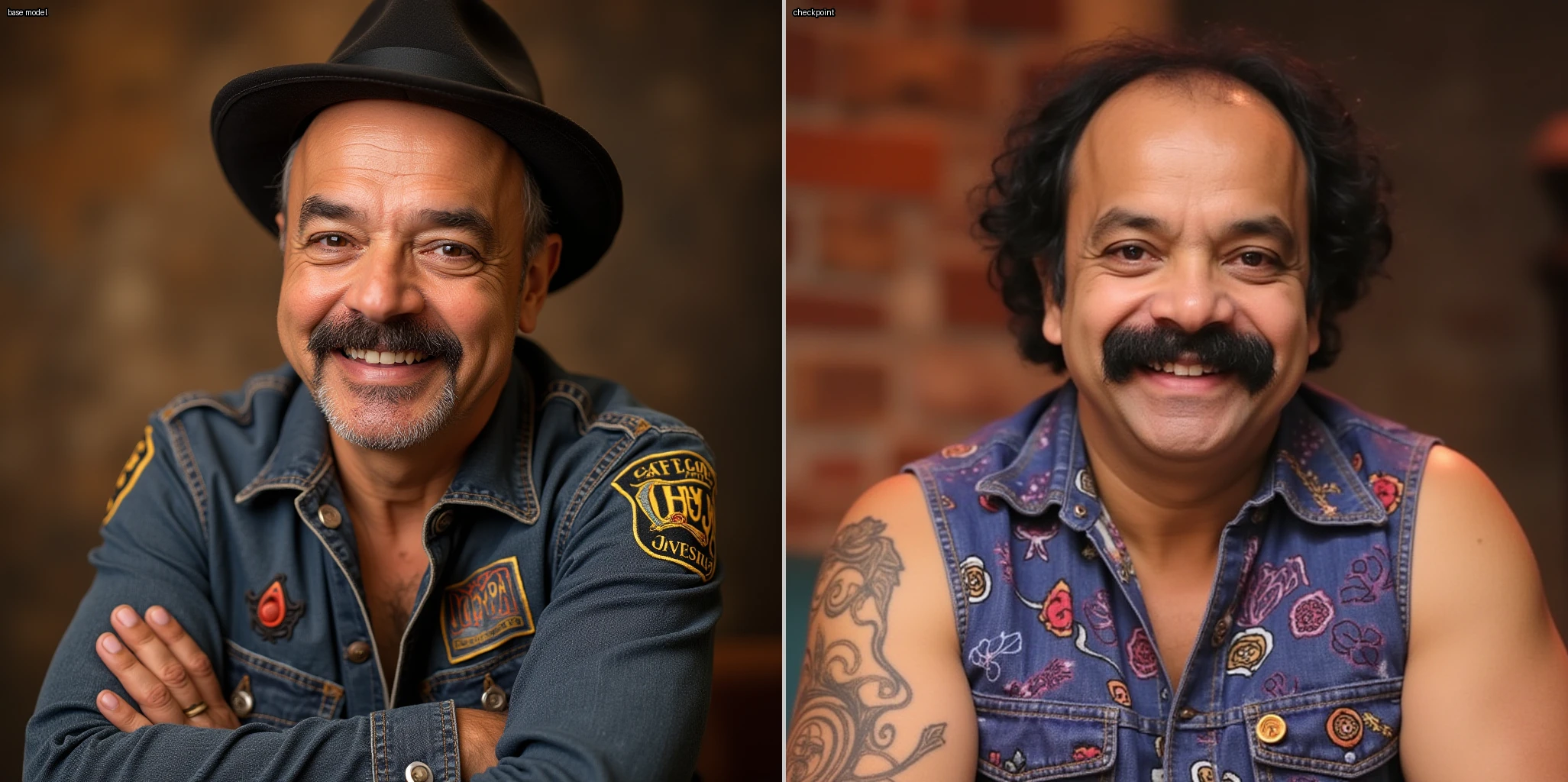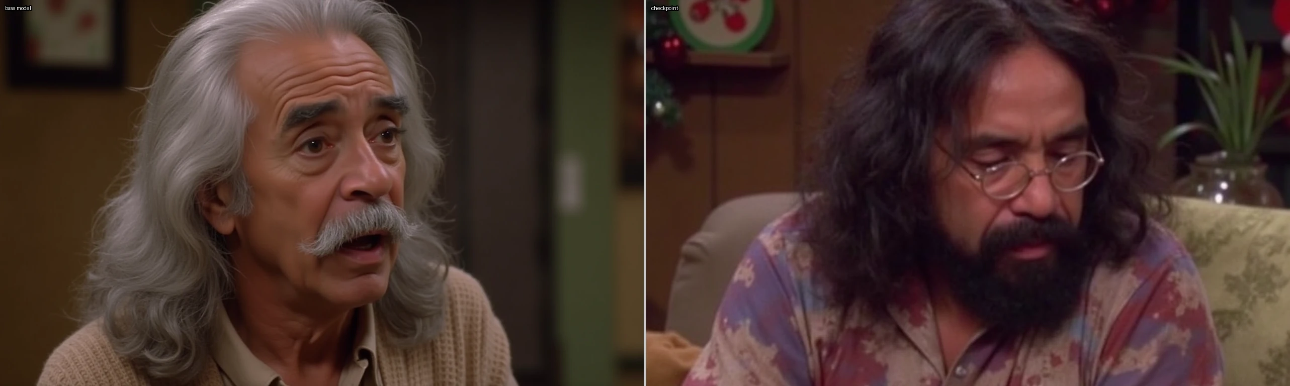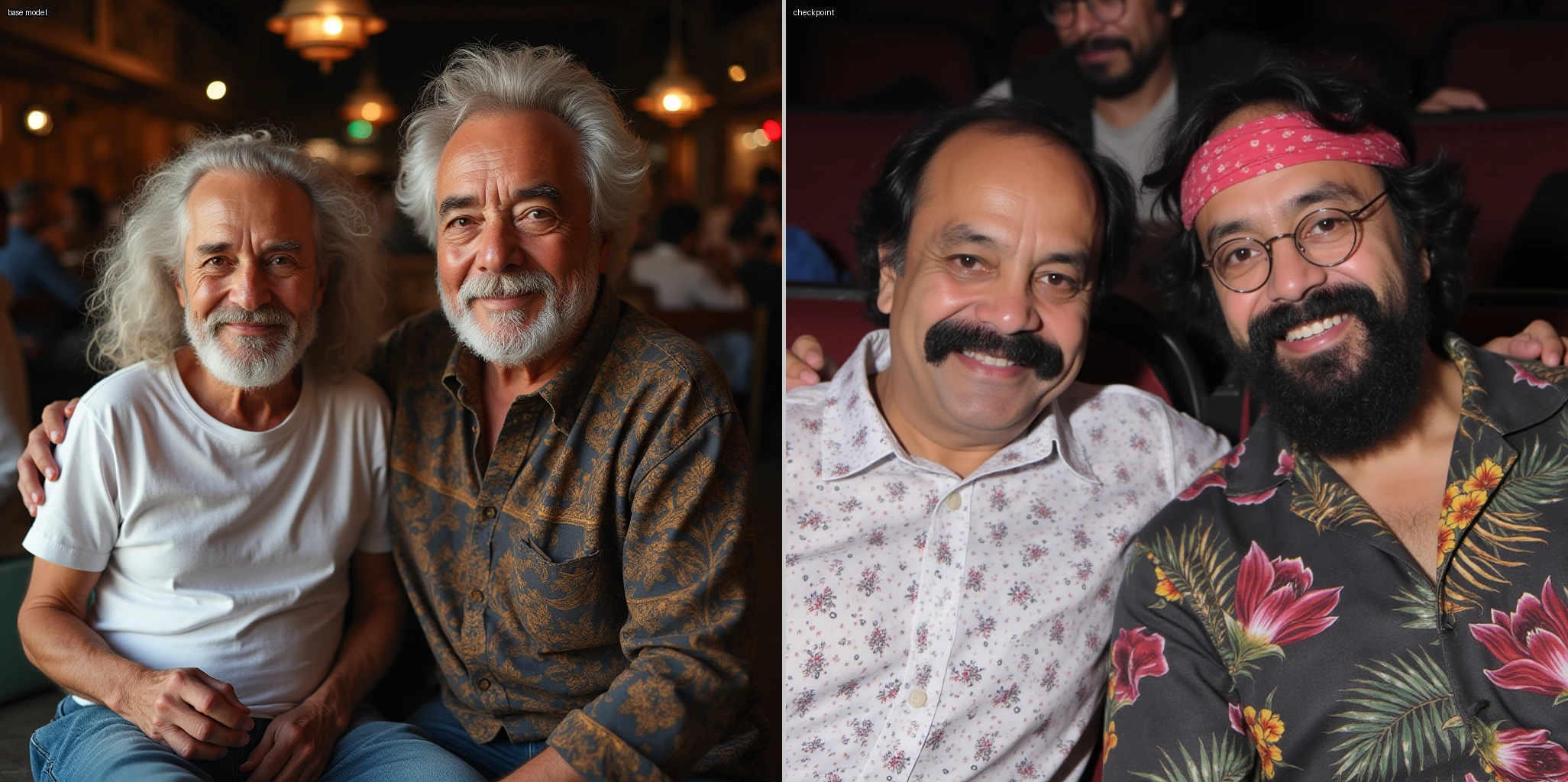 Despite my best efforts at captioning, I think Flux's internal bias here is something to work with instead of working against. For example, asking for Tommy Chong sitting to the right of Cheech Marin doesn't work as well as Cheech Marin sitting to the left of Tommy Chong.