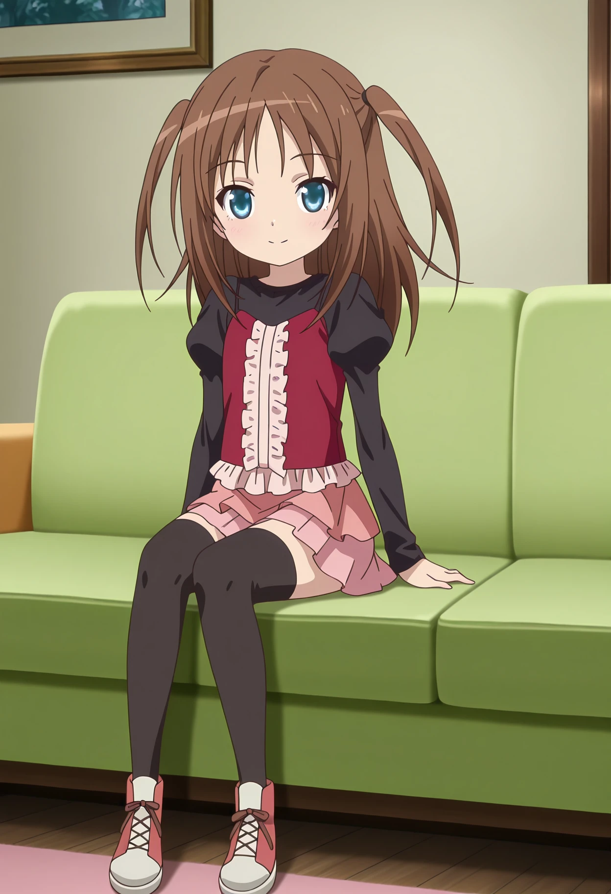 red shirt, black undershirt, center frills, juliet sleeves, long sleeves, pink skirt, black thighhighs, sneakers,