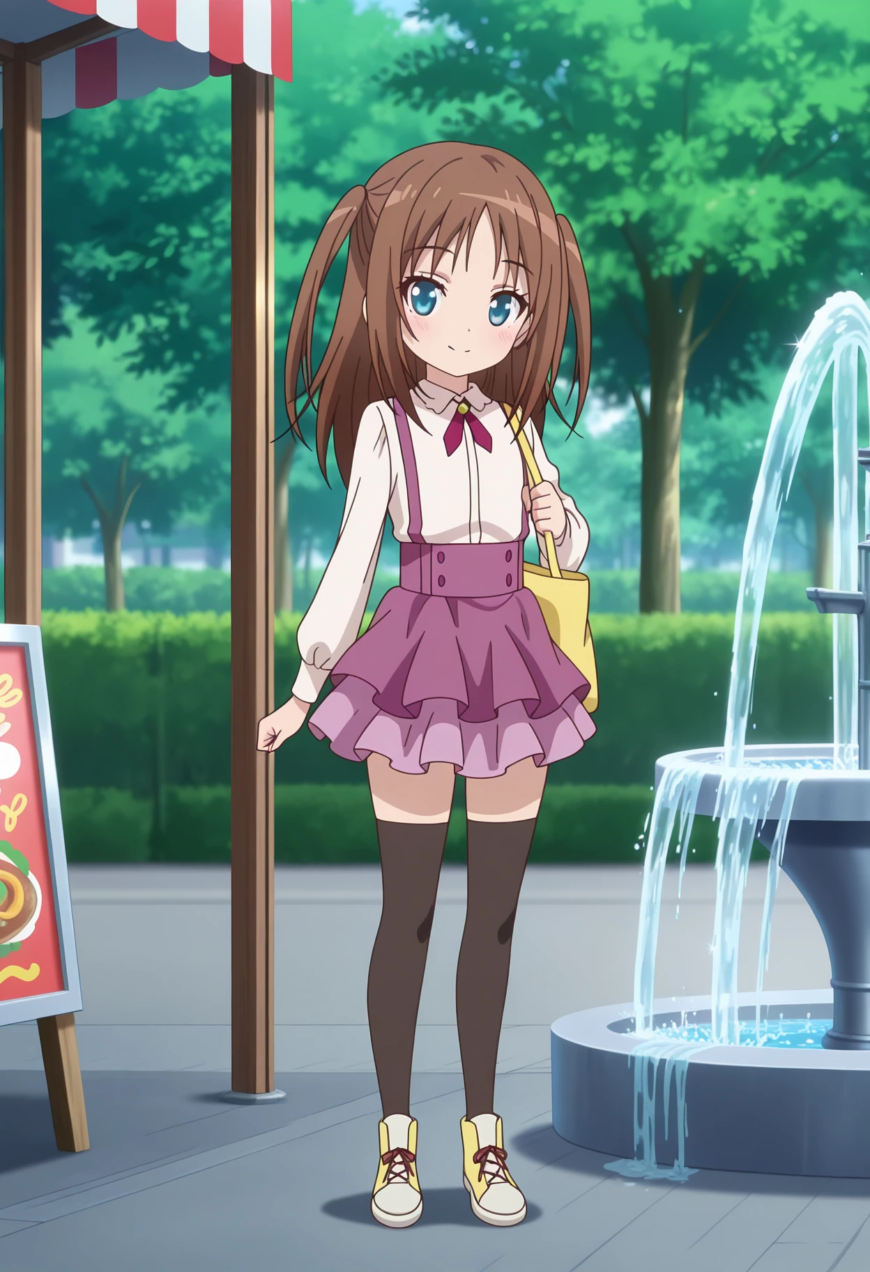 white shirt, purple neck ribbon, suspenders, long sleeves, purple skirt, layered skirt, black thighhighs, sneakers,