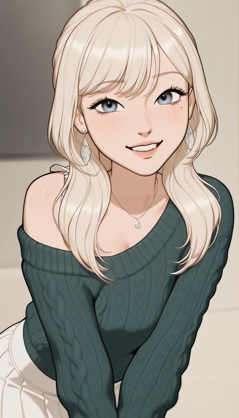 earrings, necklace, blue knit sweater, single off shoulder, white skirt,