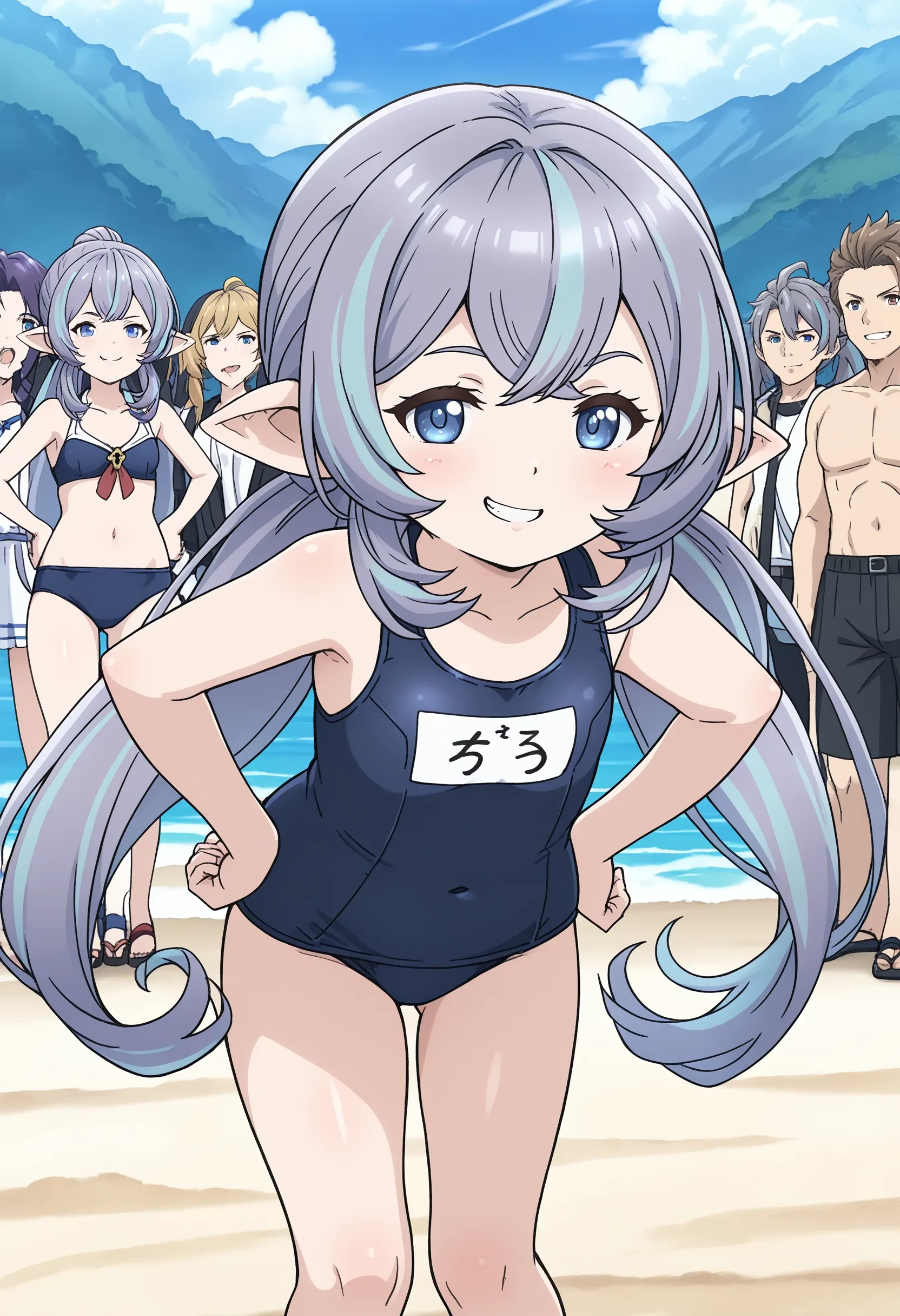 uruki \(granblue fantasy\), harvin, purple hair, multicolored hair, low twintails, blue eyes, bonnet, hat tassel, dress, long sleeves, mittens, backpack, footwear,