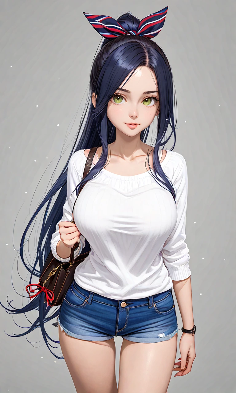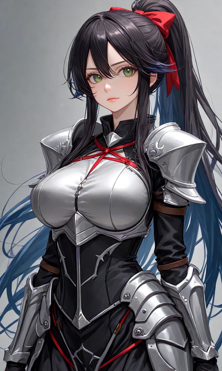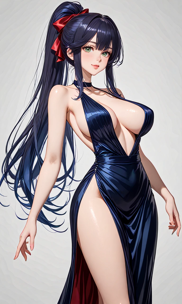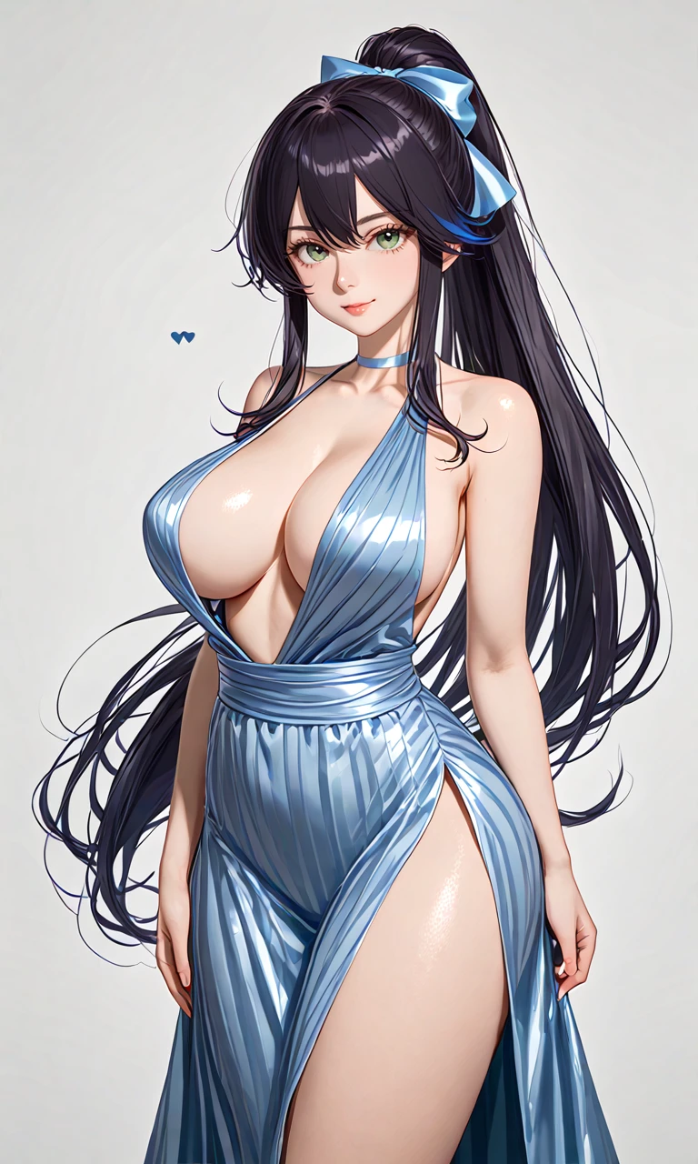 Ludmilla dark hair blue hair long hair ponytail green eyes ribbon large breasts, 1girl,