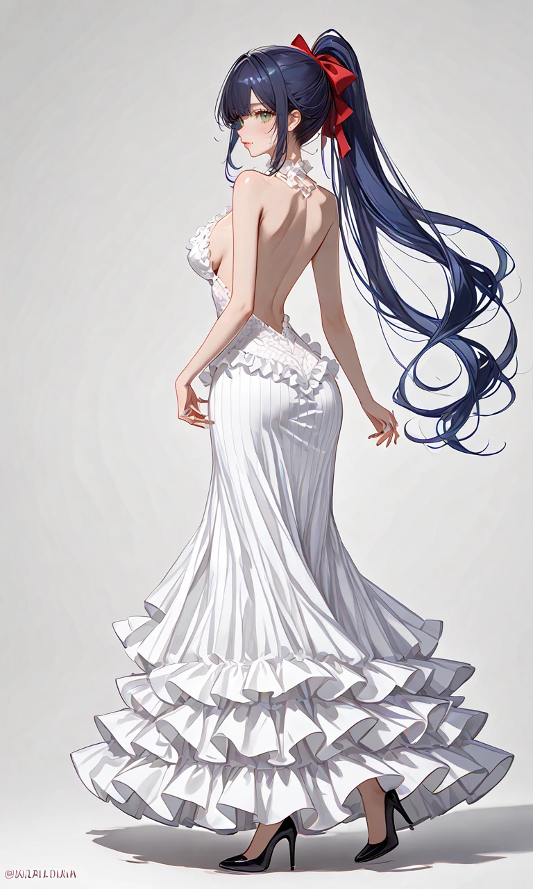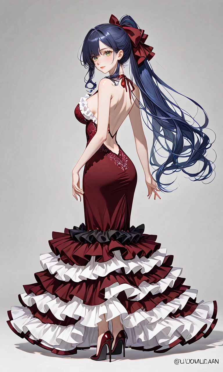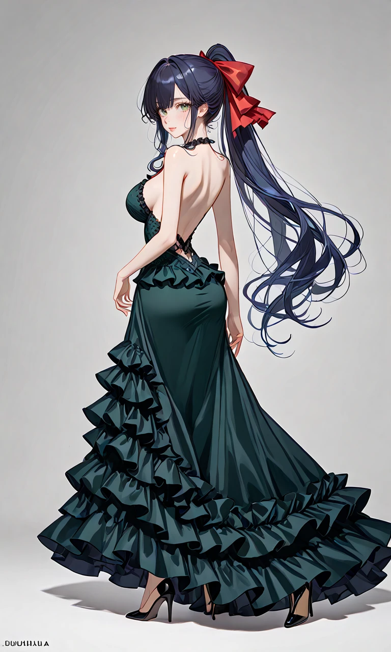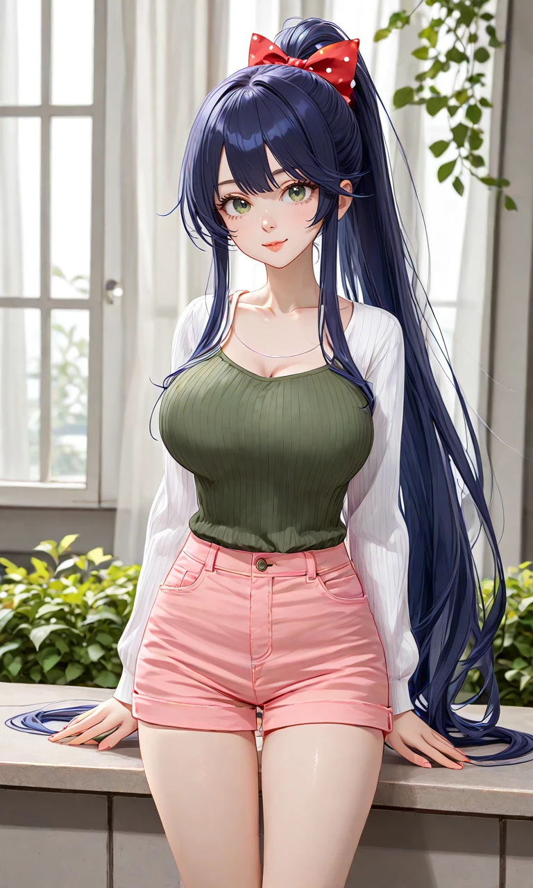 Ludmilla dark hair blue hair long hair ponytail green eyes ribbon large breasts, 1girl,