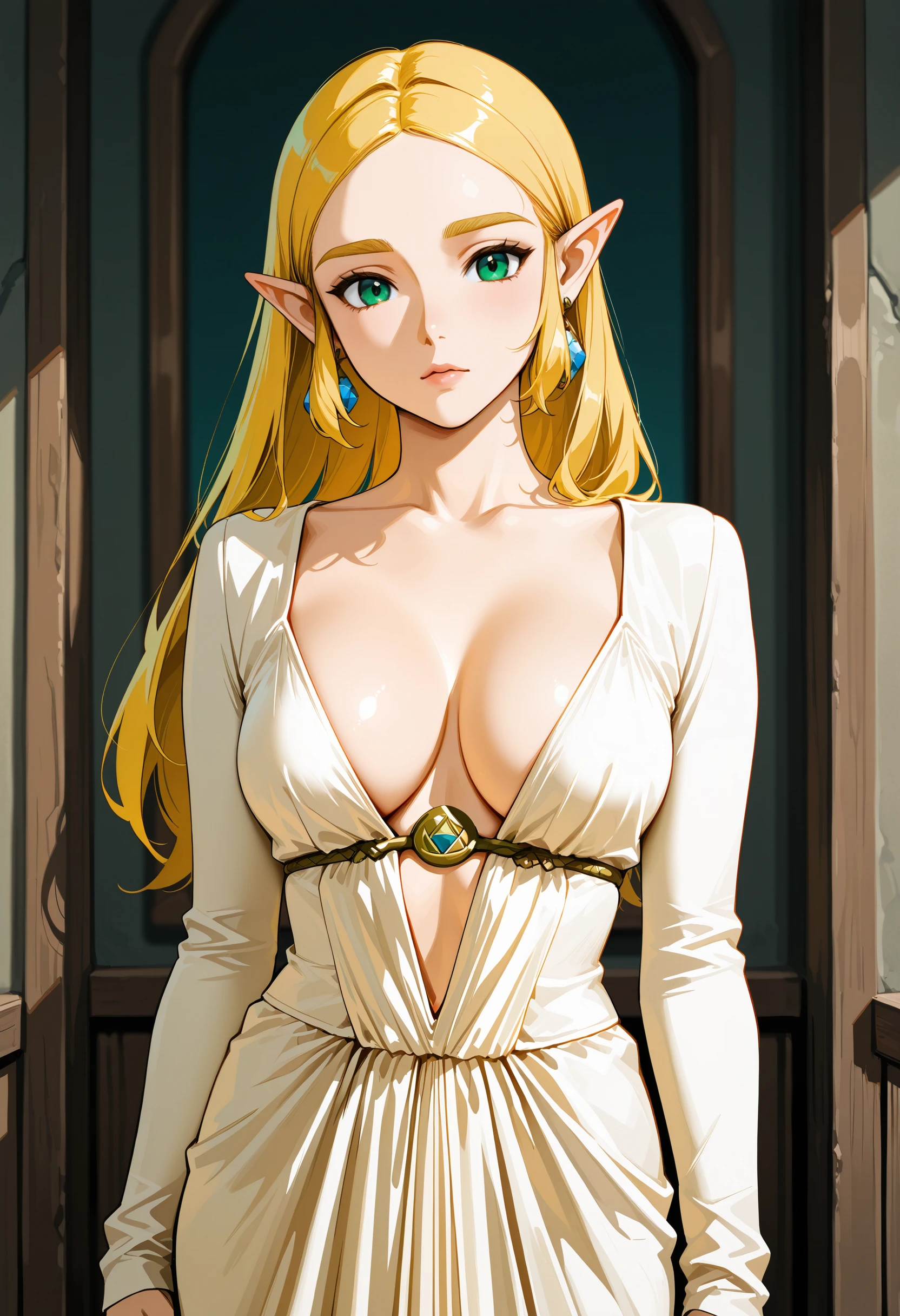 dress, jewelry, plunging neckline, long sleeves
