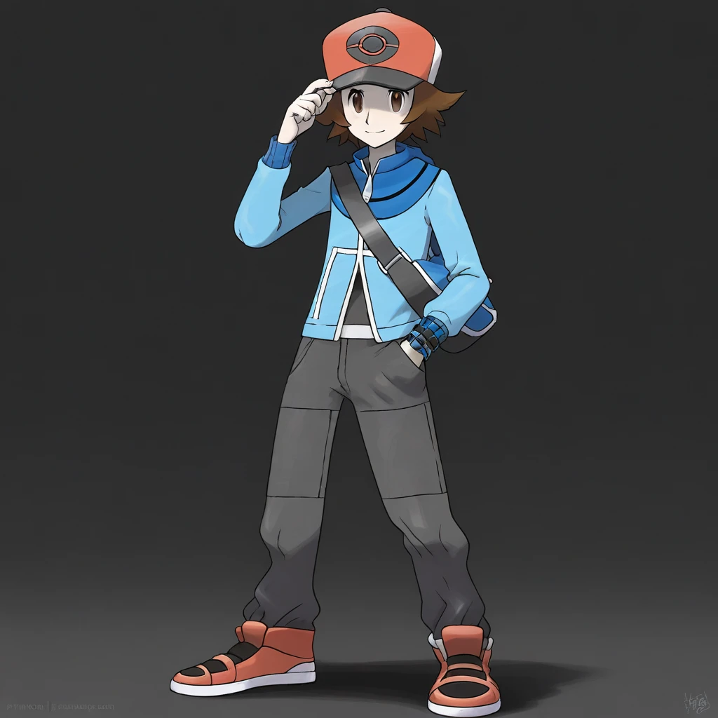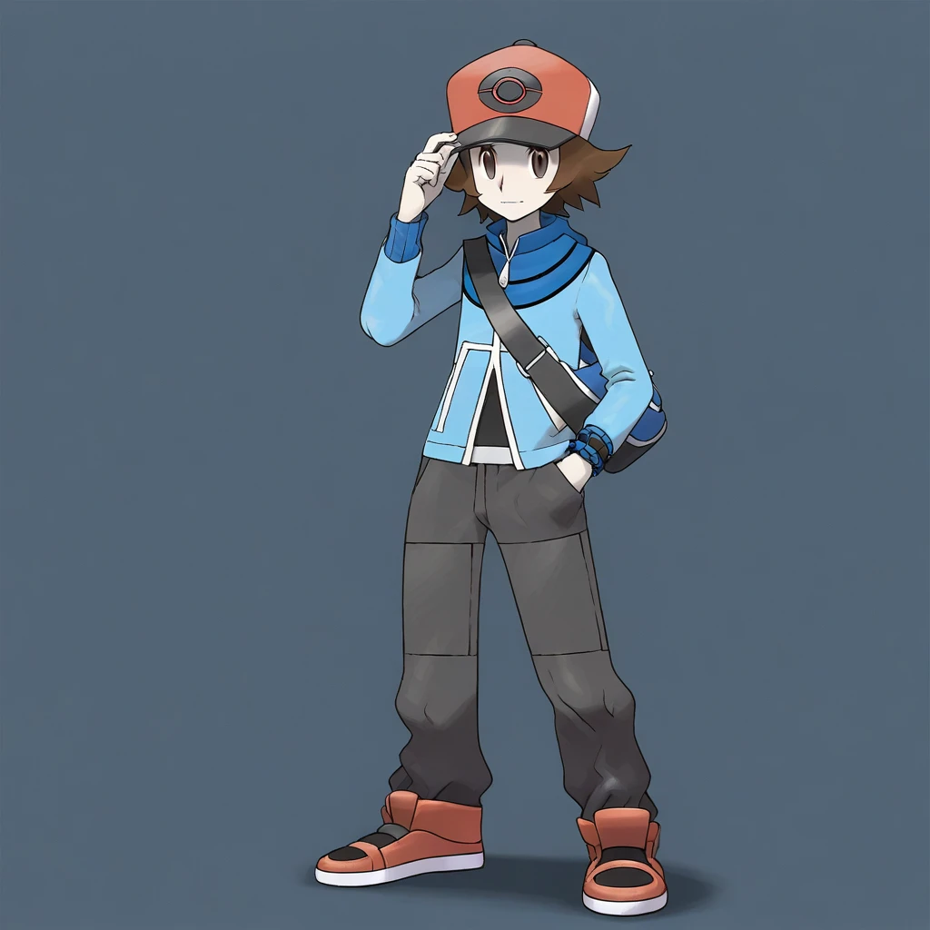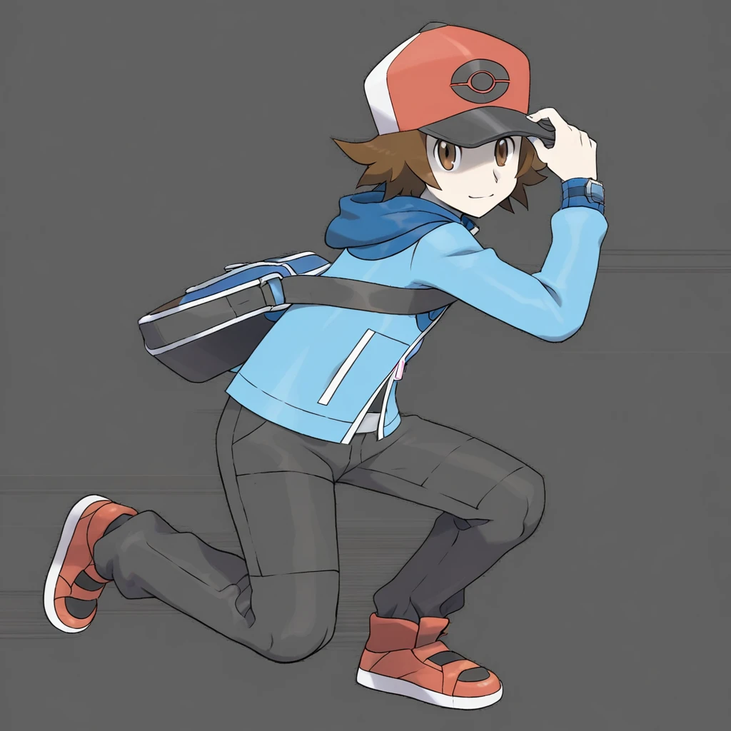 1boy, hat, solo, brown hair, brown eyes, pants, jacket, shoes, bag, blue jacket, baseball cap, shoulder bag, red footwear, short hair, long sleeves, zipper pull tab, red headwear, grey pants