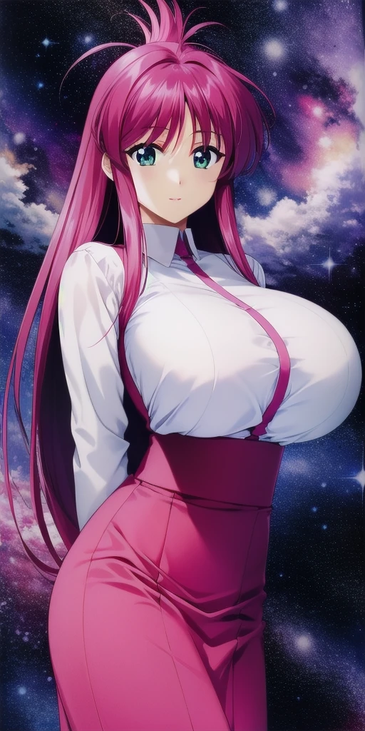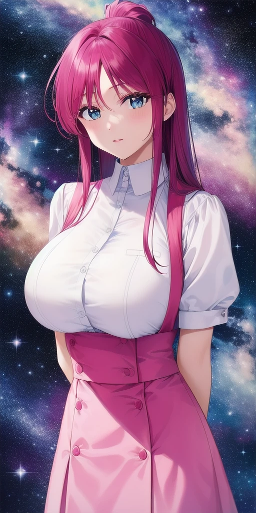 Waitress uniform with her secondary trigger(natsume_atsuko_braided_bangs_bun_cover_double_bun):white_shirt, pink_skirt, suspender_skirt, waitress