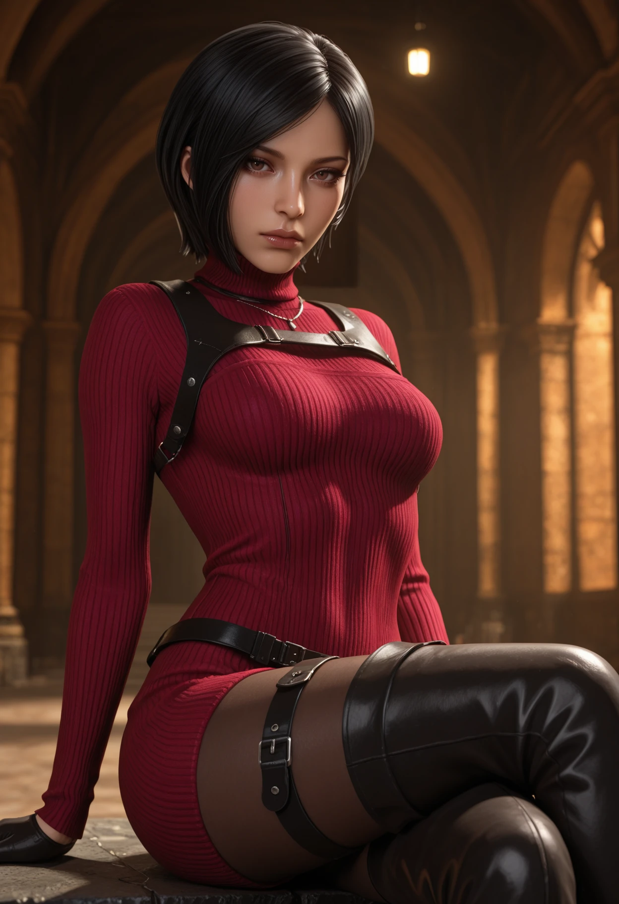 jewelry, necklace, dress, short dress, ribbed dress, turtleneck dress, red dress, turtleneck, sweater dress, long sleeves, gloves, black gloves, belt, pantyhose, boots, thigh boots, thigh strap, chest harness,