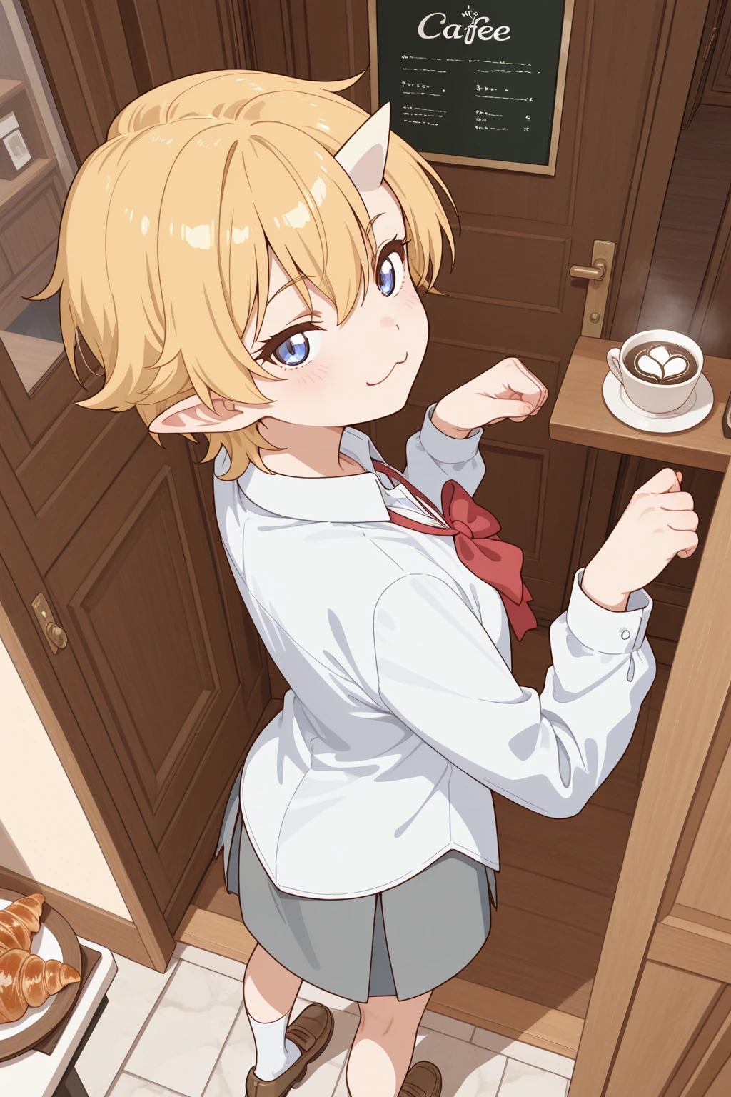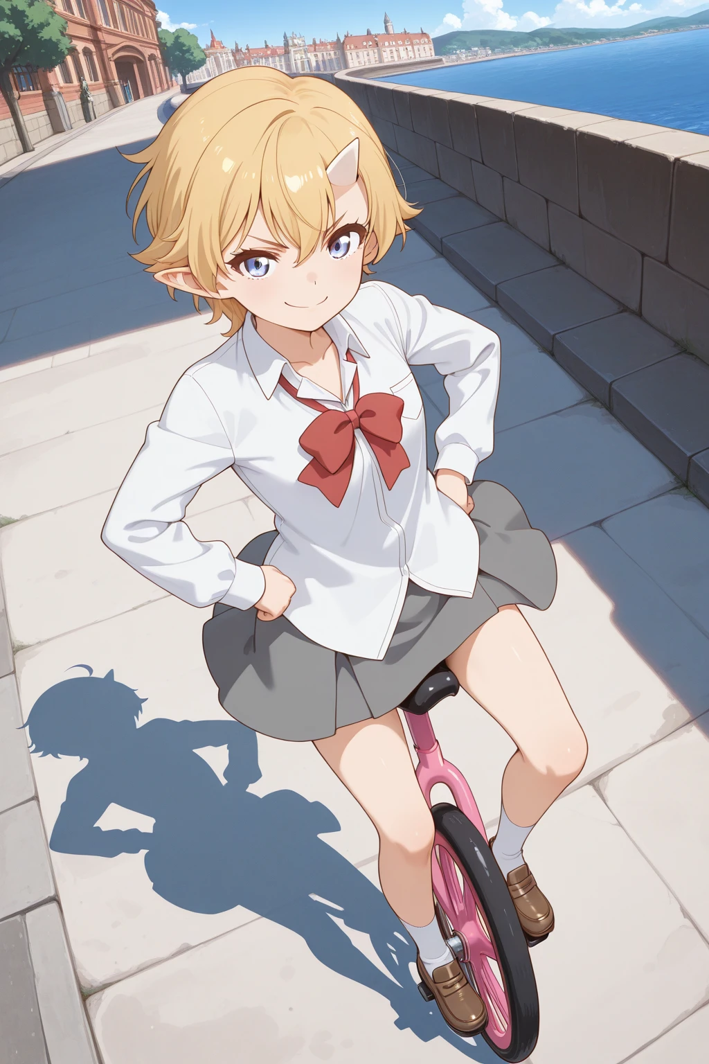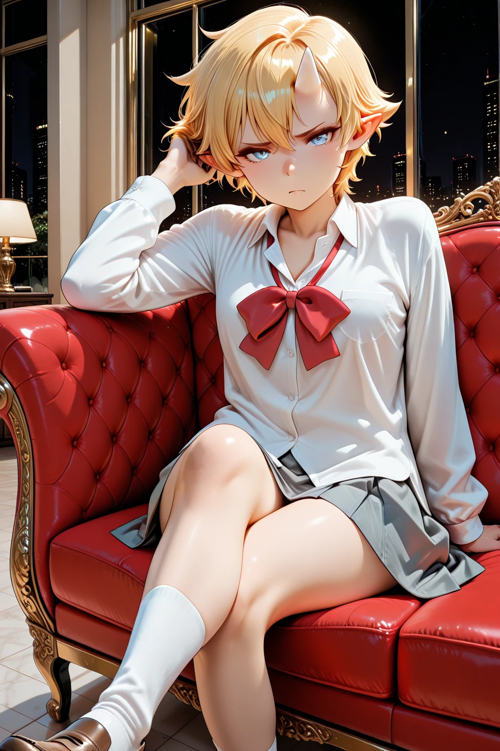 トリガーワード:Onipan_Himawari, blonde hair, short hair, bangs, pointy ears, oni horns, single horn, blue eyes, school uniform, white shirt, collared shirt, red bowtie, loose bowtie, long sleeves, untucked shirt, grey skirt追加:white socks, brown loafers