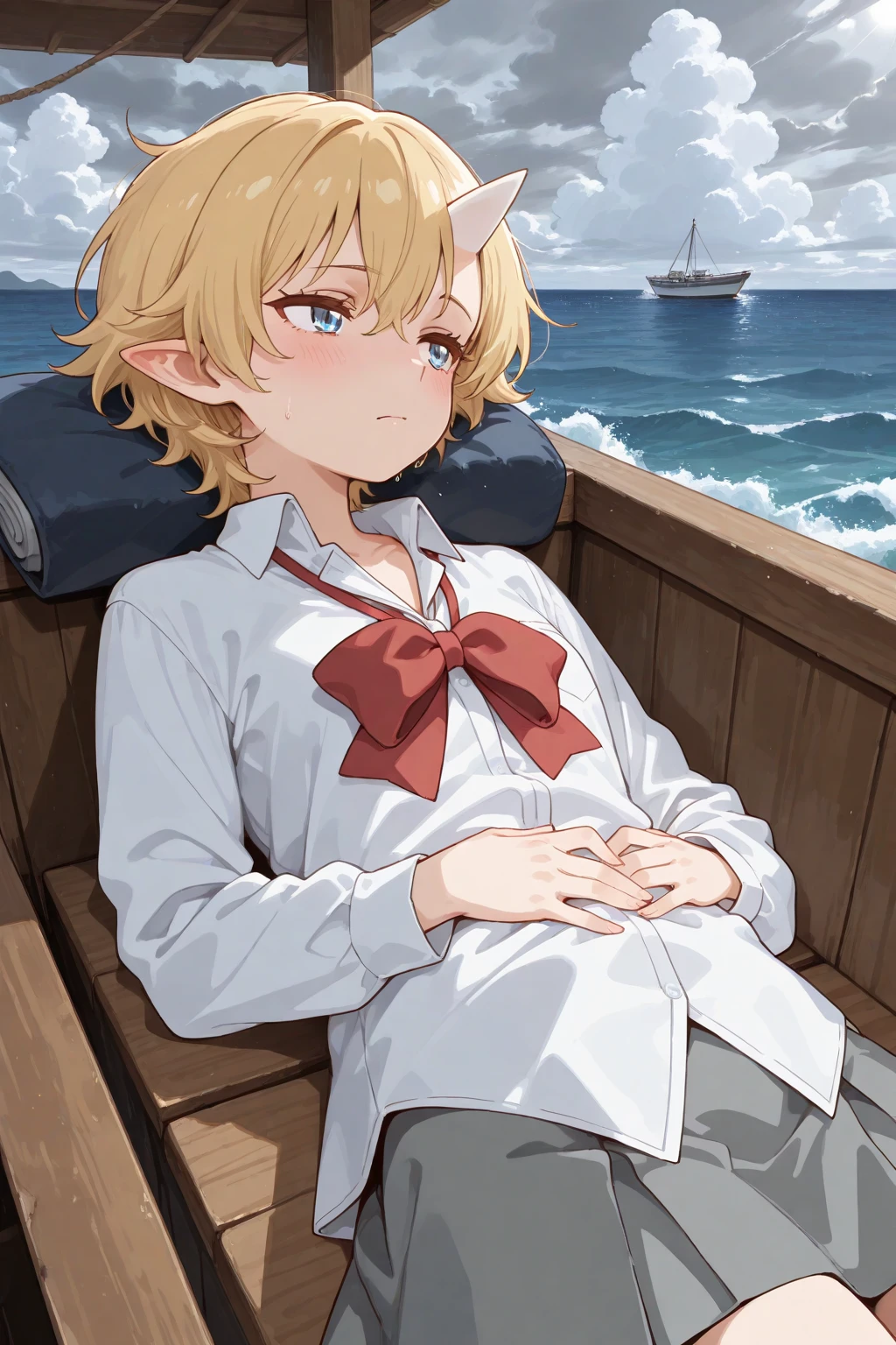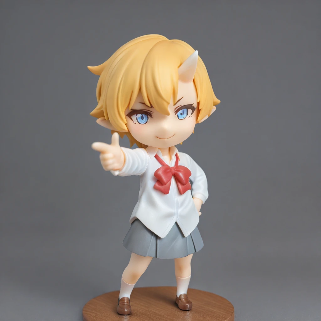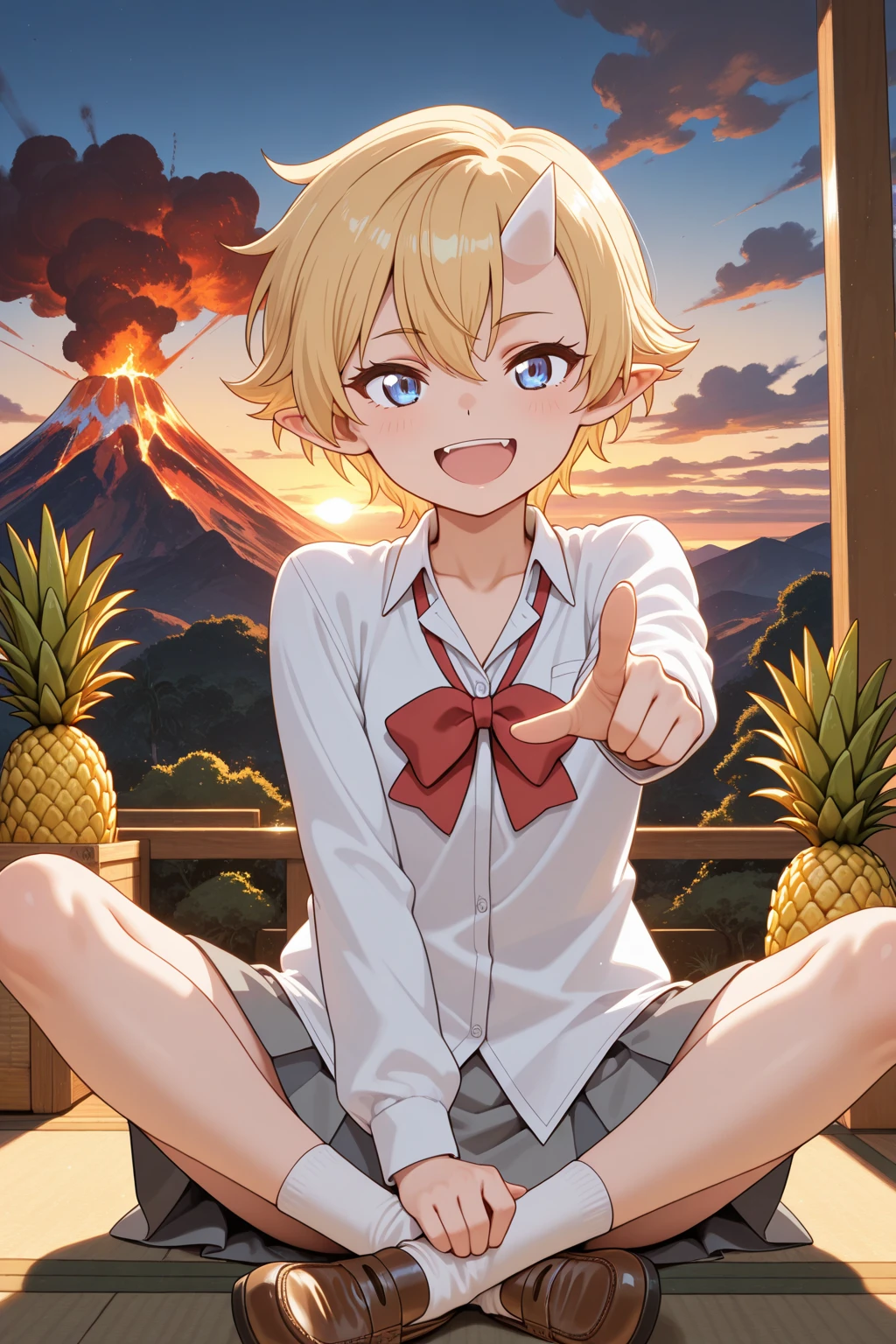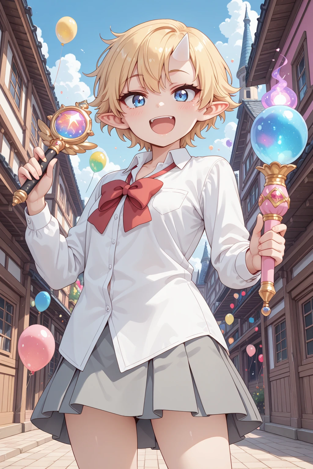 トリガーワード:Onipan_Himawari, blonde hair, short hair, bangs, pointy ears, oni horns, single horn, blue eyes, school uniform, white shirt, collared shirt, red bowtie, loose bowtie, long sleeves, untucked shirt, grey skirt追加:white socks, brown loafers
