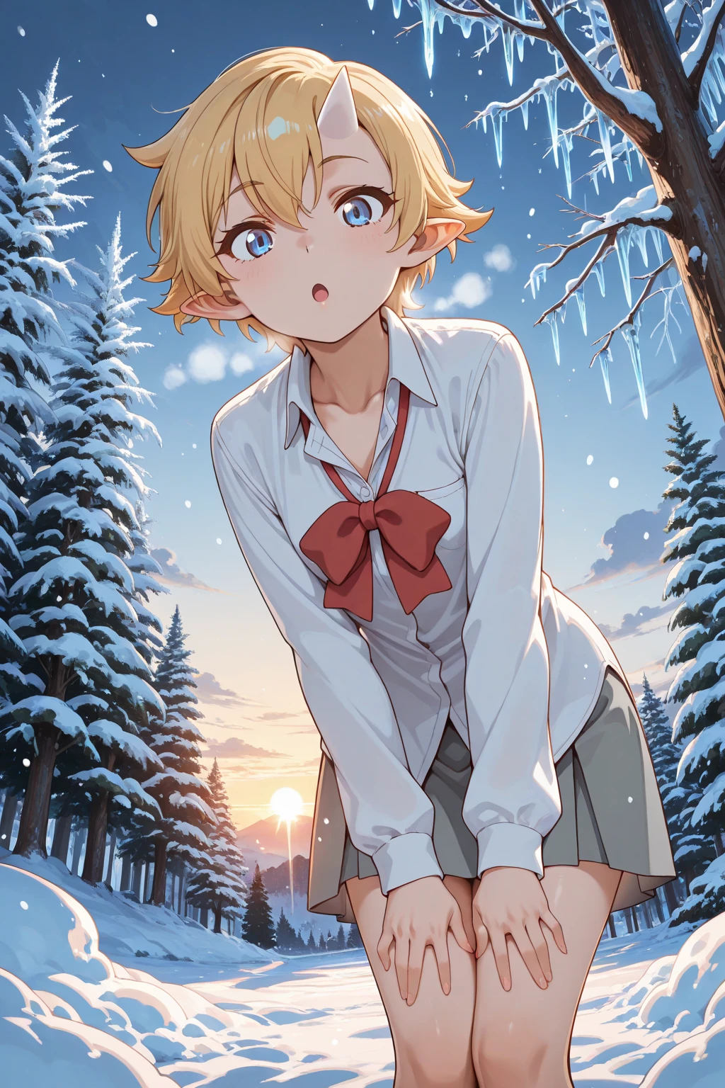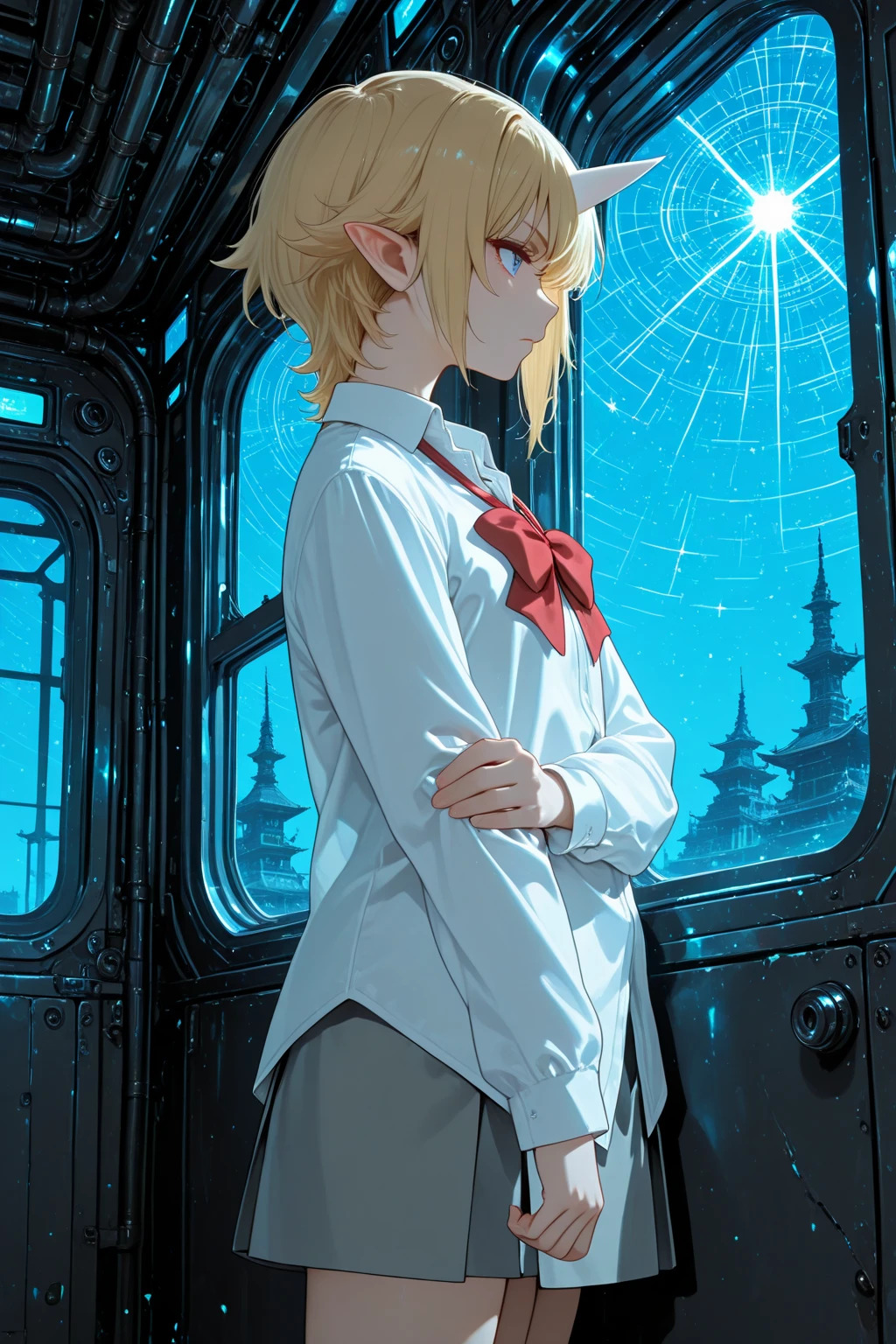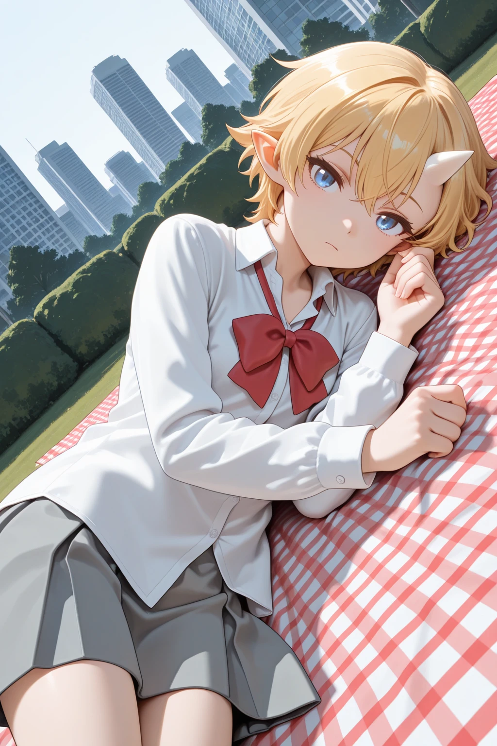 Onipan_Himawari, blonde hair, short hair, bangs, pointy ears, oni horns, single horn, blue eyes, school uniform, white shirt, collared shirt, red bowtie, loose bowtie, long sleeves, untucked shirt, grey skirt