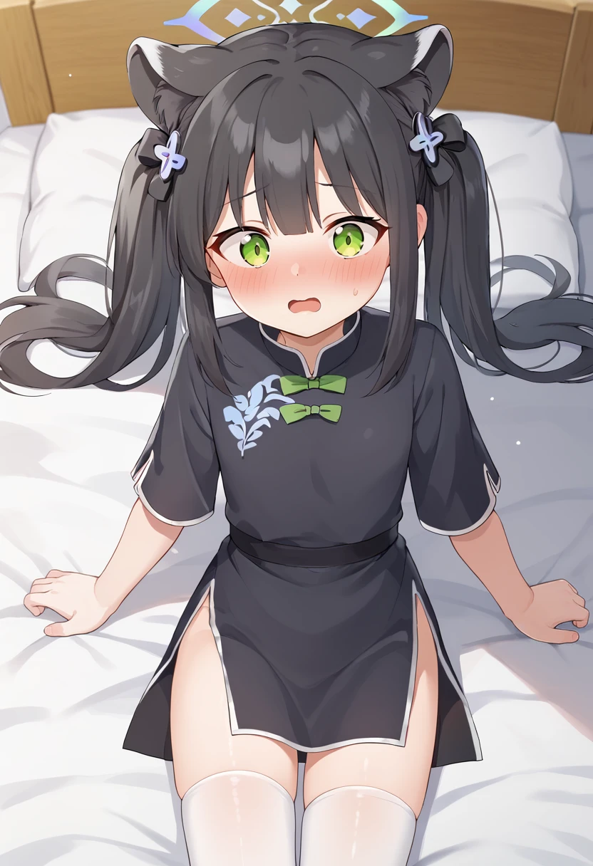 shun \(small\) \(blue archive\),green eyes, black hair,twintails,animal ears,halo,chinese clothes,black lace,white thighhighs,mary janes
