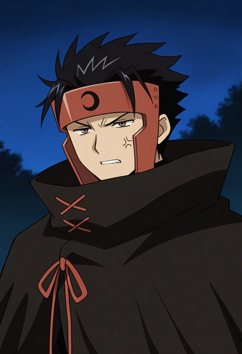 kurogane, 1boy, male focus, solo, brown eyes, black hair, short hair, spiked hair, forehead protector, headband, cloak, black cloak, high collar, black pants,