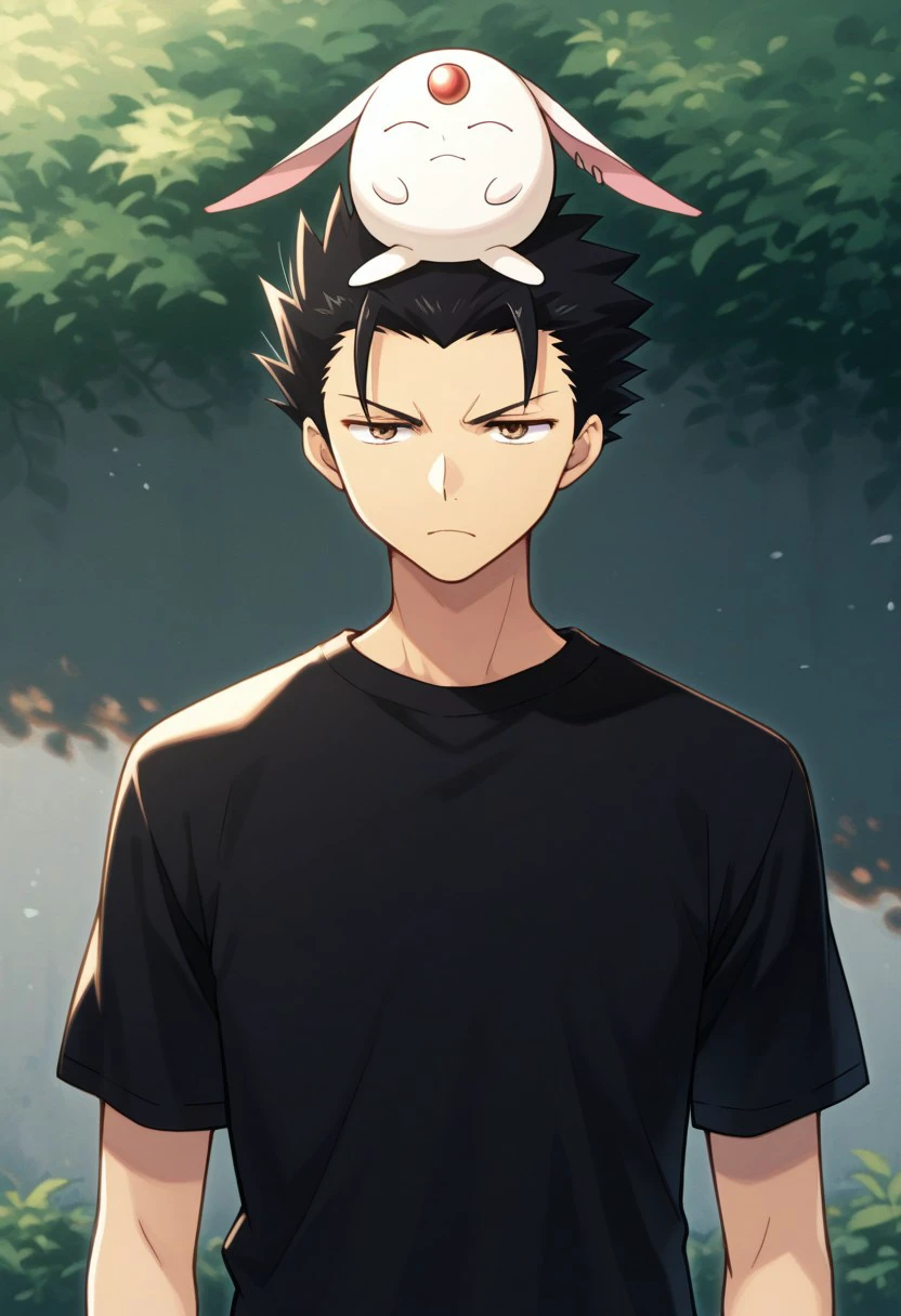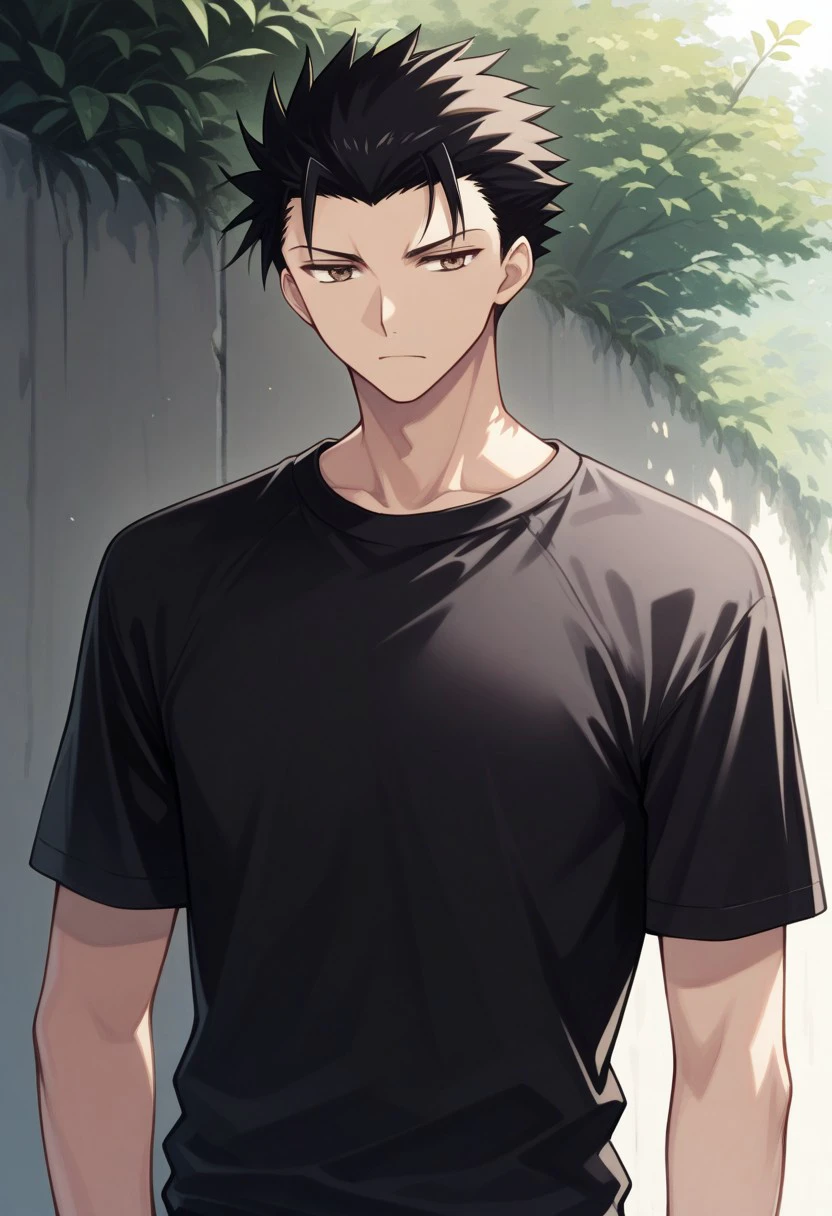kurogane, boy, male focus, solo, brown eyes, black hair, short hair, spiked hair, shirt, black shirt, t-shirt, short sleeves,