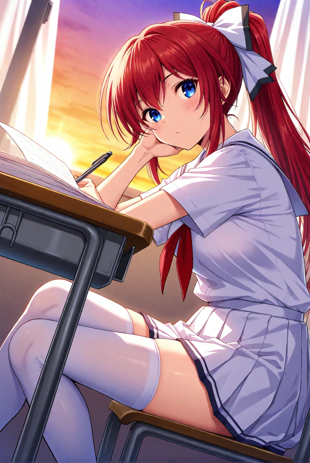 red ribbon , school uniform , sailor collar , ( short sleeves ) , striped clothes , white dress , miniskirt , ( white thighhighs ) ;