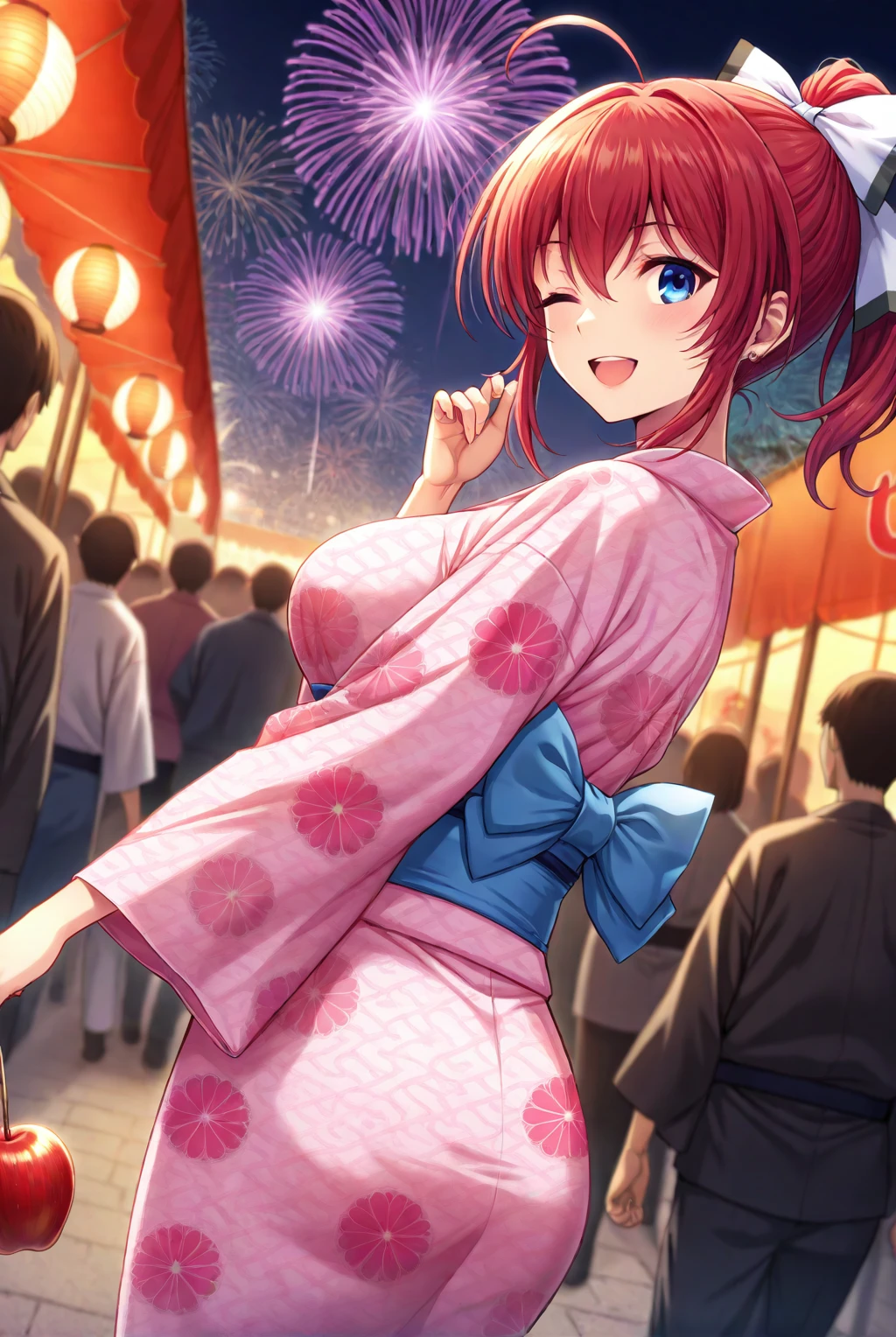 ( pink ) kimono / japanese clothes , ( red ) sash , back bow ;