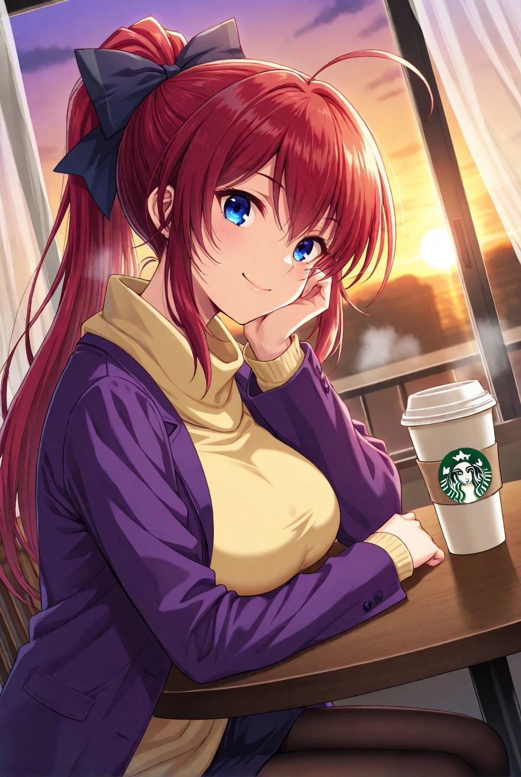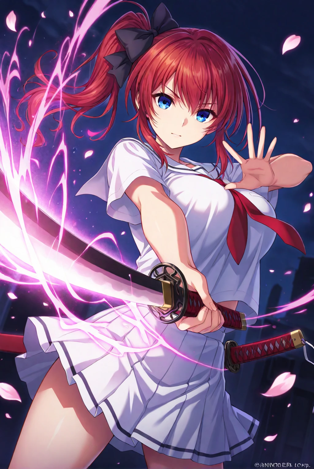 red hair , ( long hair ) , blue eyes , ahoge ;
