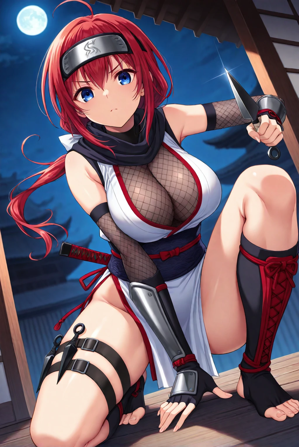 ninja , forehead protector , fishnets , sleeveless , elbow gloves , fingerless gloves , sash , red ribbon , pelvic curtain , thigh strap , kunai ;