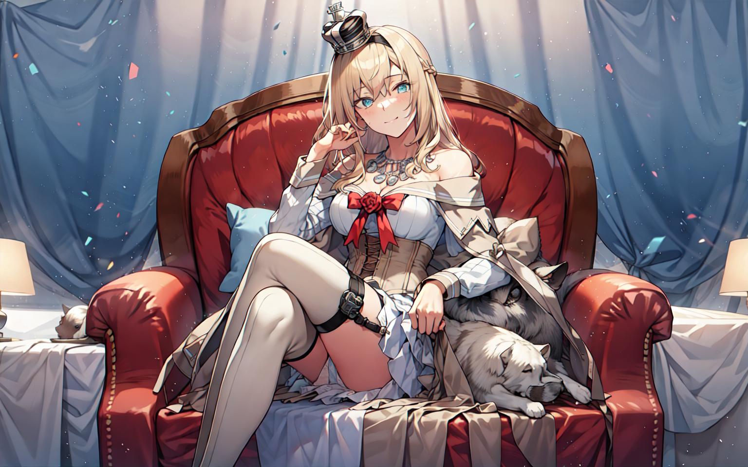 long hair, mini crown, hairband, off-shoulder dress, ribbon, necklace, rose, cleavage, corset, long sleeves,