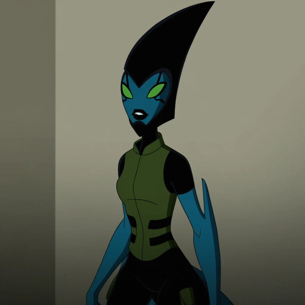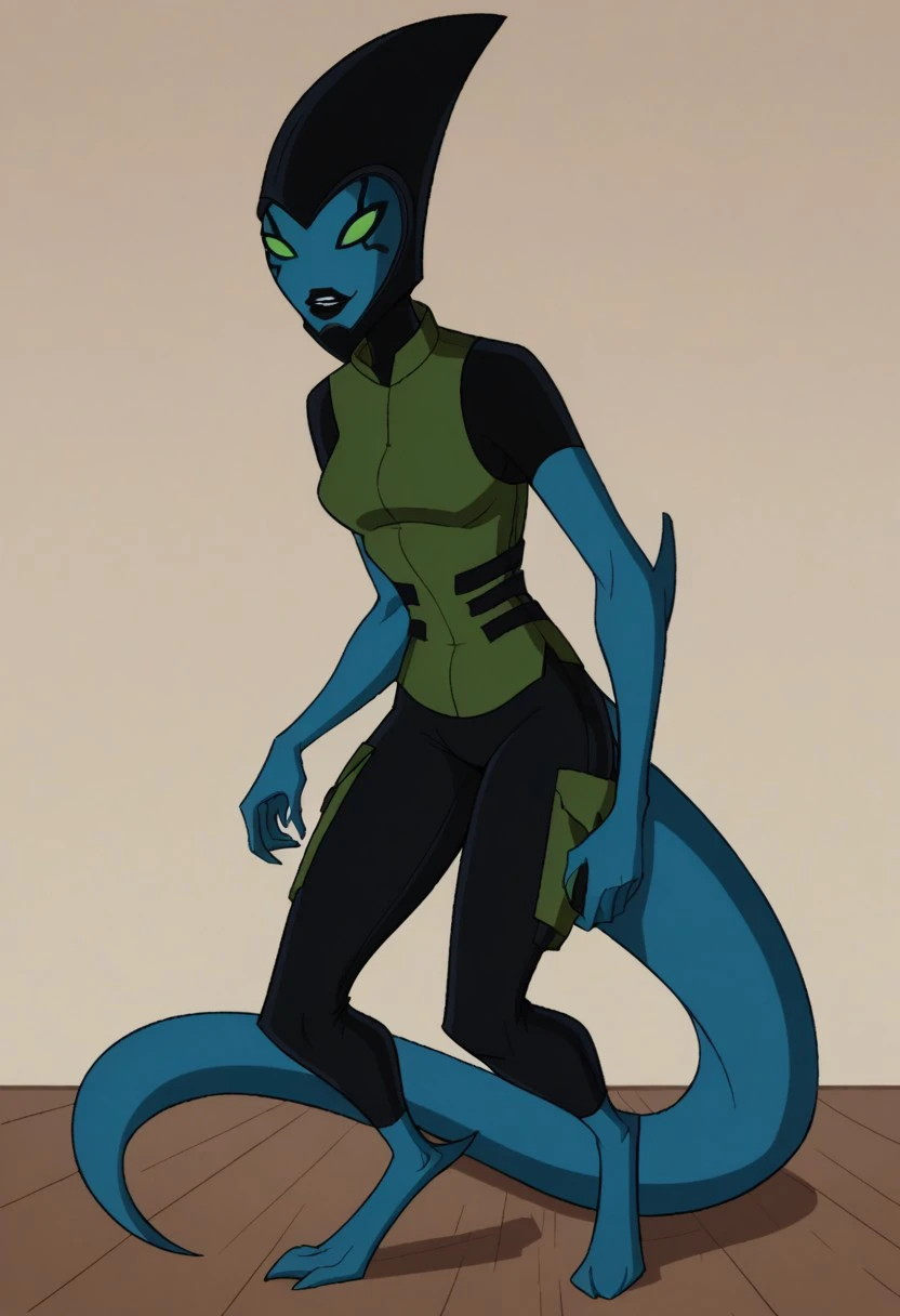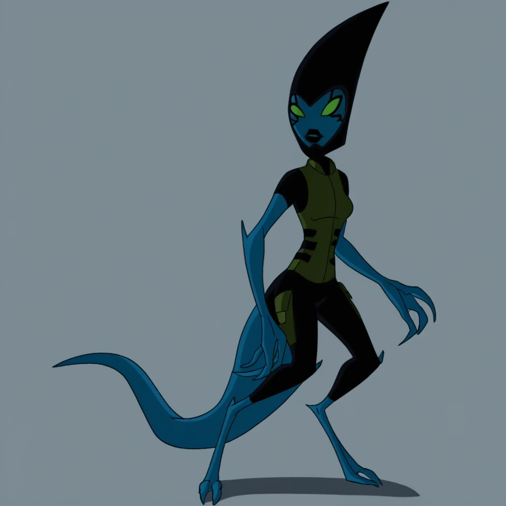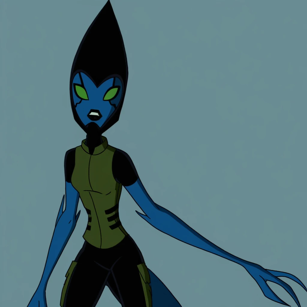Trigger words: 1girl, solo, Kineceleran female, Helen_B10AF, long elliptical and pointed black cone-like helmet, green eyes, blue skin, black lips, black facial markings, long prehensile blue tail, black green uniform, black orbs feet, three fingered hands