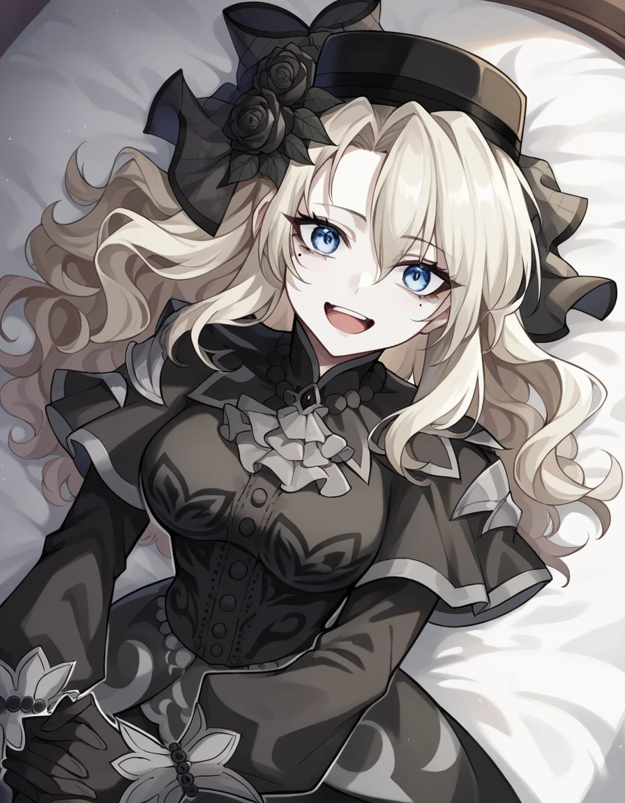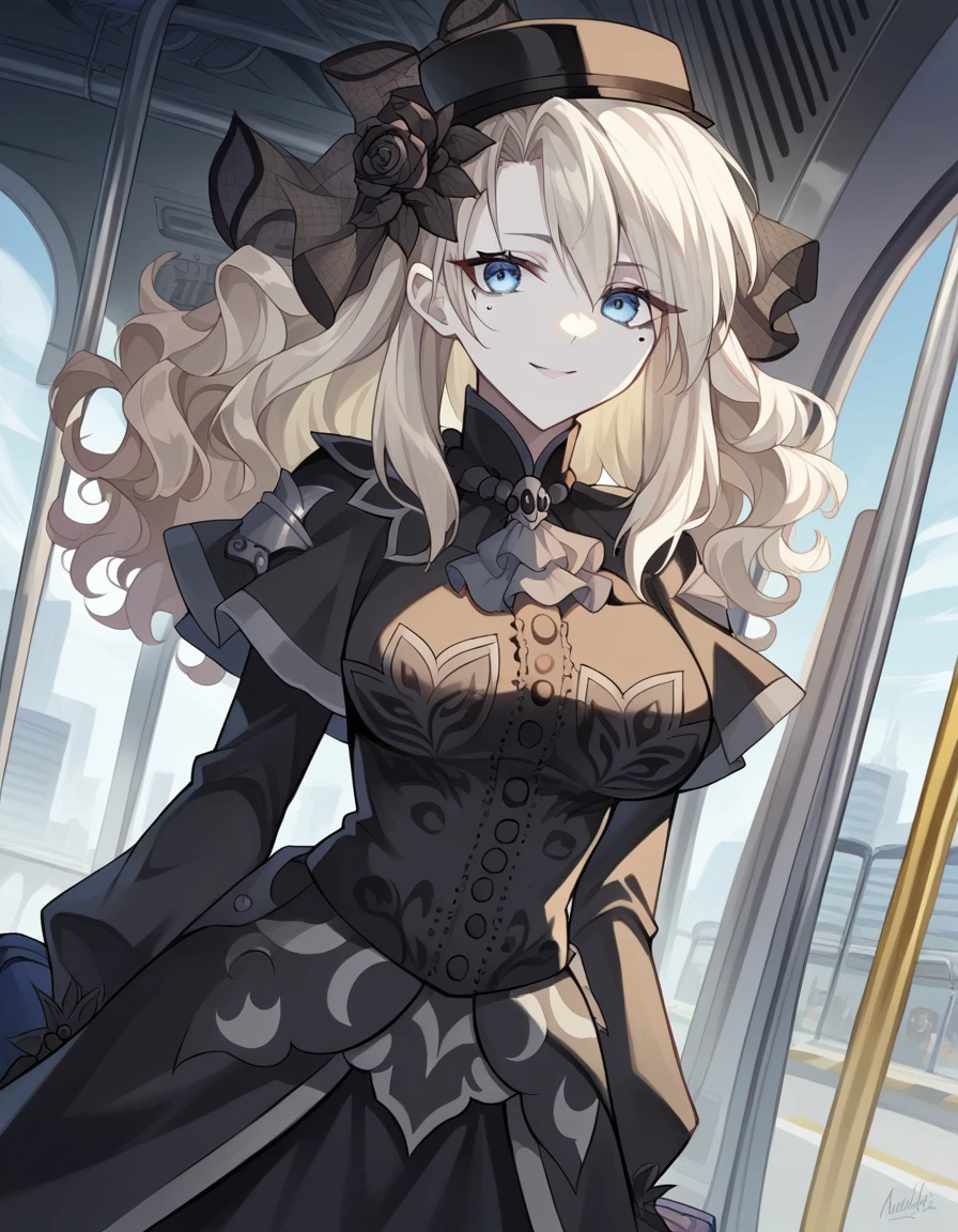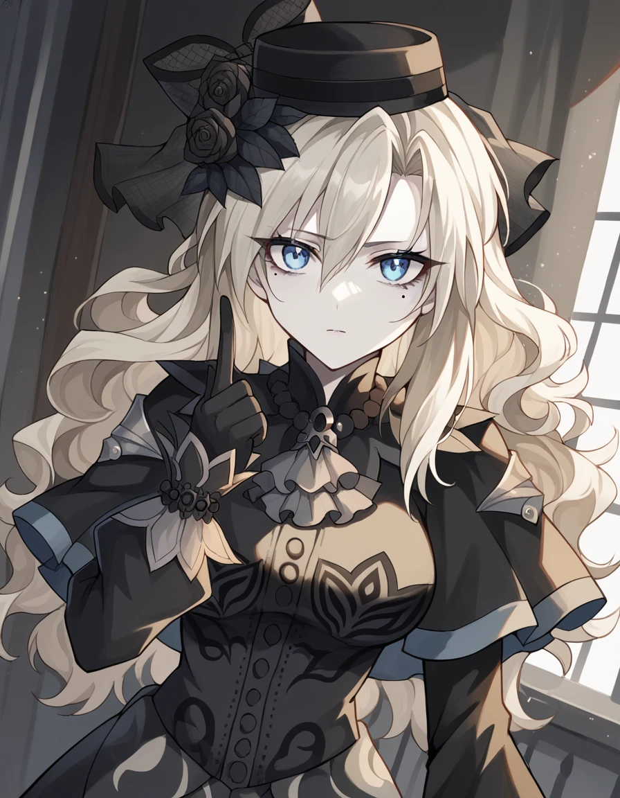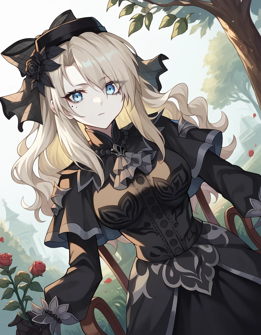 <lora:fgo-kriemhild-ponyxl-lora-nochekaiser:1>, kriemhild, blue eyes, long hair, mole, mole under eye, pale skin, white hair, wavy hair, large breasts,