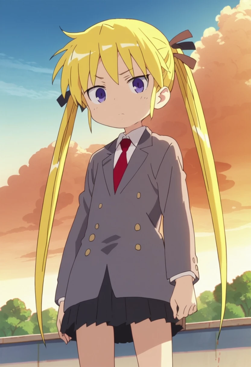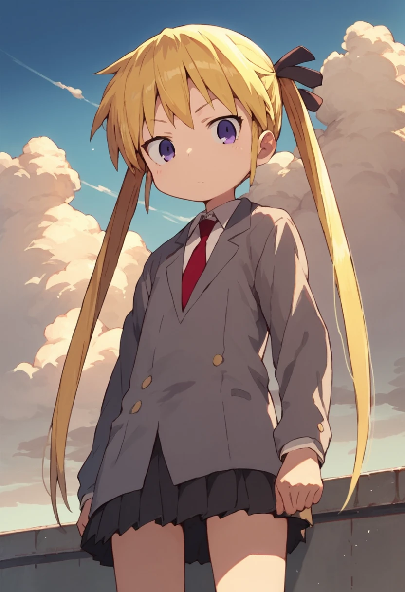 sonyakmb, blonde hair, long hair, twintails, hair ribbon, purple eyes, school uniform