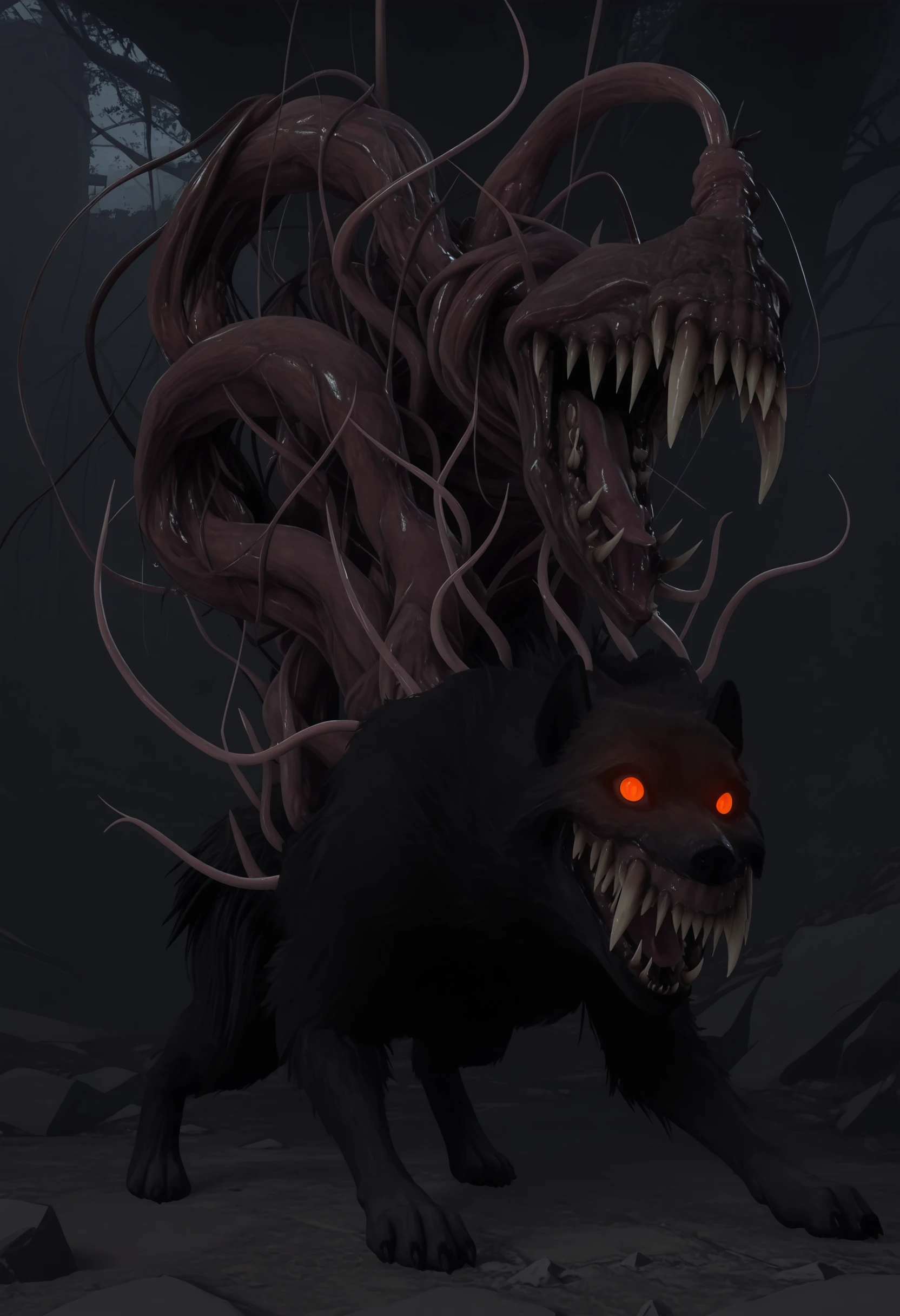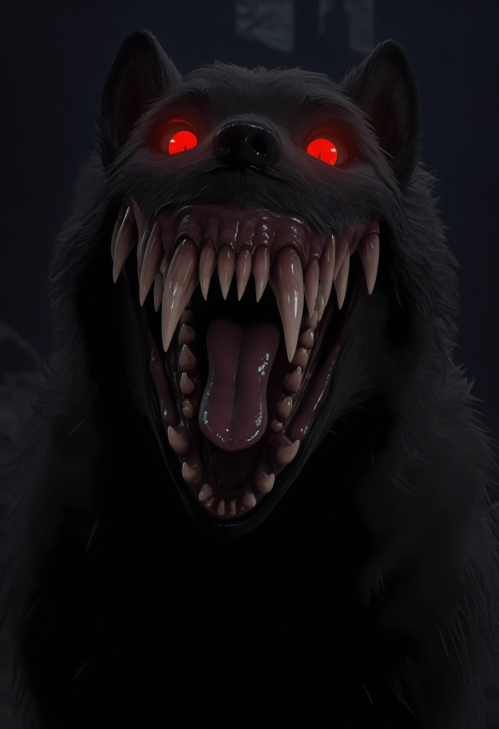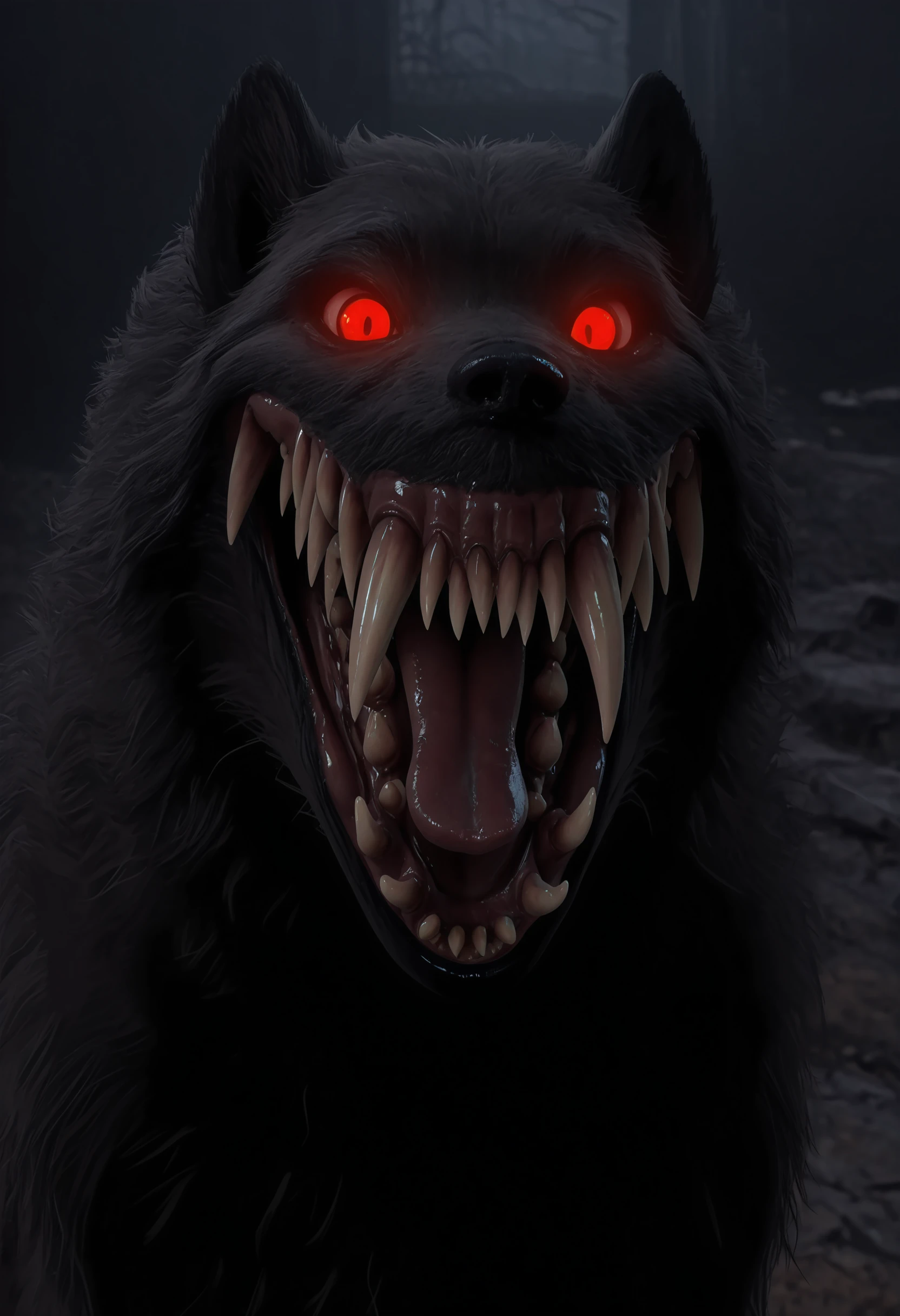 c0lilf, monster, sharp teeth, red eyes, glowing eyes, tail