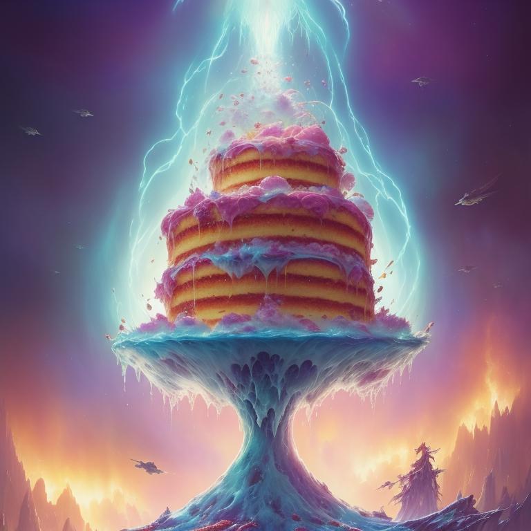 Jaw dropping image of a (sci-fi mothership) gushing with (dripping cake) by (greg rutkowski) style, medium format, fuji superia X-Tra 400, iso 4,000, perfectly octane rendered, pastel color palette, perfect composition, smooth, hard focus, ultra detailed, cinematic, highly detailed, ray traced shadows, 8 k, 1 6 k ,3 2 k, (FRUITFUSION:0.31):(BRTDRPP:0.14):(LIQUID SPLASH:1.2)