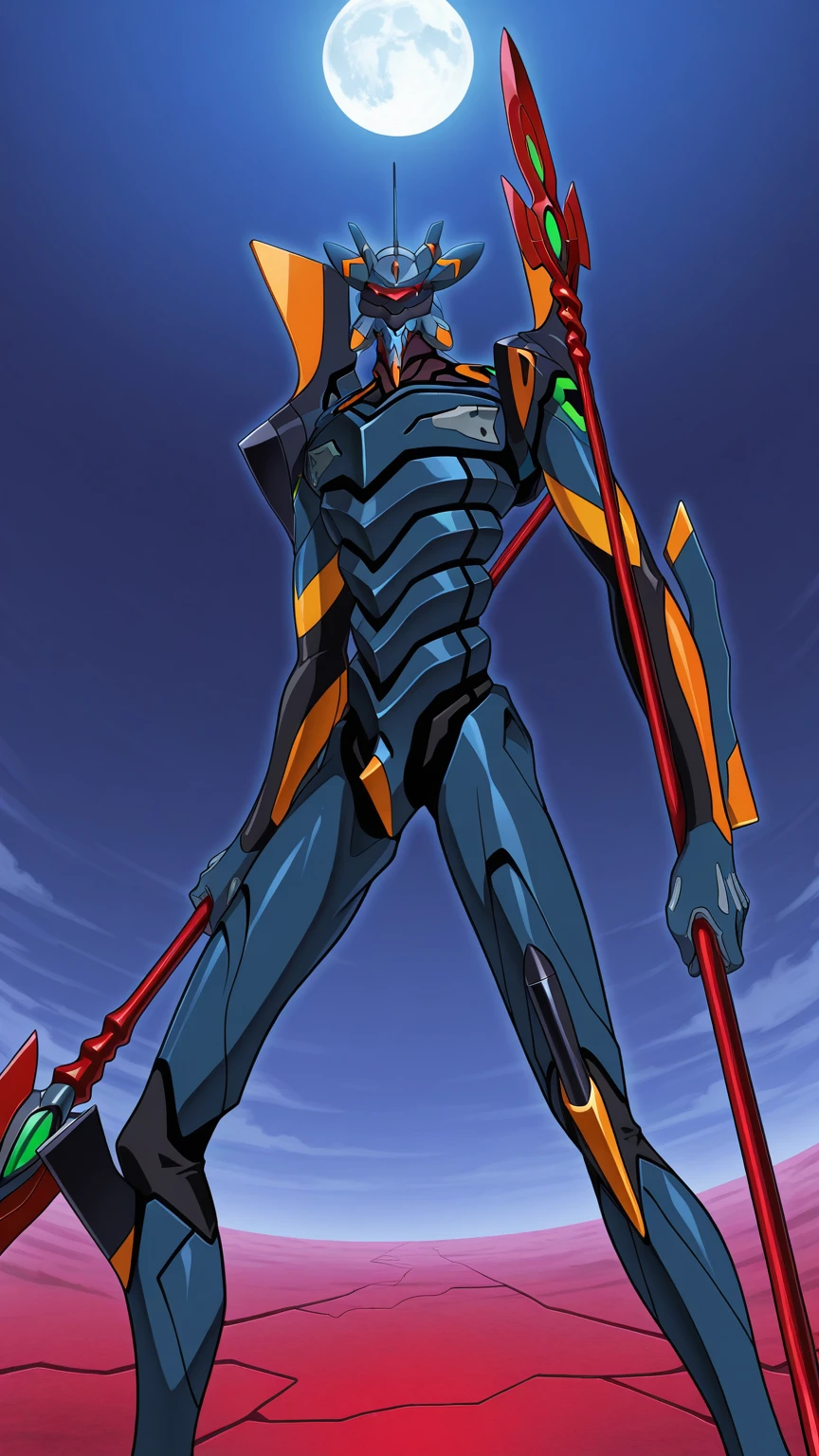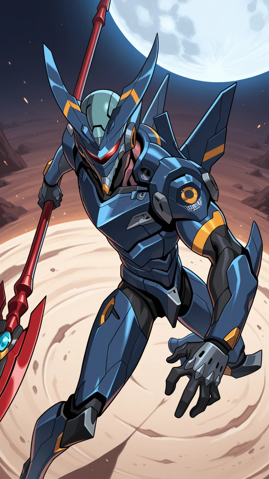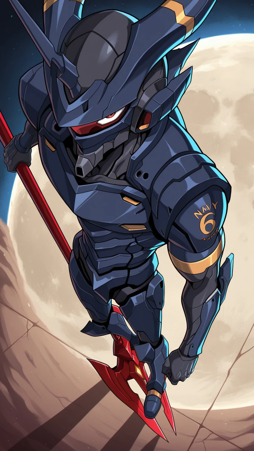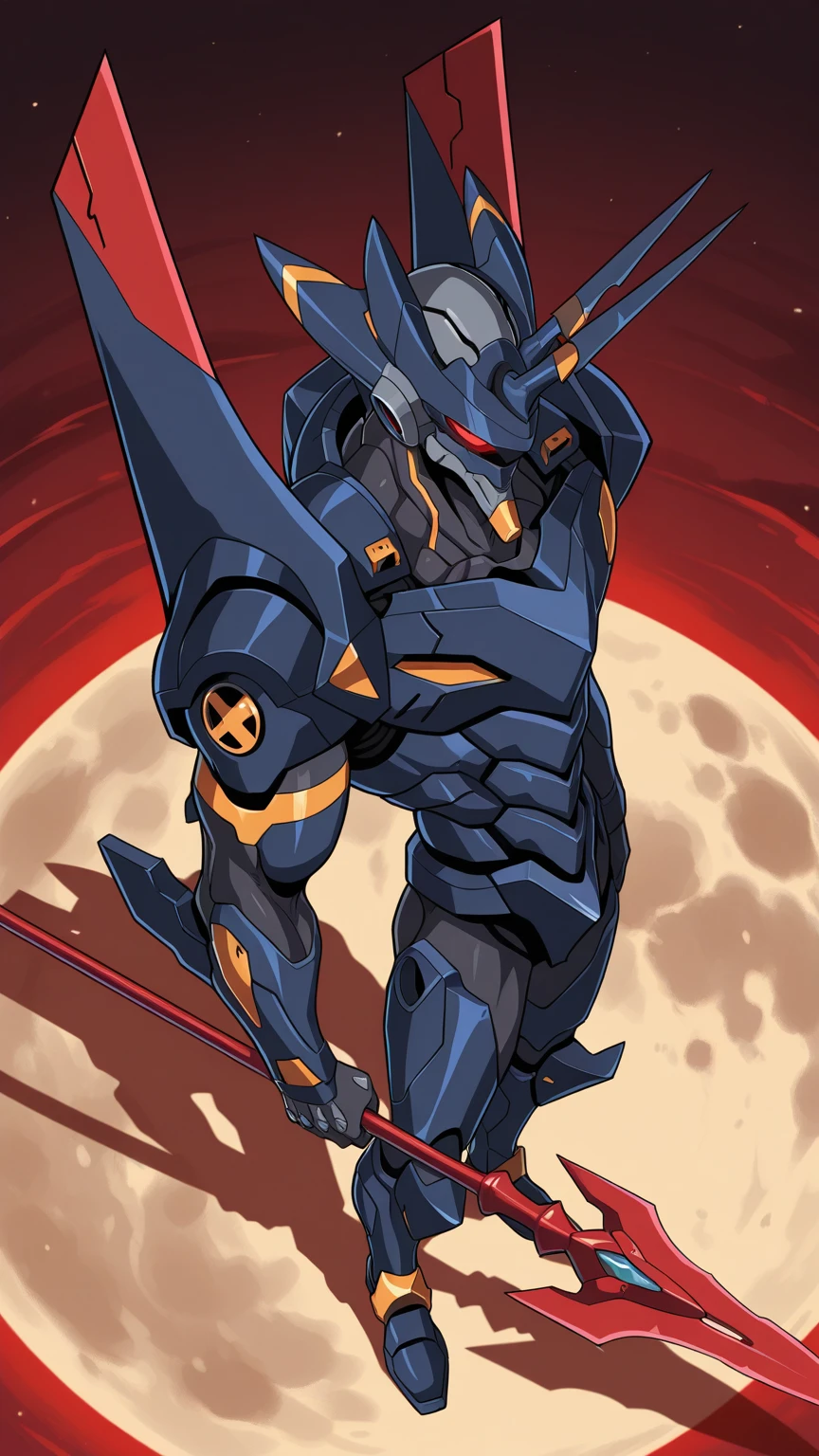 Mark06, evangelion unit, cyborg, navy blue armor, leg armor, arm armor, horns, shoulder pylons,
