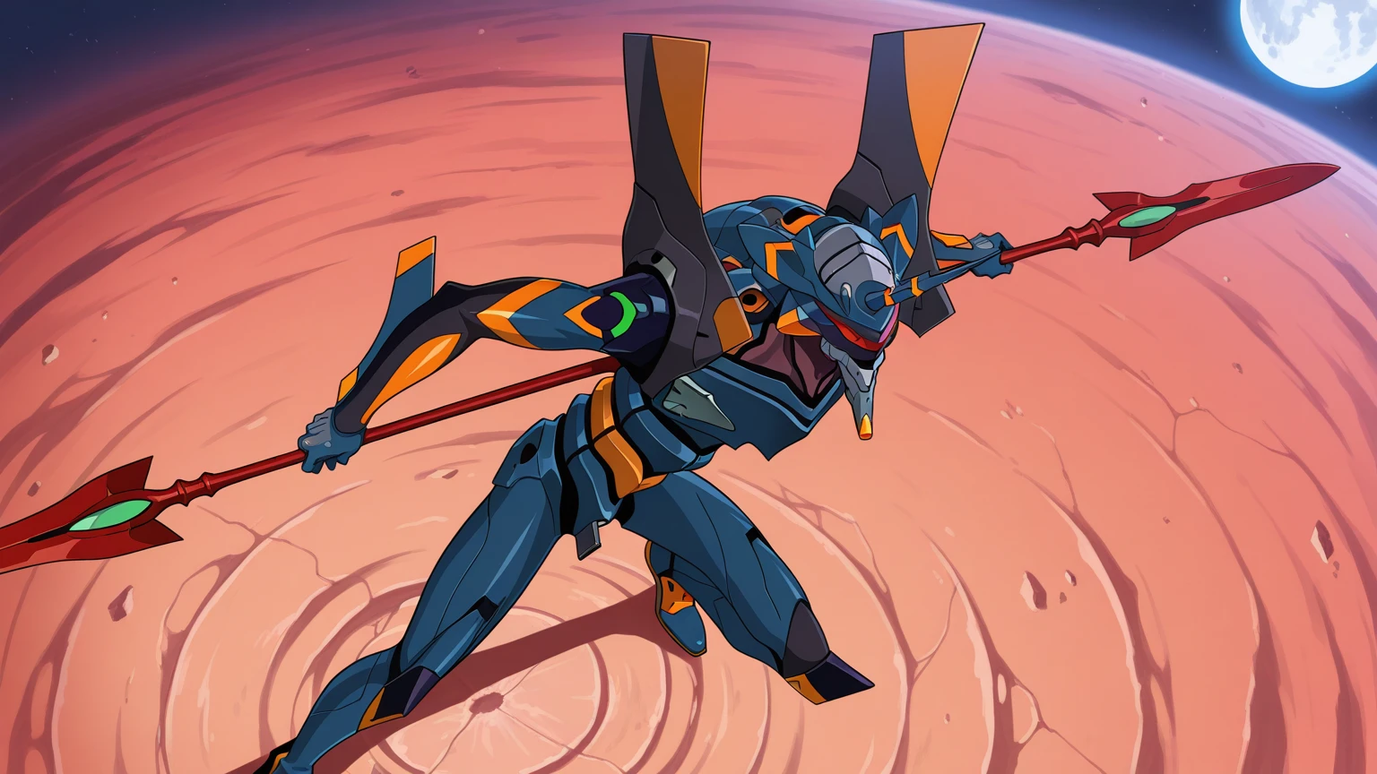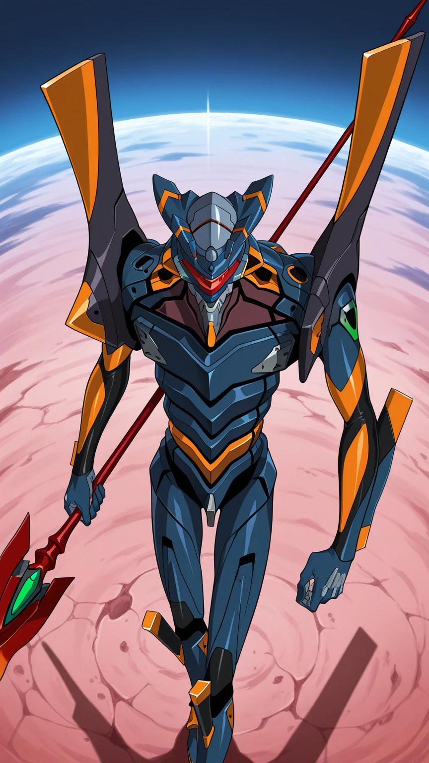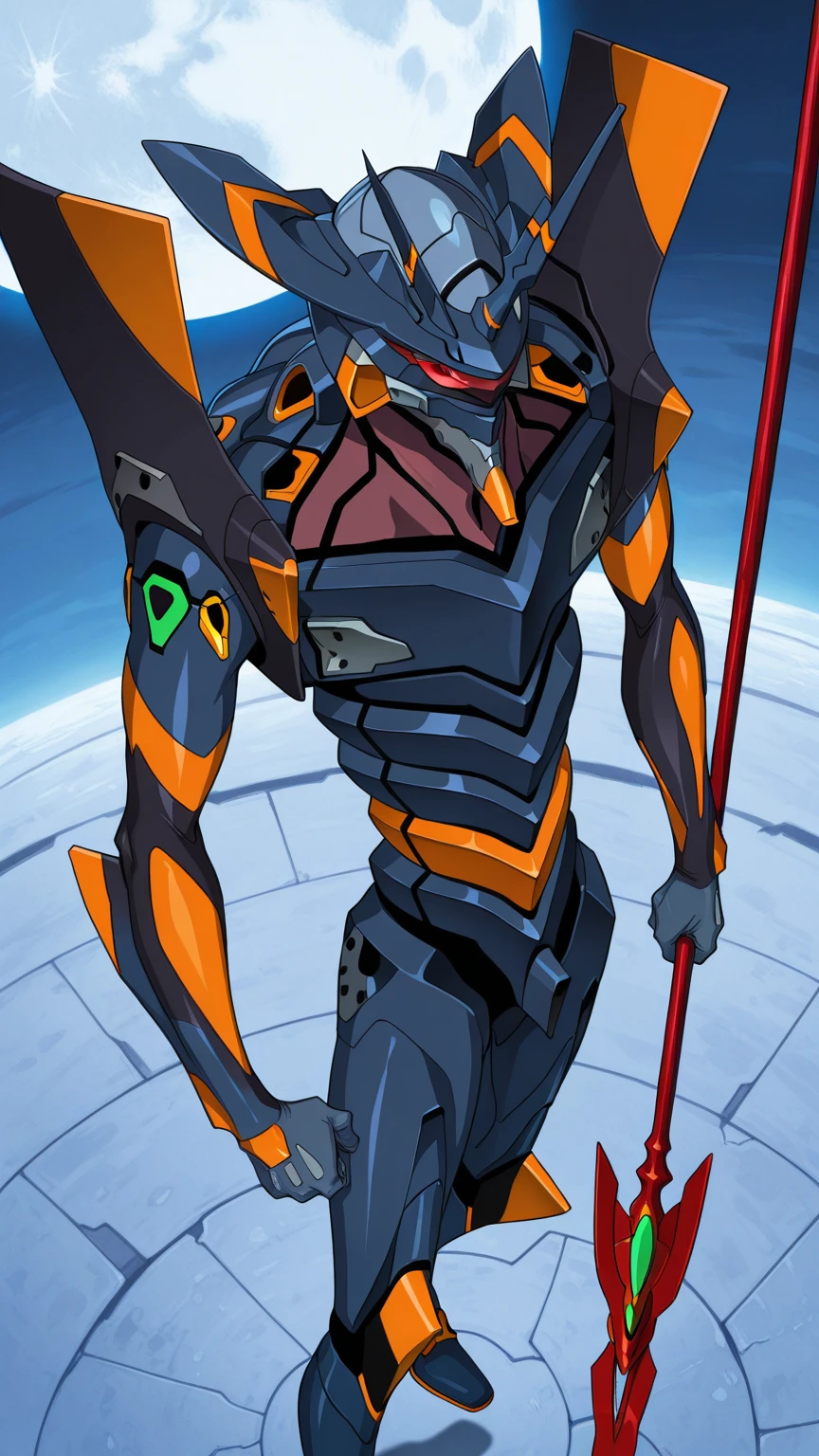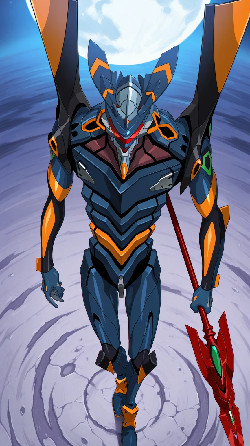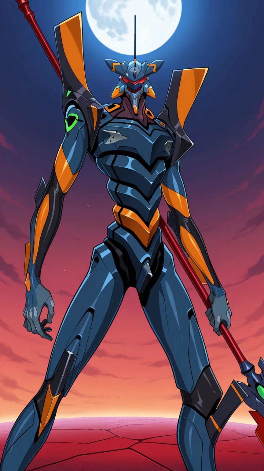 Mark06, evangelion unit, cyborg, navy blue armor, leg armor, arm armor, horns, shoulder pylons,