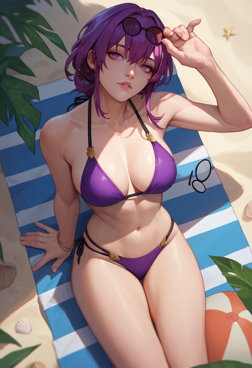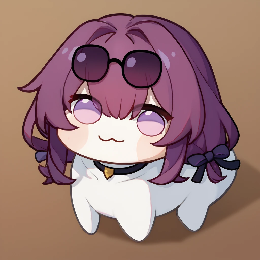 Trigger Words: kafker, purple hair, purple eyes, glasses on head, white shirt, harness, pink gloves, open jacket, black high-waist shorts, handkerchief, pink pantyhose, thigh strap