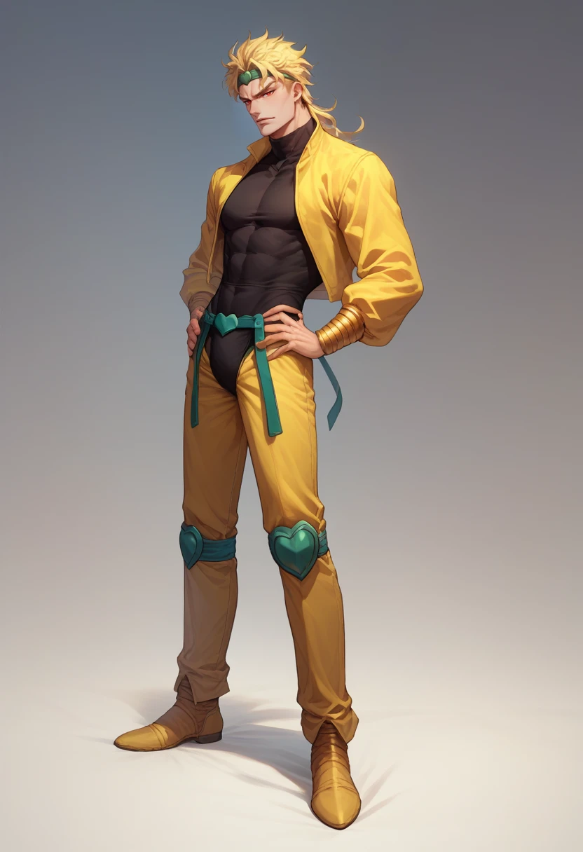 dioBrando, blonde hair, red eyes, headband, yellow jacket, sleeveless turtleneck leotard, yellow pants, knee pads, pointy footwear