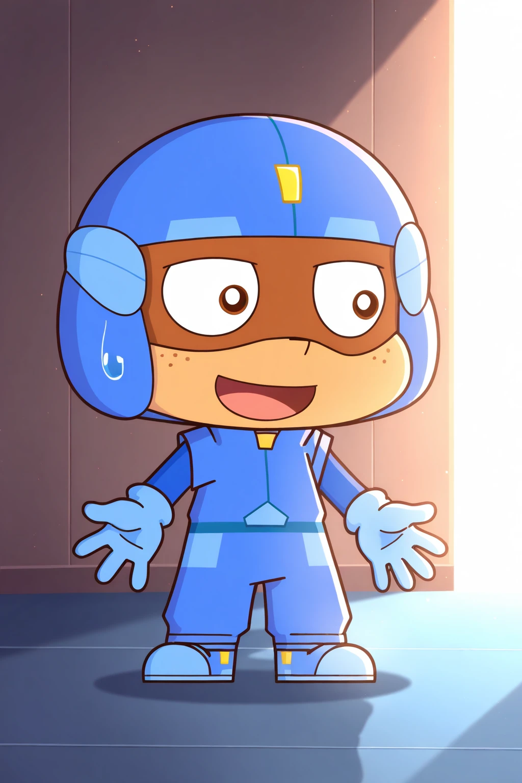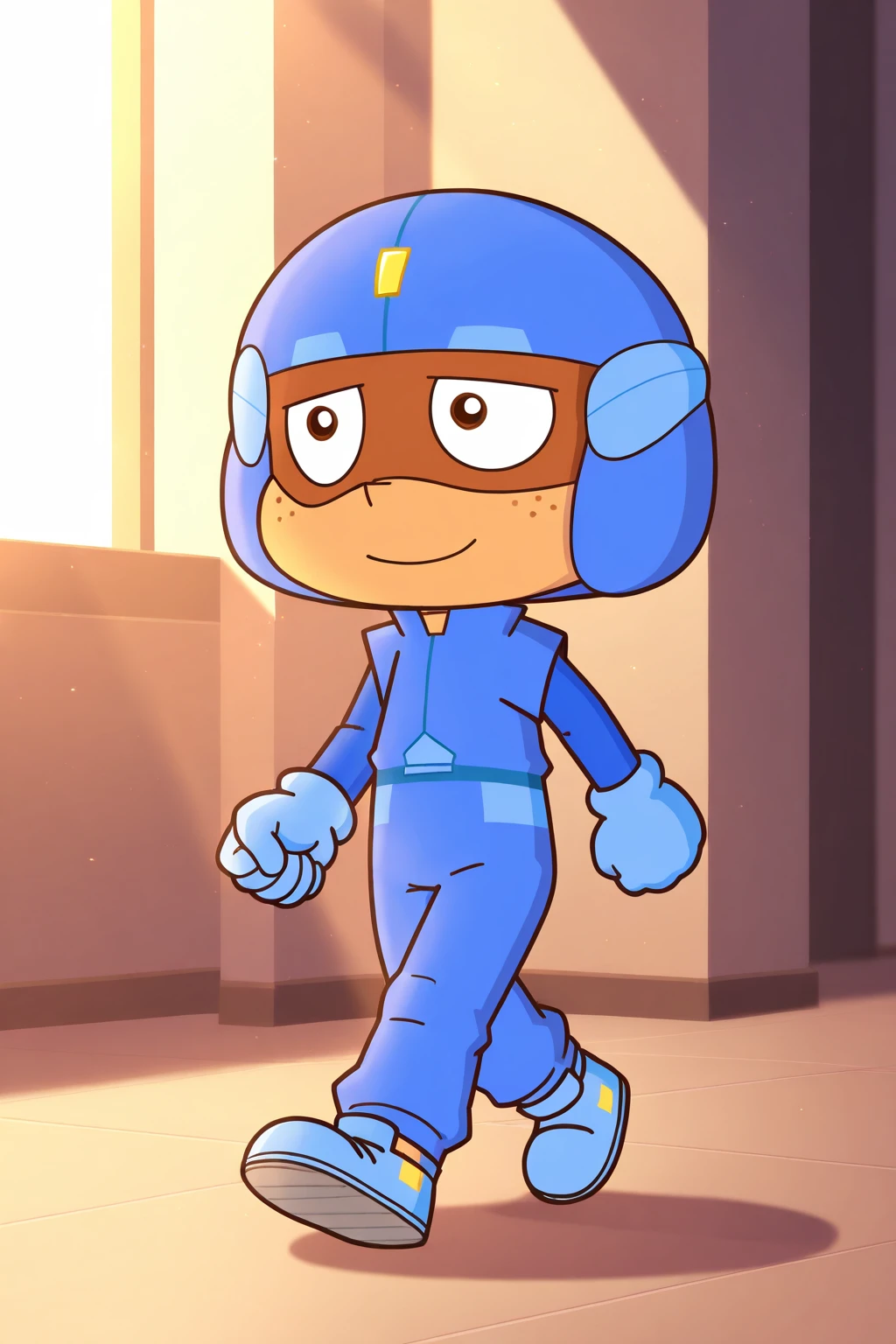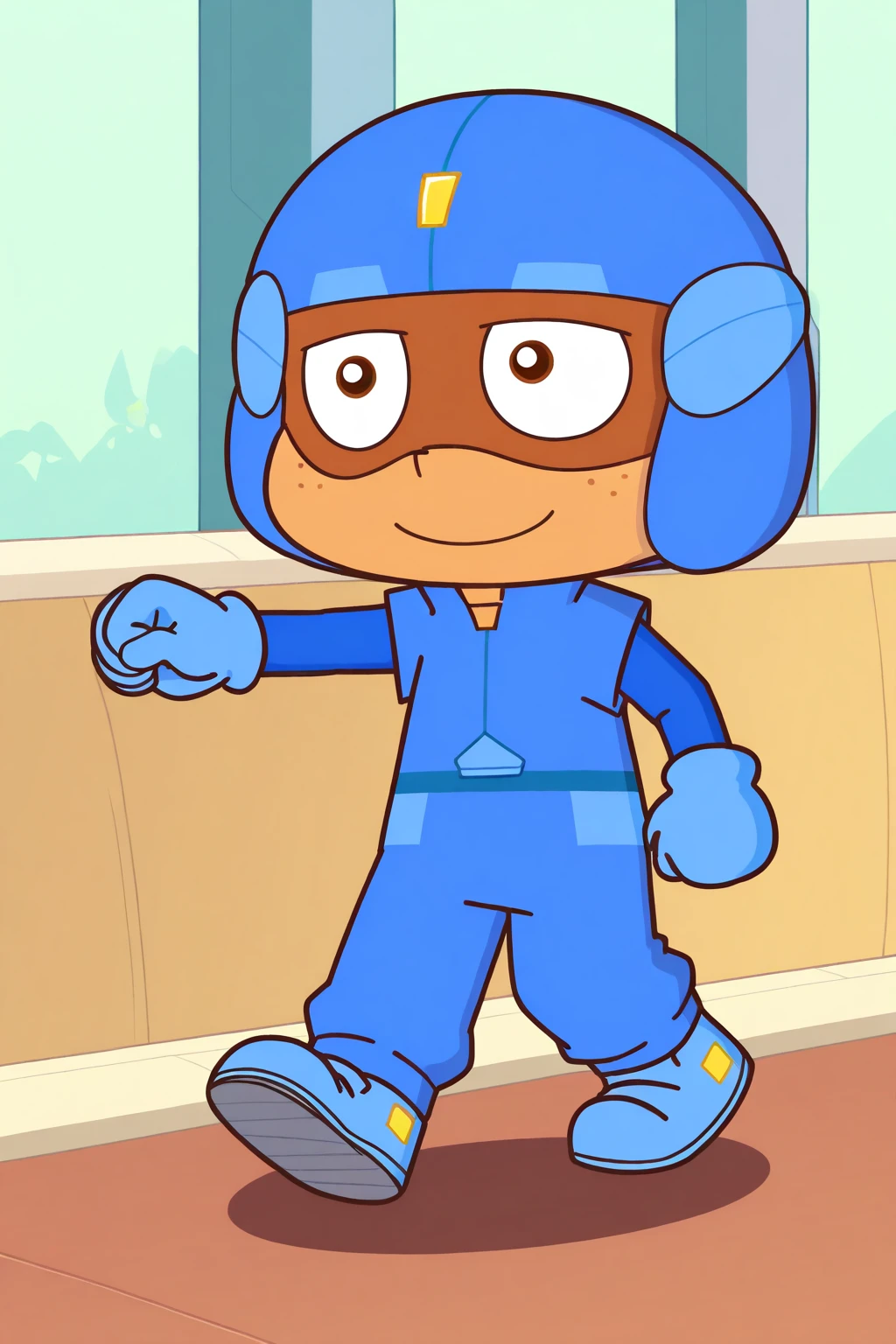 cuxin, brown eyes, blue helmet, blue long-sleeved coat, blue pants, blue gloves, blue shoes, helmet goggles, dark skin, freckles on face, anime thick lines anime black lines,1boy,