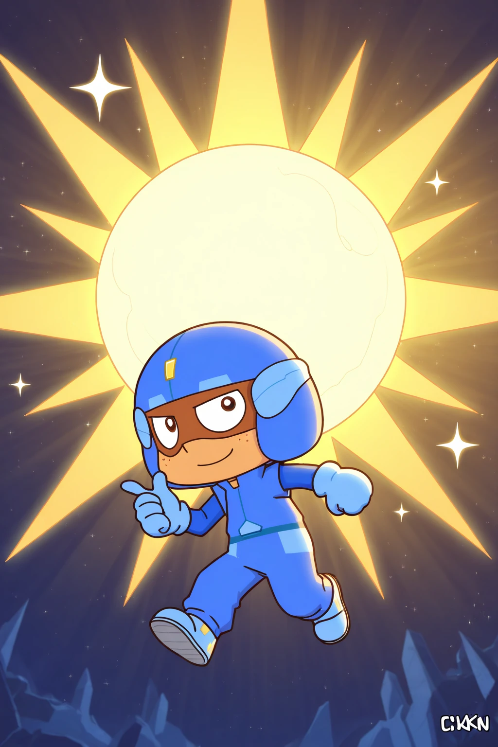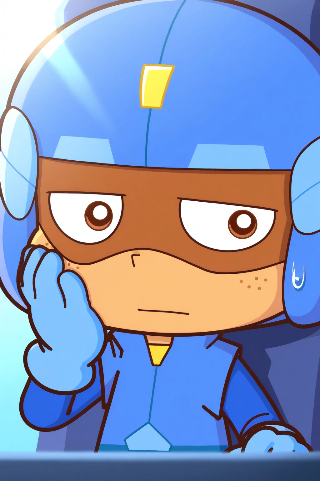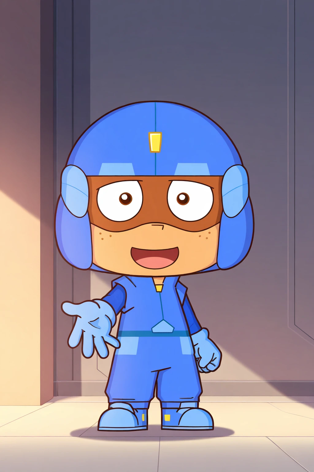 cuxin, brown eyes, blue helmet, blue long-sleeved coat, blue pants, blue gloves, blue shoes, helmet goggles, dark skin, freckles on face, anime thick lines anime black lines,1boy,