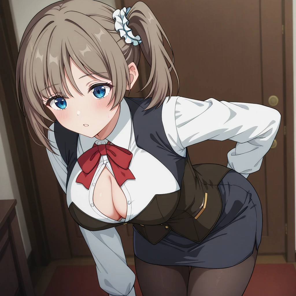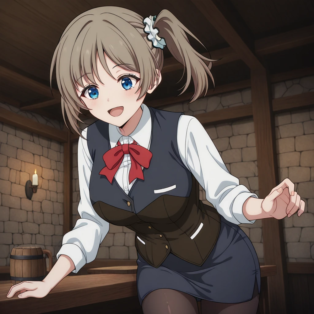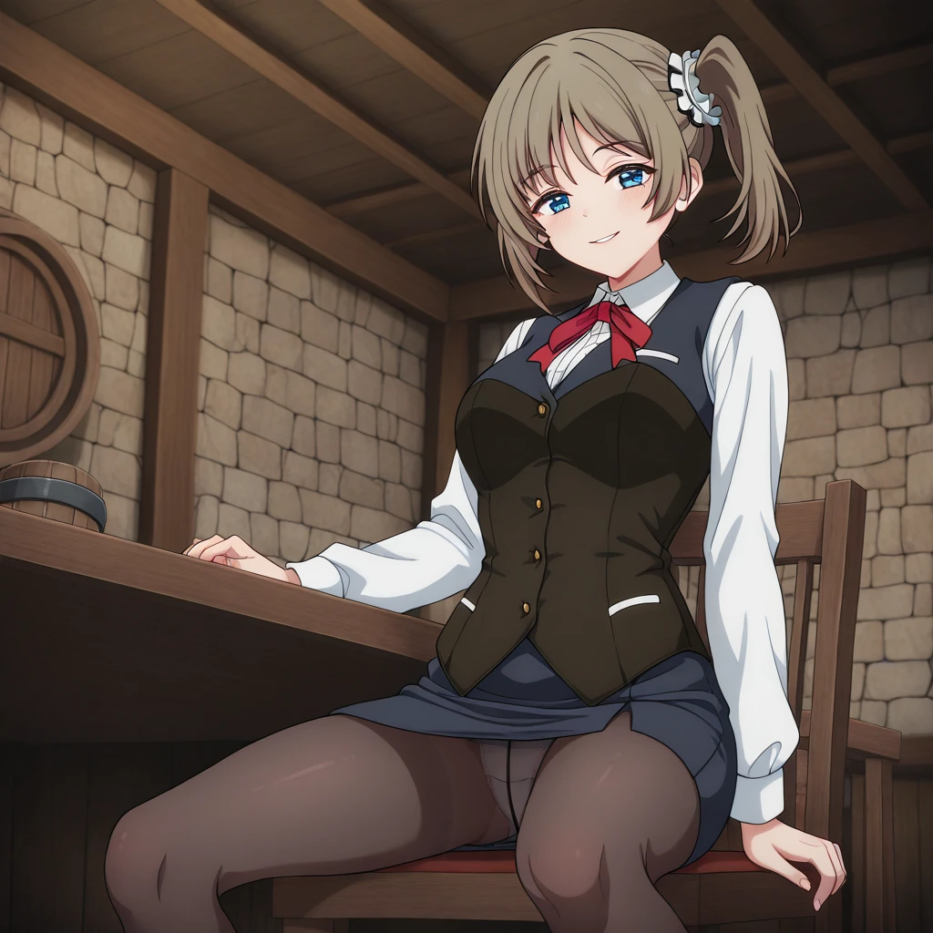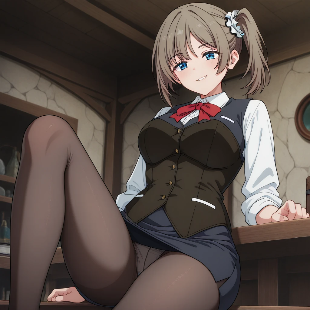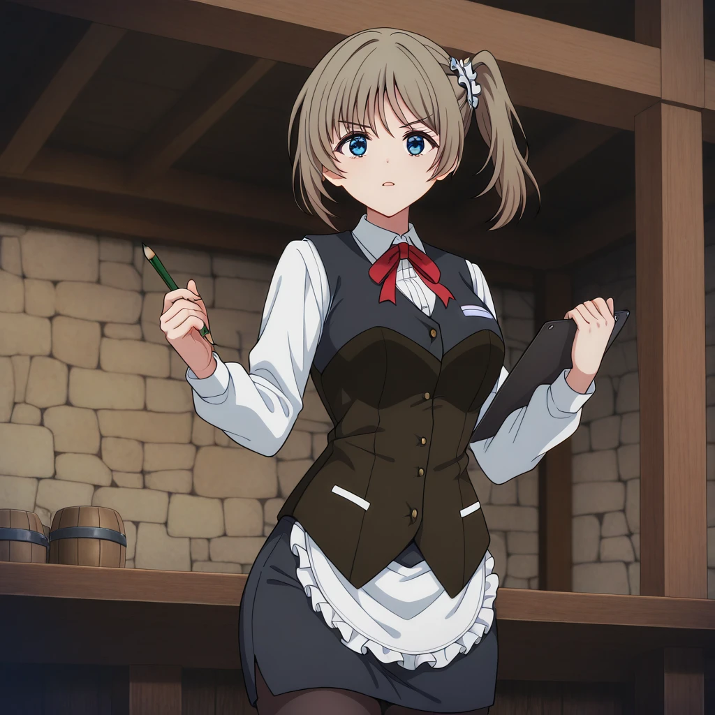 Uniform: (white collared shirt, vest, brown underbust corset, pencil skirt, pantyhose, red bow, waist apron)