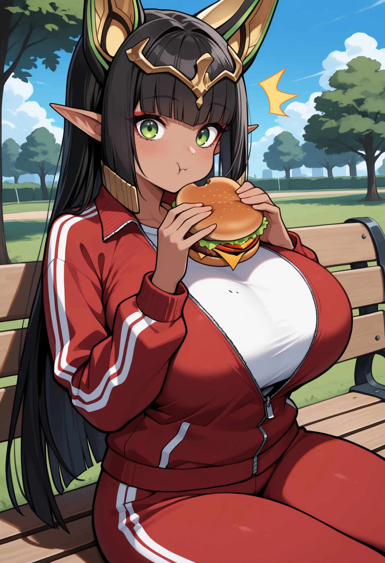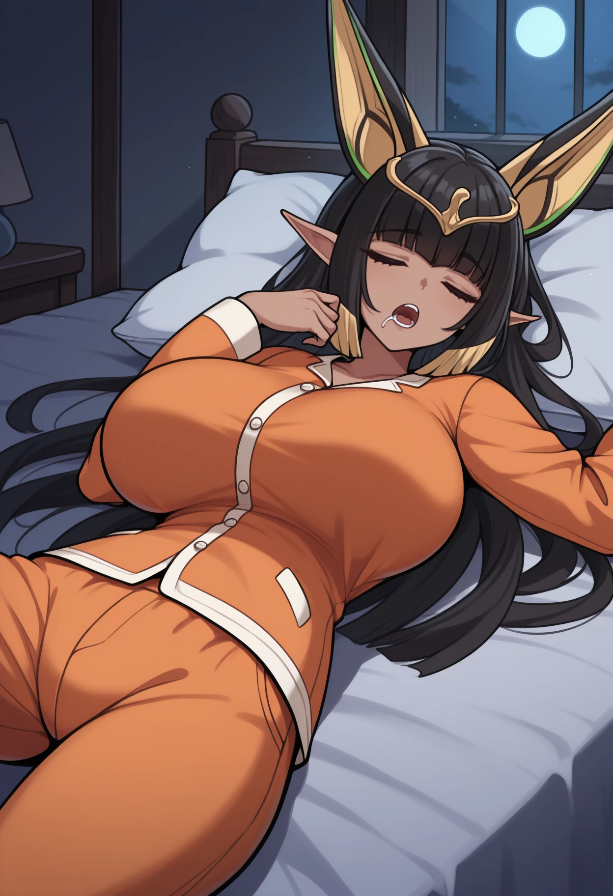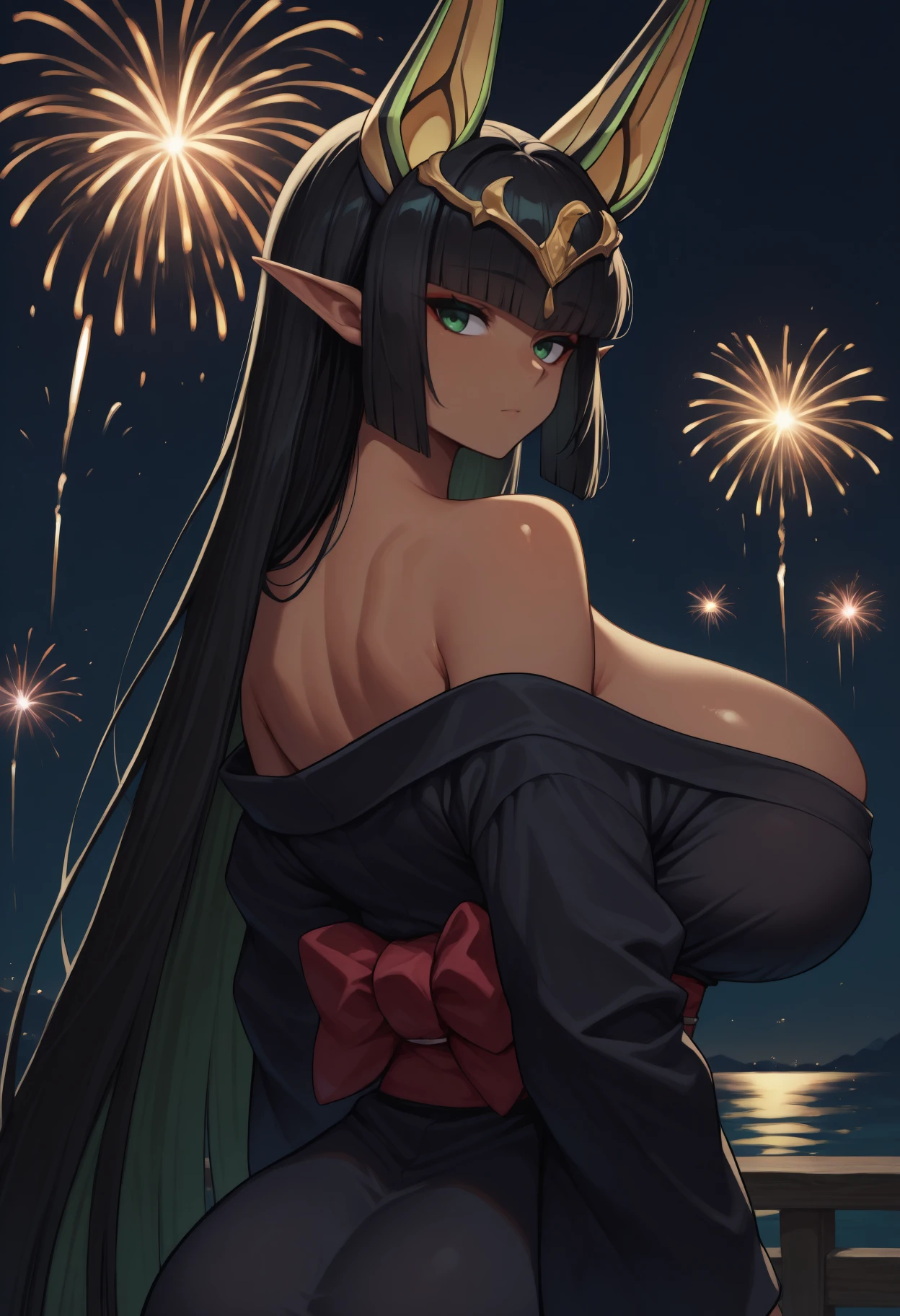 Trigger + Appearance: skmtdth, dark-skinned female, black hair, blunt bangs, hime cut, circlet, long pointy ears, jackal ears, green eyes, huge breasts
