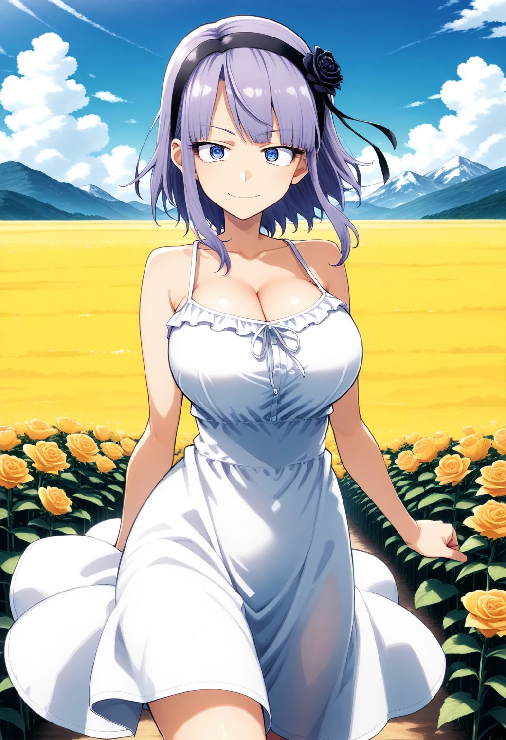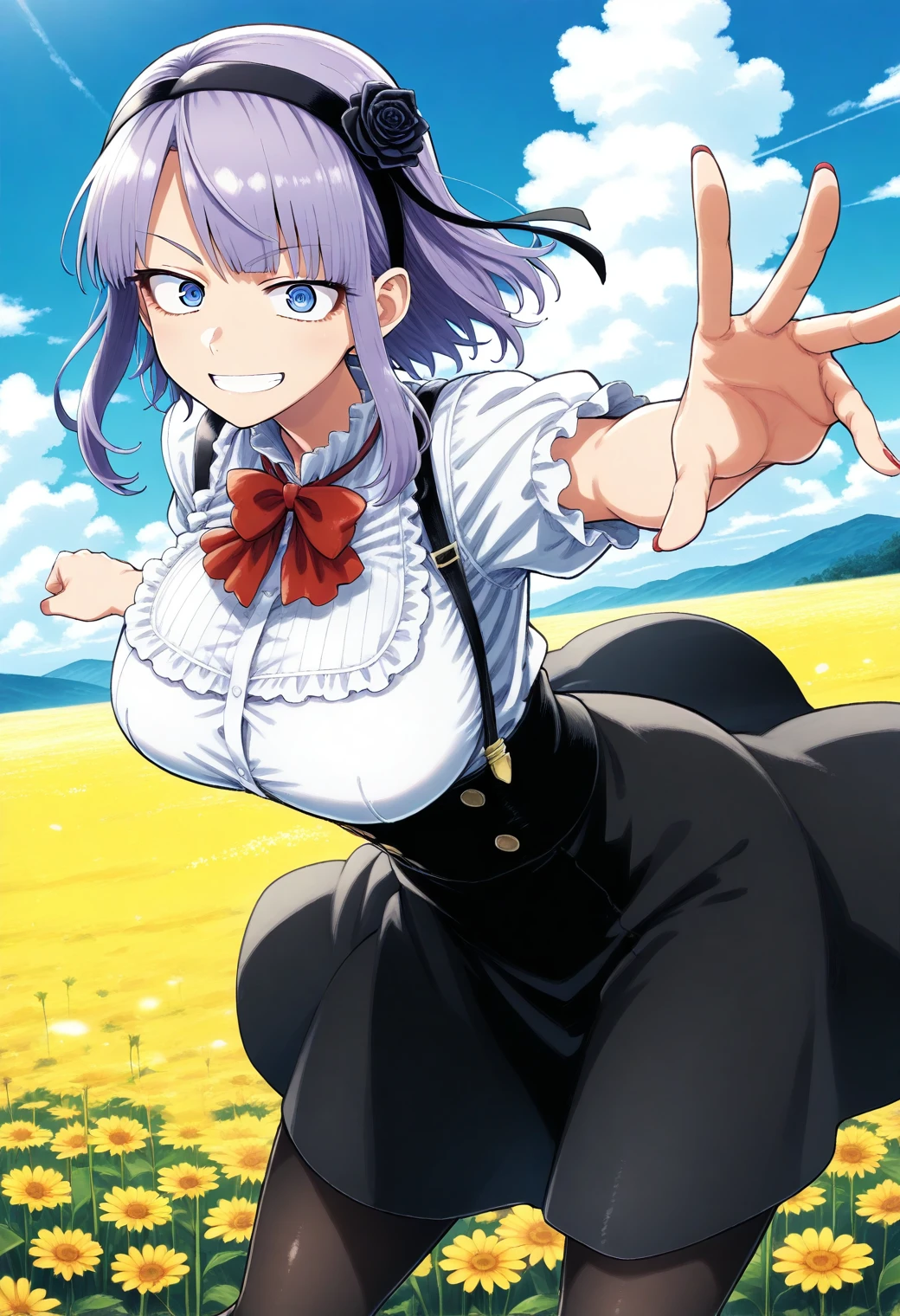 shidare_hotaru, blue eyes, ringed eyes, purple hair, short hair, hairband, hair ornament, rose, bowtie, frills, white shirt, suspender skirt, black skirt, pantyhose,