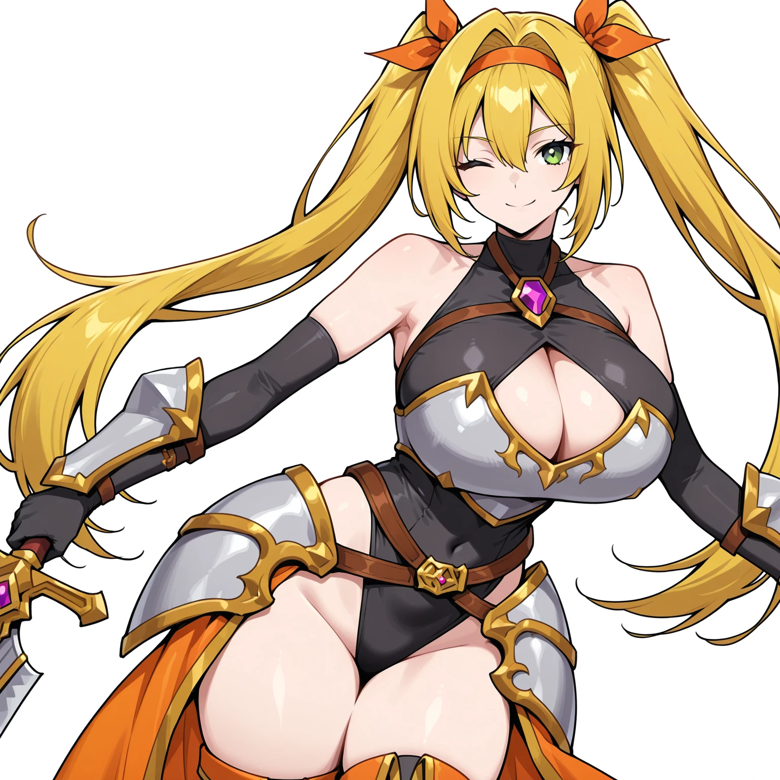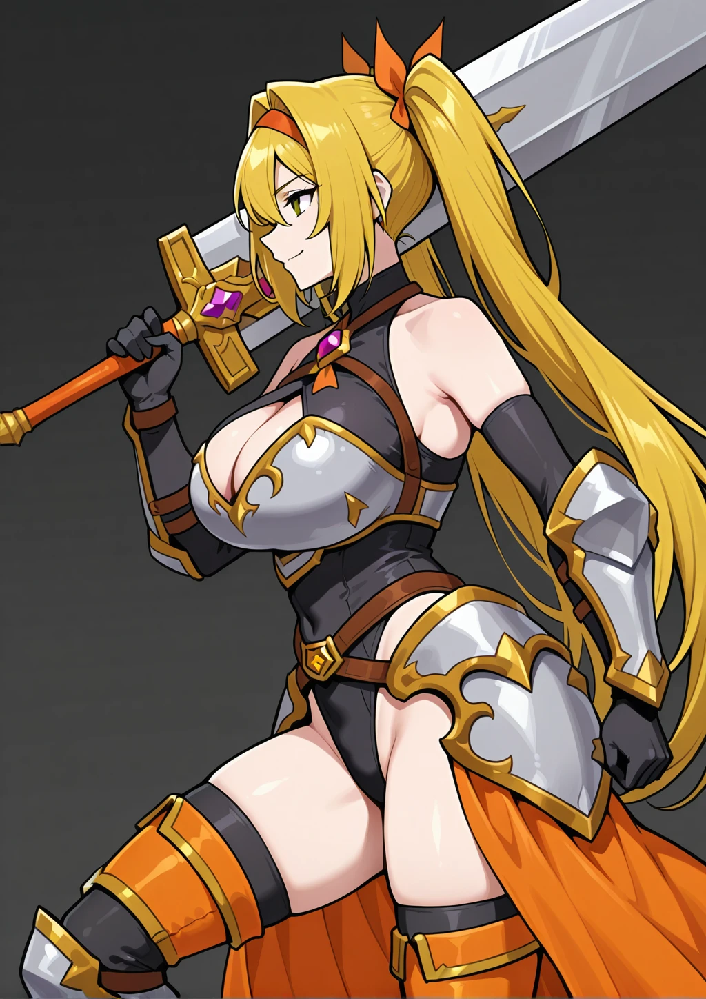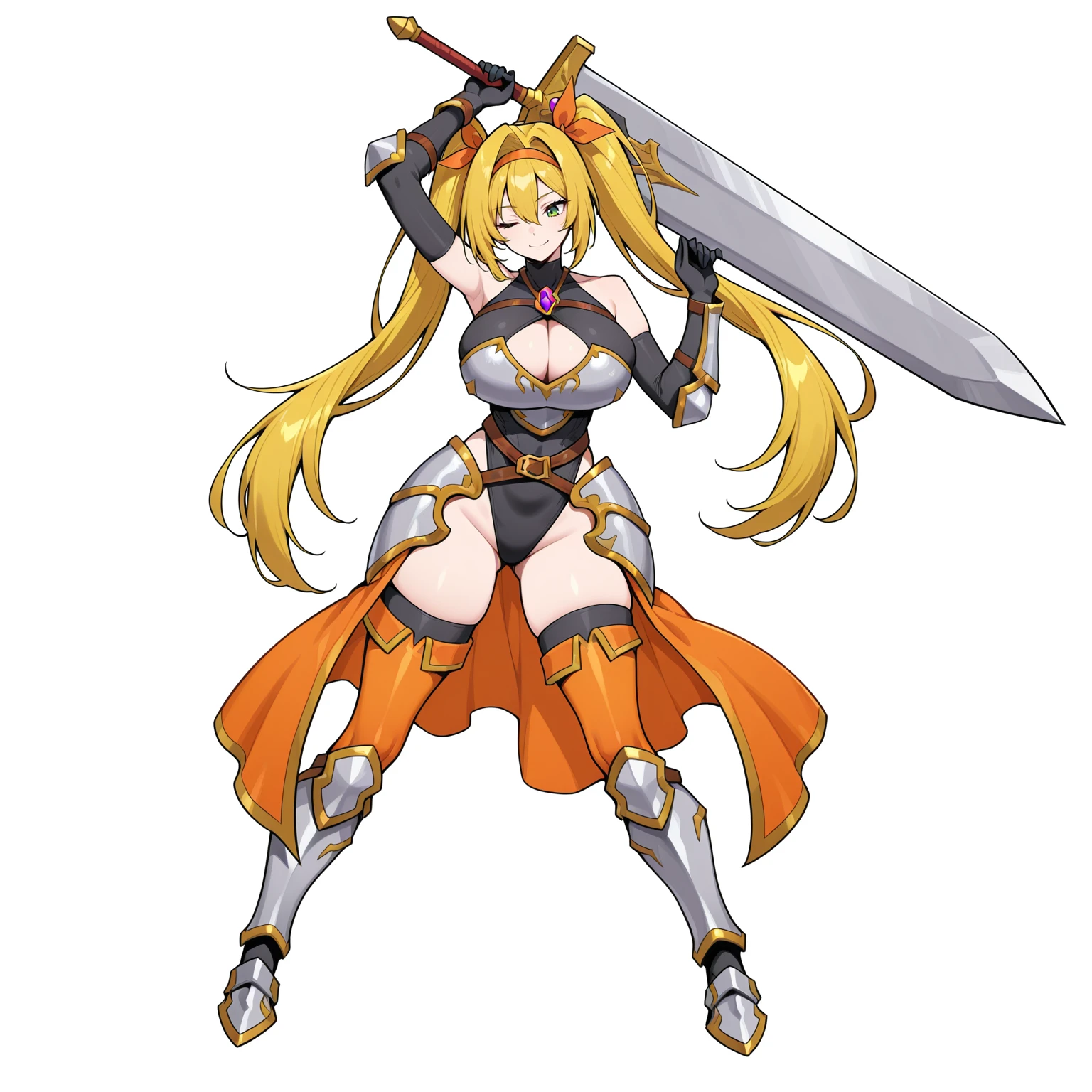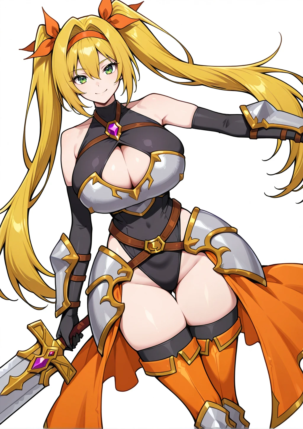 Shirley, long hair, twintails, blonde hair, hair intake, hair between eyes, green eyes, orange hairband, orange hair ribbon, black highleg leotard, cleavage cutout, black elbow gloves, black leather thighhighs, knight armor, gold trim, bare shoulders, breastplate, hip side armor, gauntlets, brown chest harness, purple chest jewel, brown belt, gold buckle, purple jewel on buckle, orange legwear, armored boots, orange showgirl skirtDescription