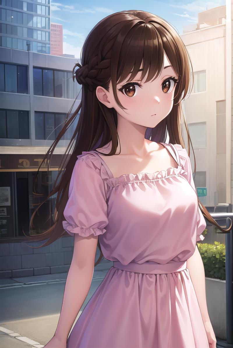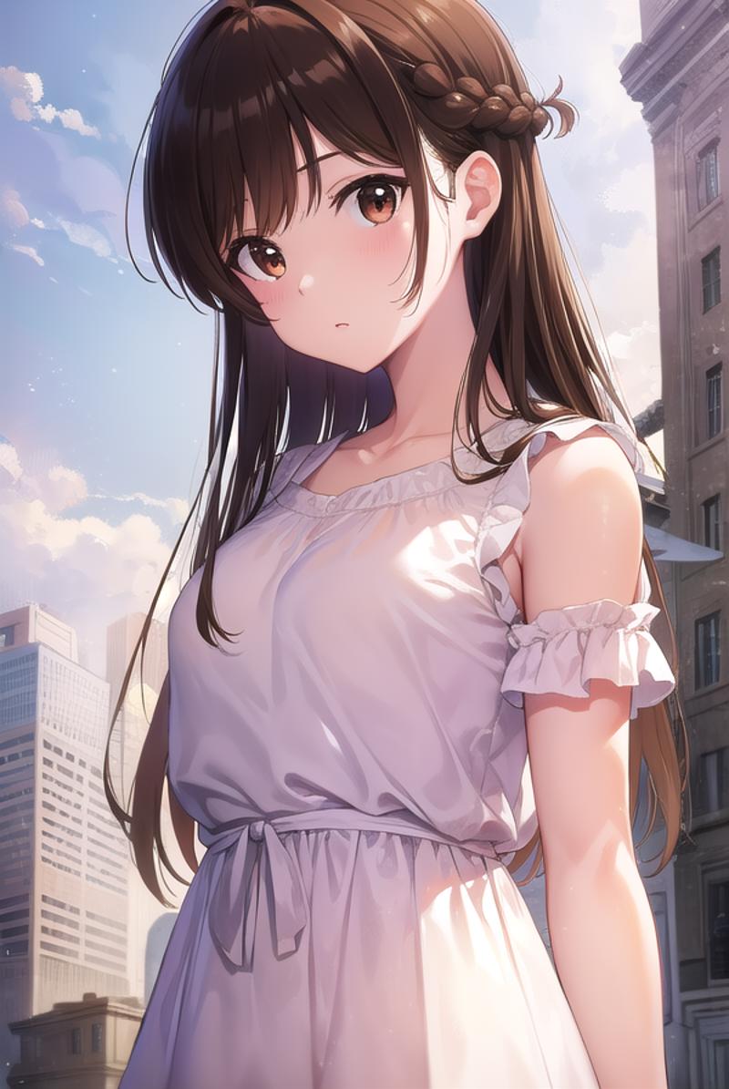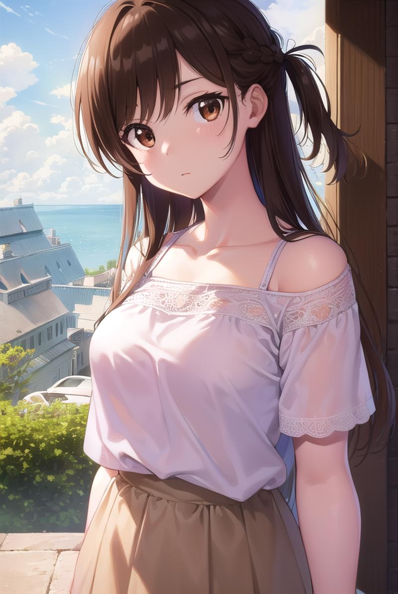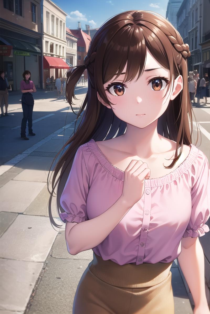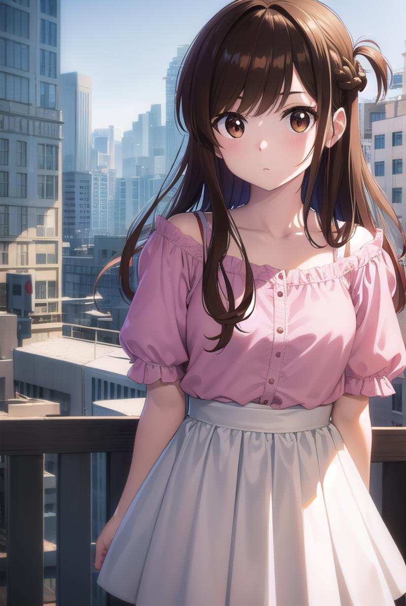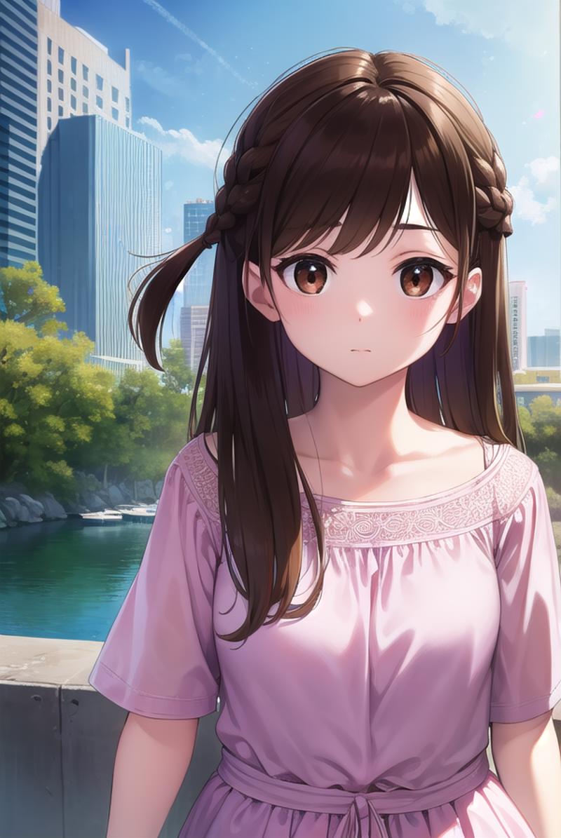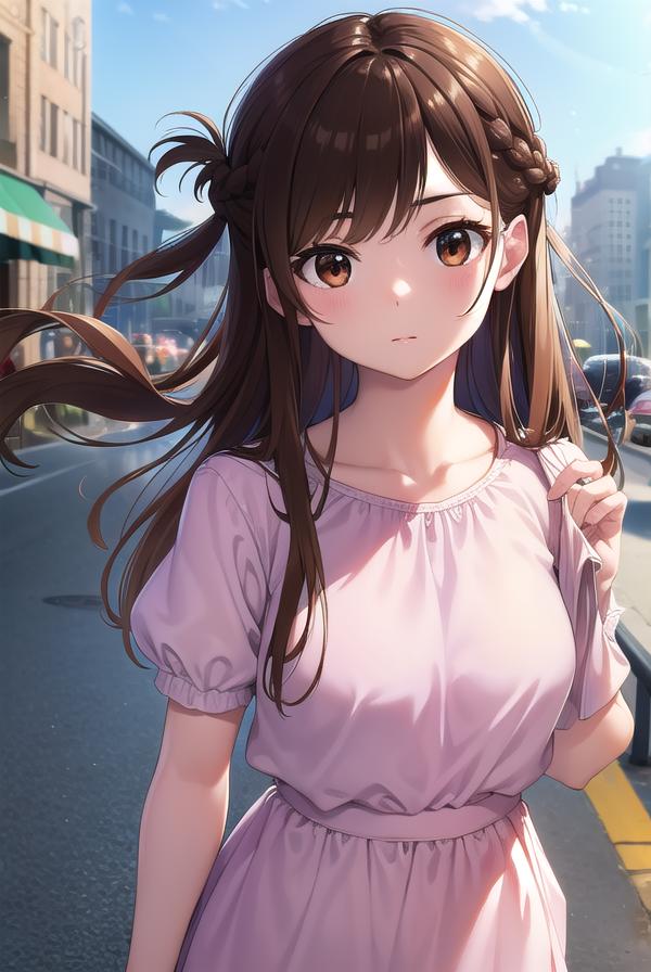 mizuhara chizuru, long hair, brown hair, (brown eyes:1.7), (one side up:1.5), bangs, braid, hair braid,