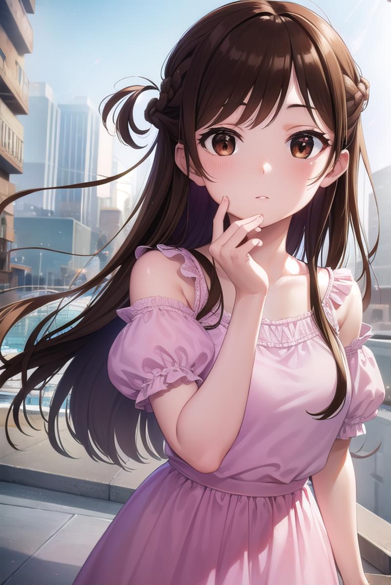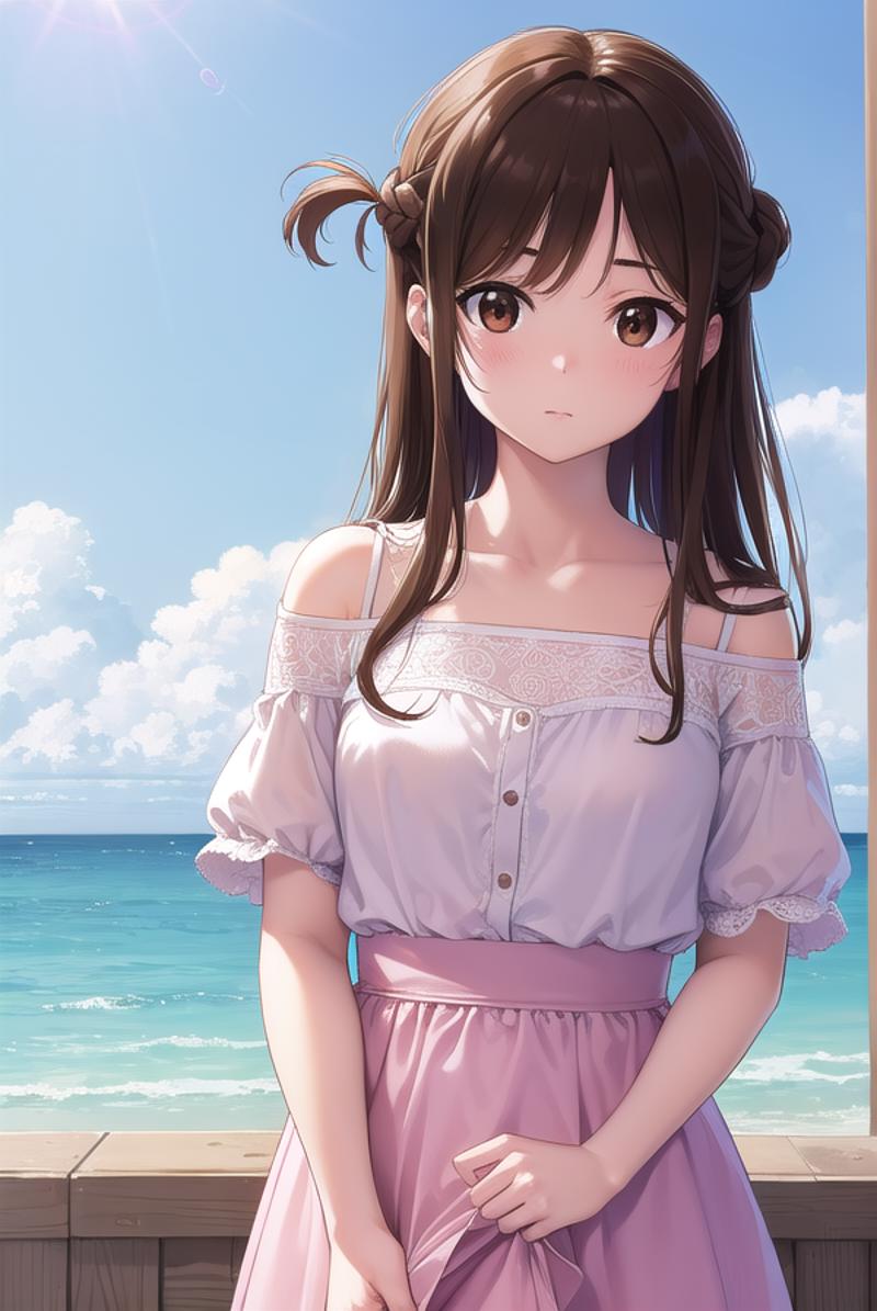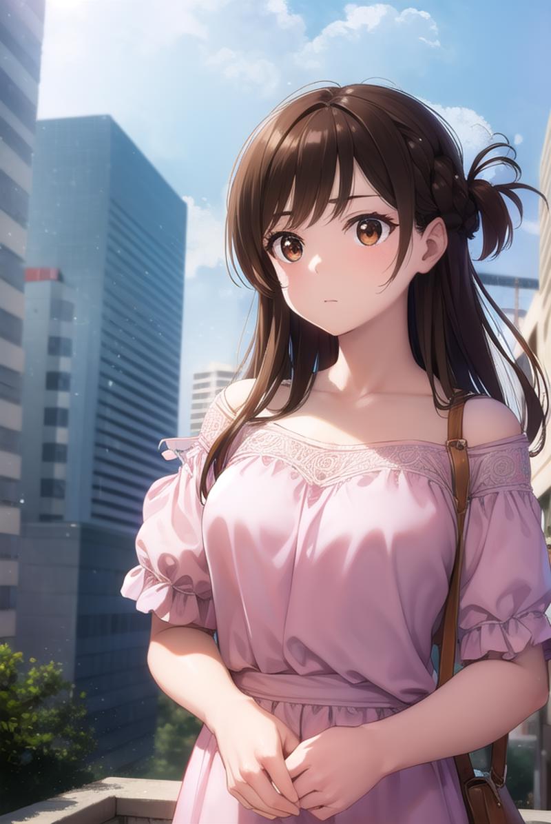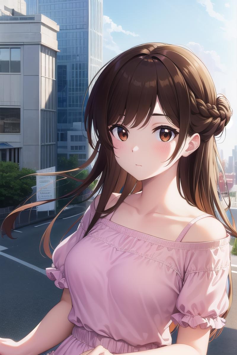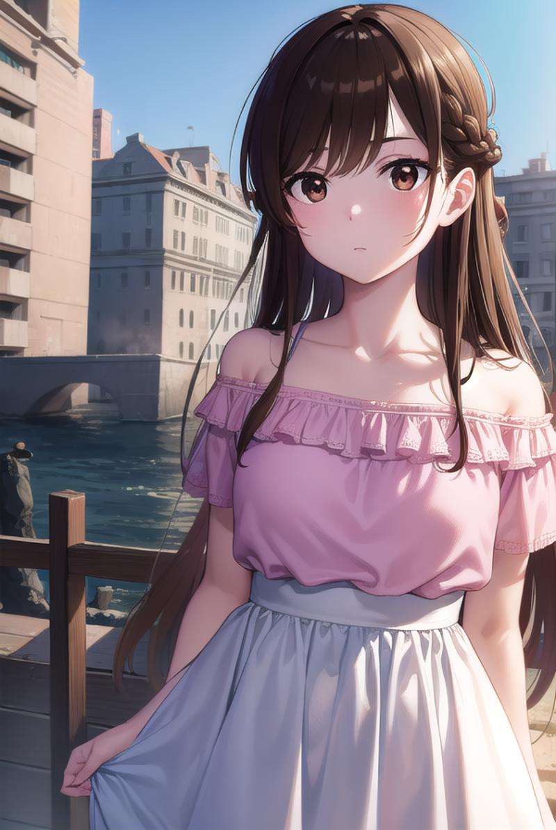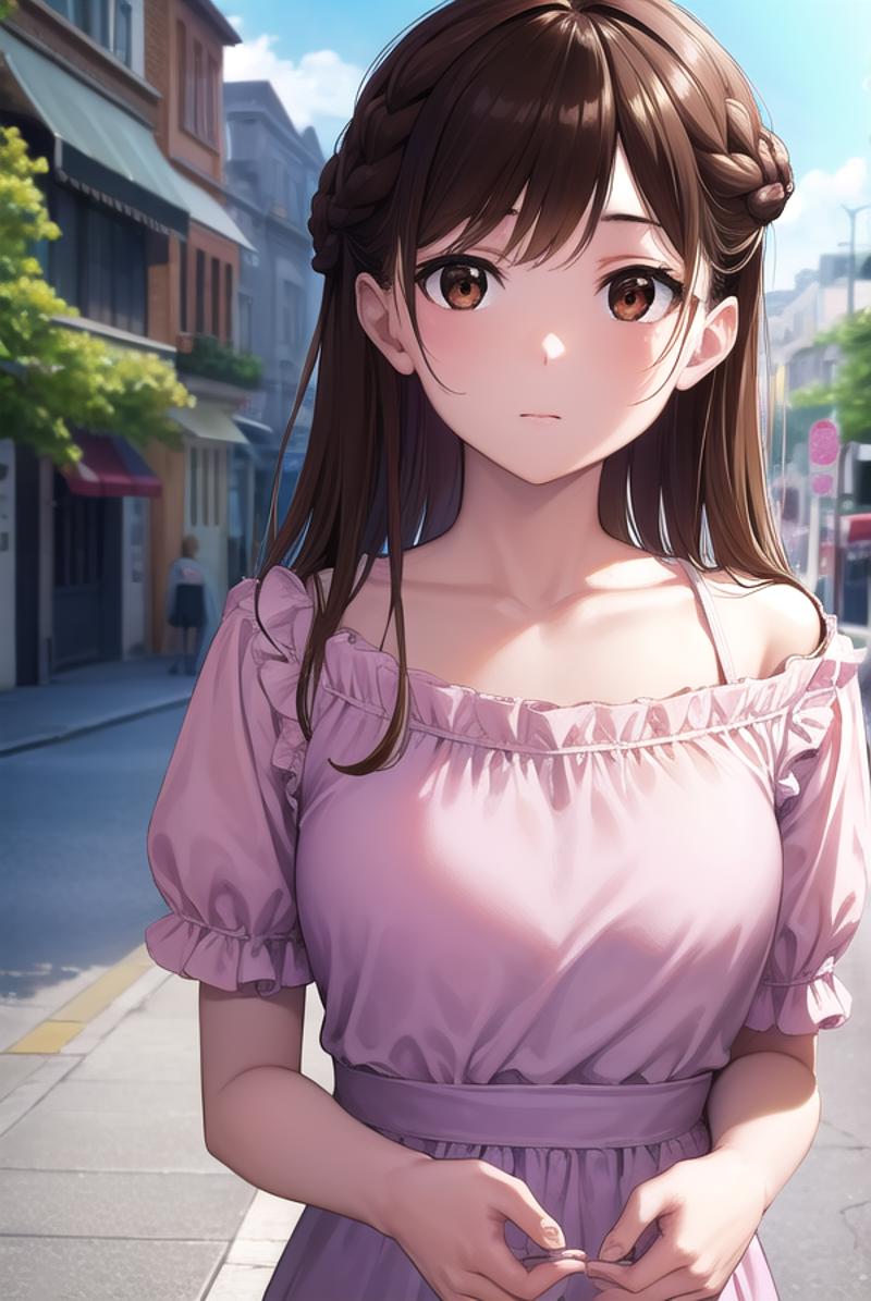 mizuhara chizuru, long hair, brown hair, (brown eyes:1.7), (one side up:1.5), bangs, braid, hair braid,
