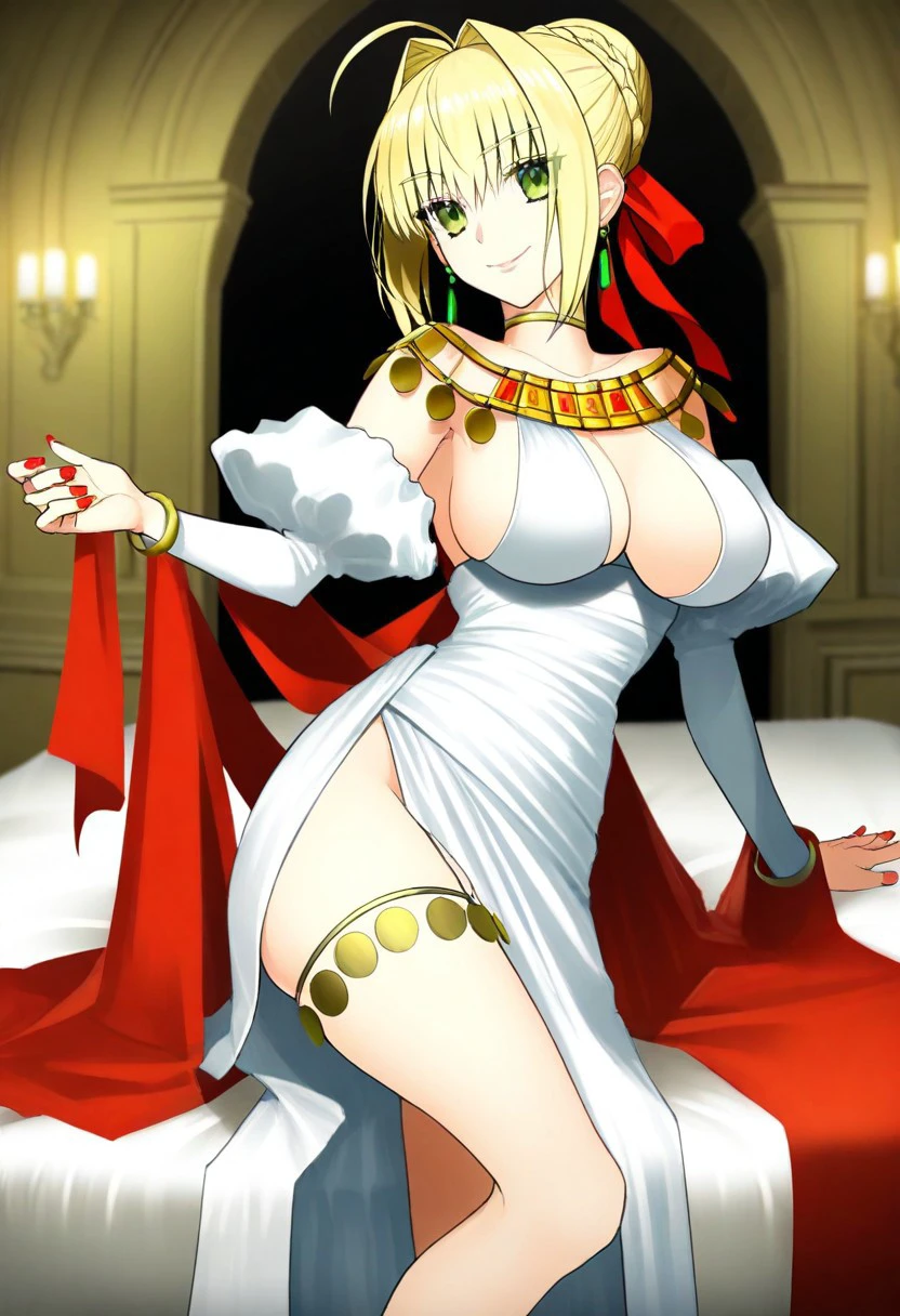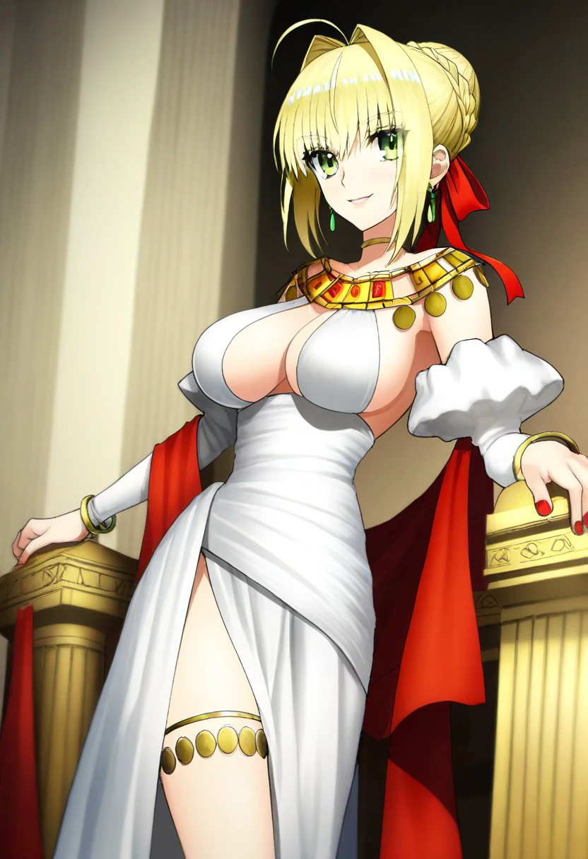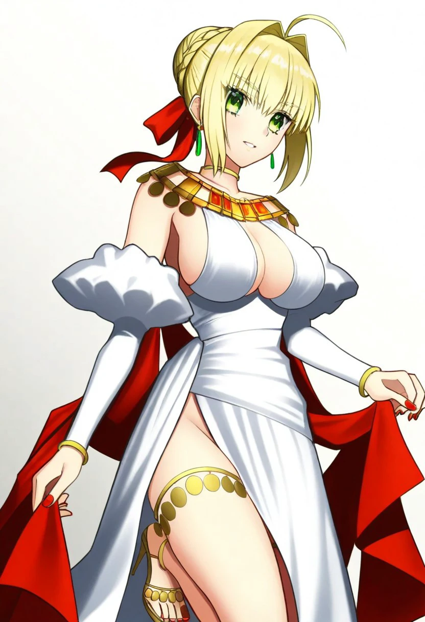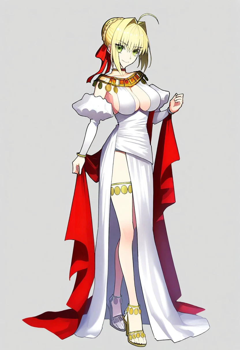 greco-roman clothes, dress, white dress, long dress, bare shoulders, cleavage, sideboob, side slit, juliet sleeves, puffy sleeves, puffy detached sleeves, detached sleeves, long sleeves, jewelry, bracelet, choker,